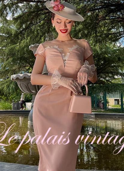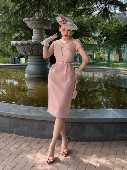 Le Palais Vintage Luxury 50s Pink Lace Panel Slim Fit Dinner Dress-Daisy.