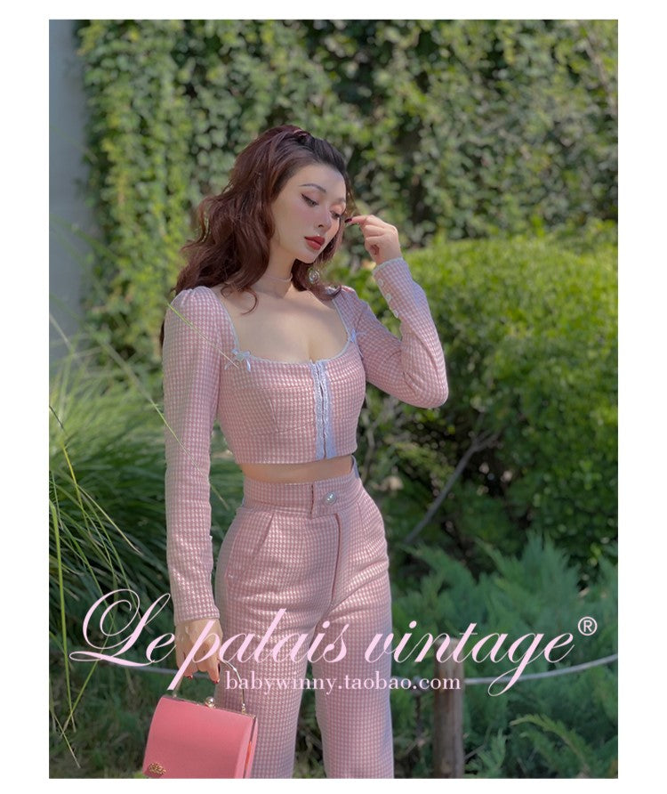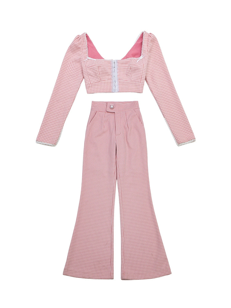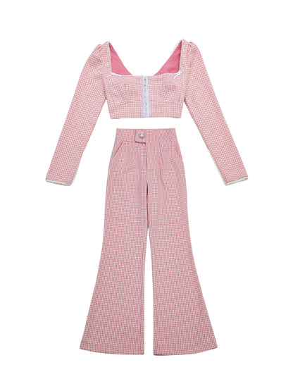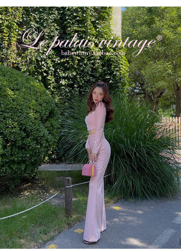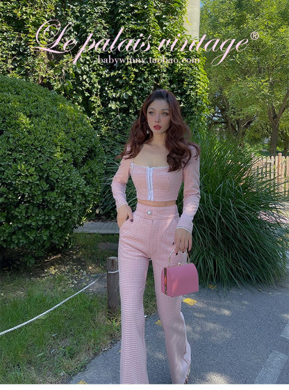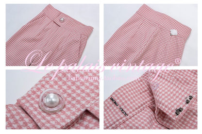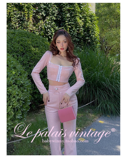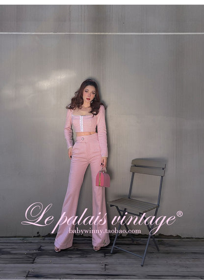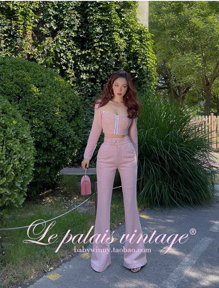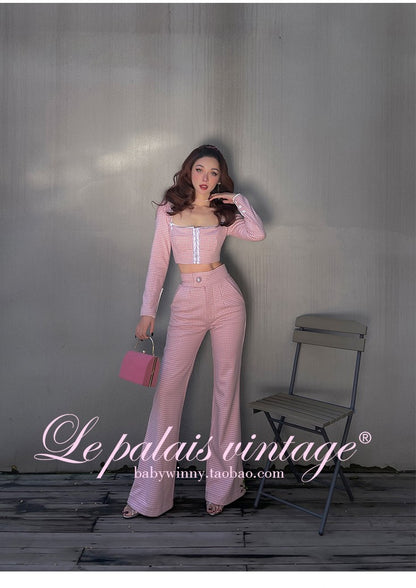 Le Palais Vintage Pink Tweed Long Sleeves High Waist top Pants-Lara