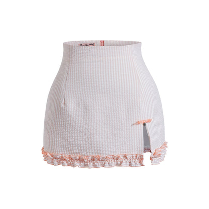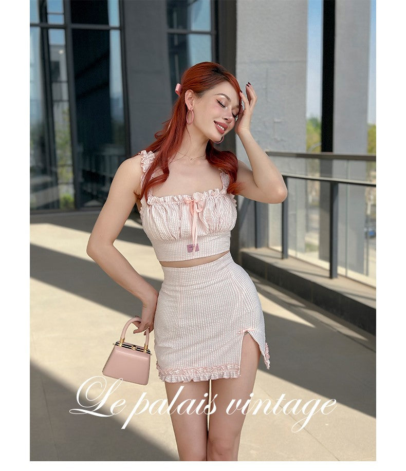 Le Palais Vintage Luxury Pink Striped Lace Crop Suspenders High Waist Short Skirt-Katie