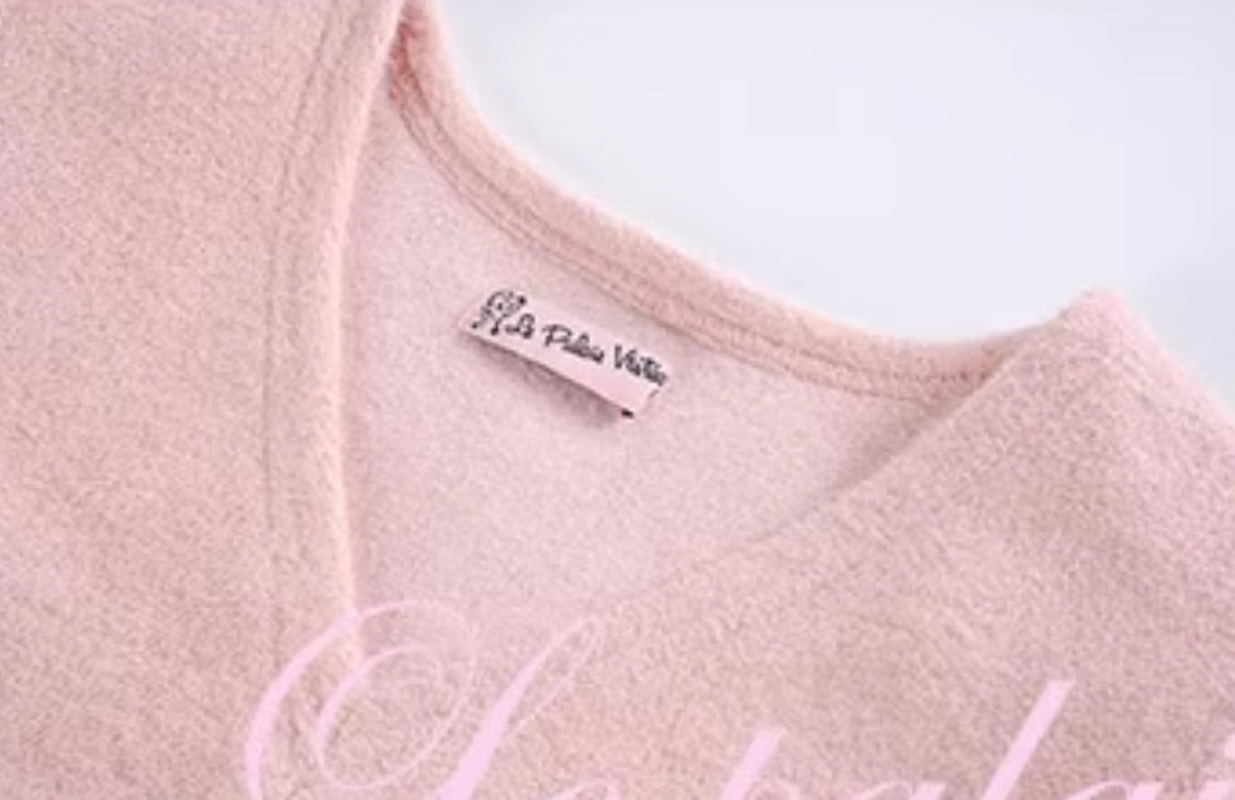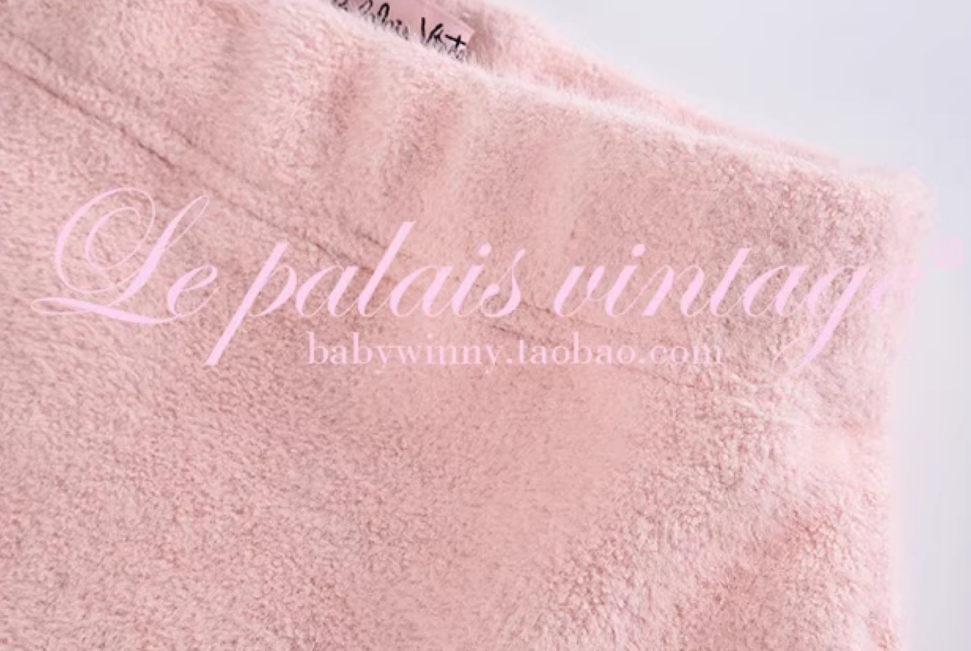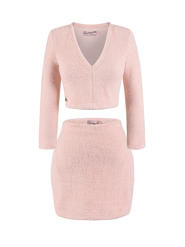Le Palais Vintage Luxury Two Piece V-neck Top Pink Plush Handbag Short Skirt Suit-Lora