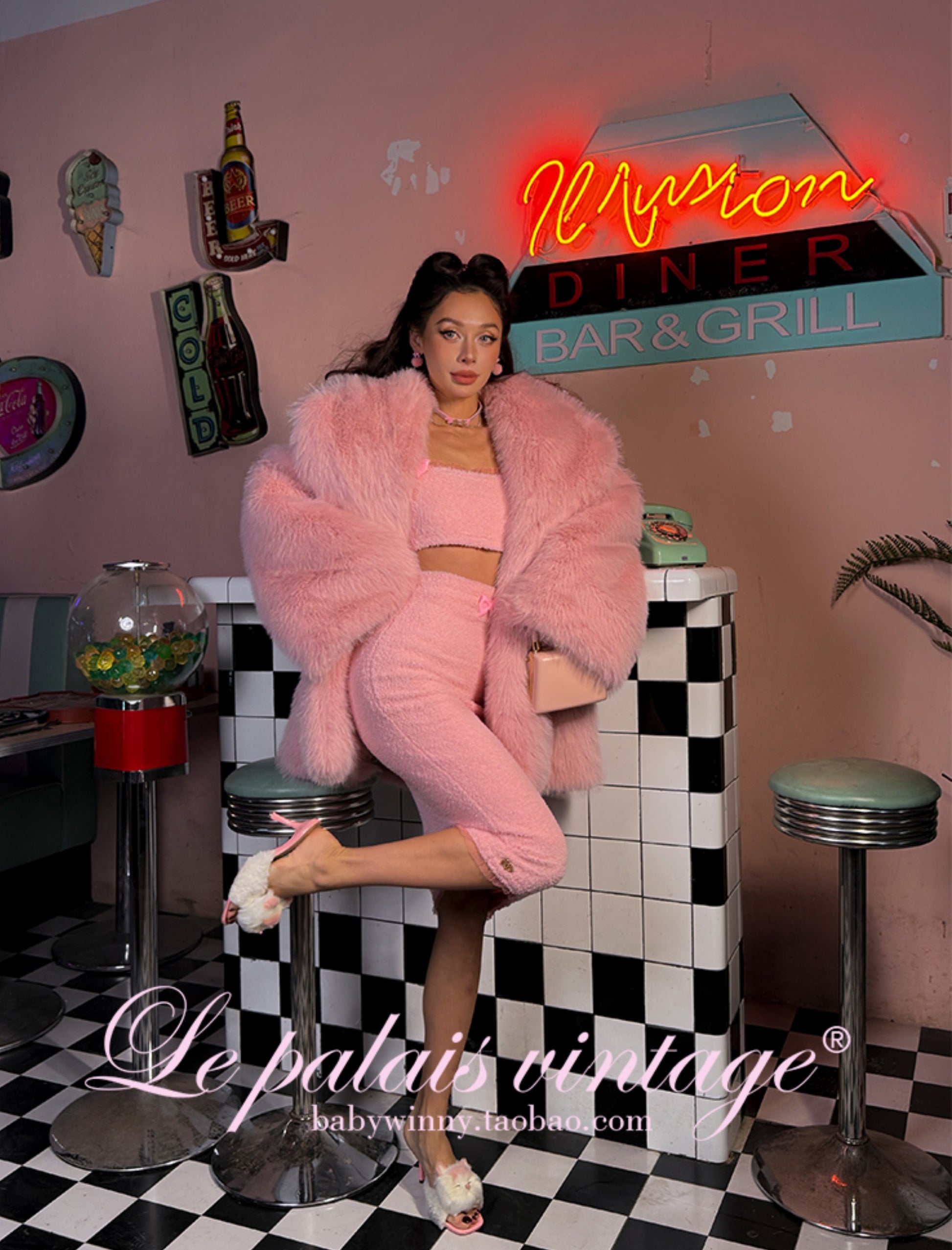 Le Palais Vintage Pink Plush Crop Top + Hip Skirt Set