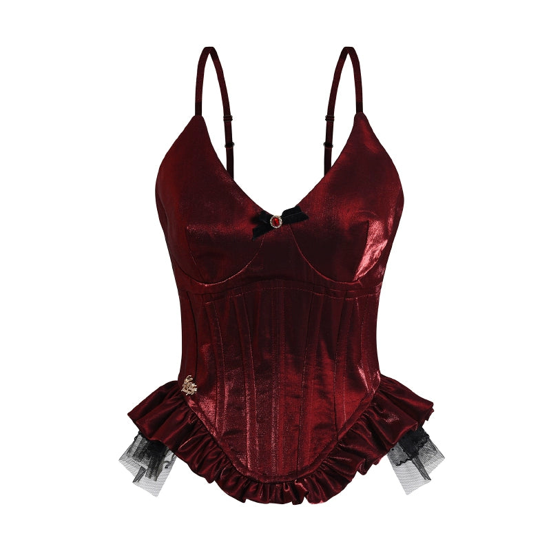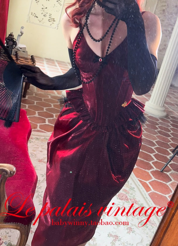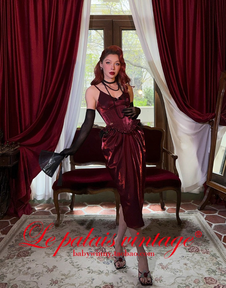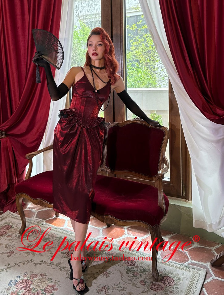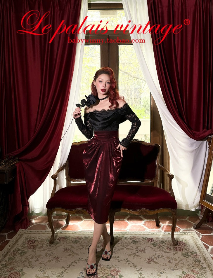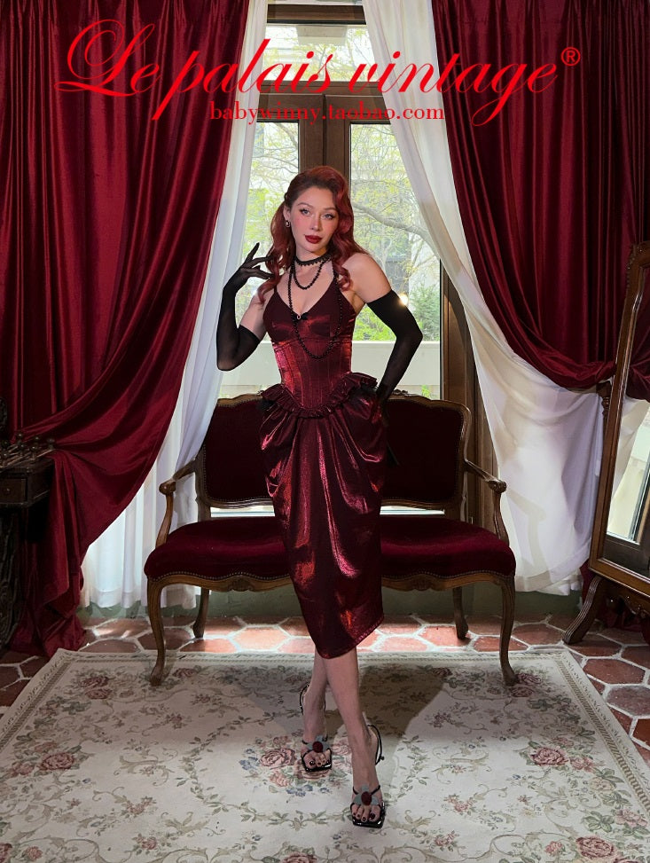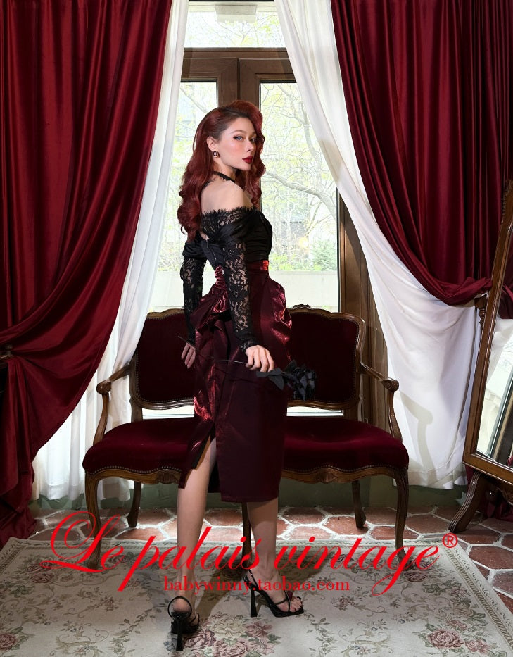 Le Palais Vintage Red Fishbone Corset High Waisted Flower Bud Pencil Skirt-ALEC