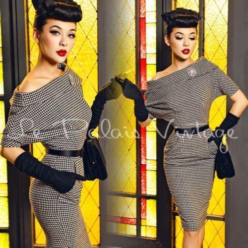 Le Palais vintage retro pin up hound's-tooth pencil off shoulder dress- Nola