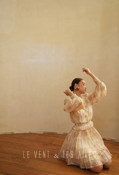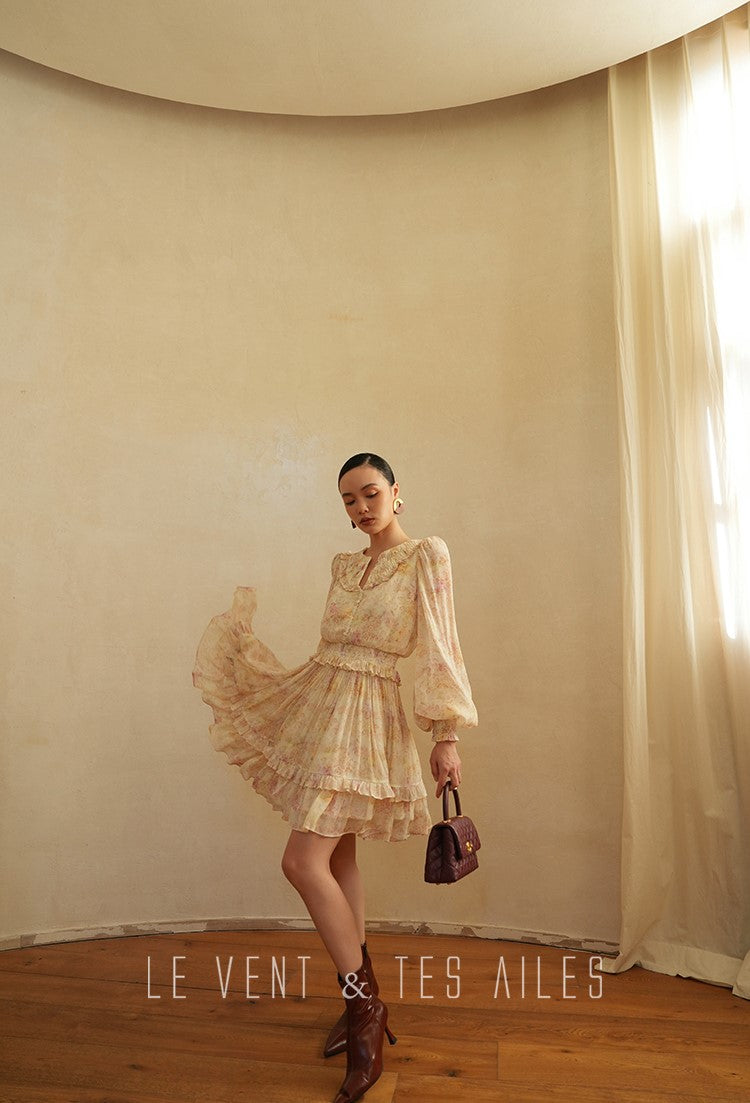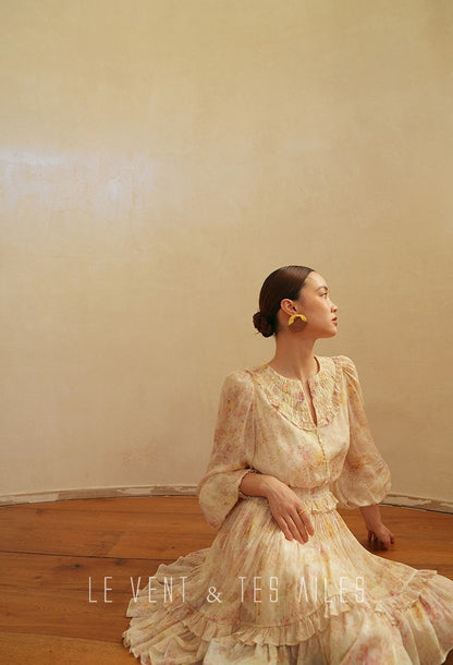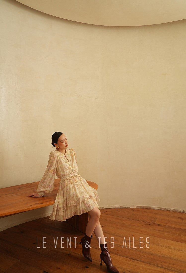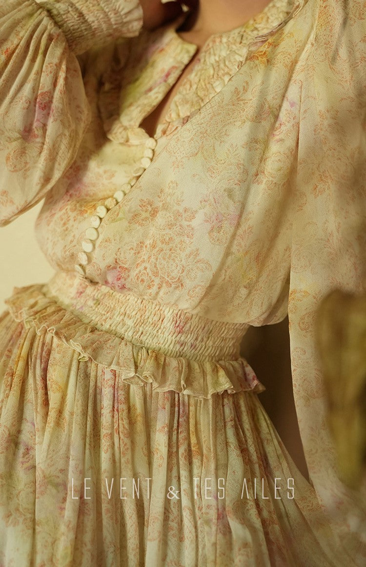LE VENT&TES AILES vintage French print elegant flora silk cinched waist dress-ZITA