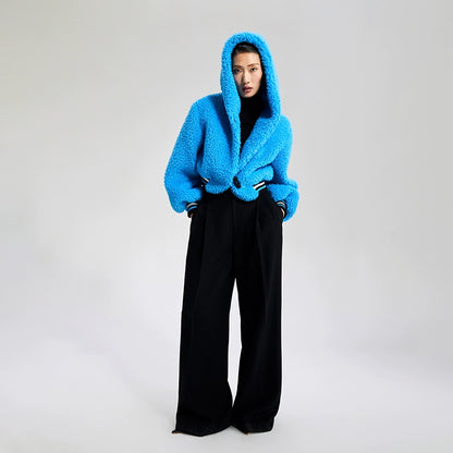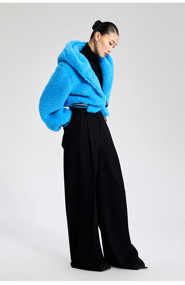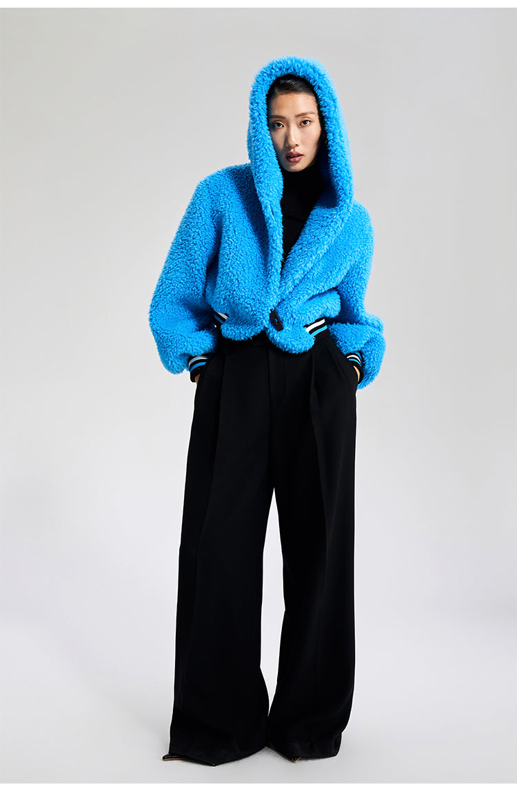 Make a statement wearing the LEDI W croped winter faux lambwool blue fuzz coat. Crafted from premium lamb wool, this striking coat is sure to turn heads with its dashing silhouette and sophisticated details. Boasting chic, classy, and elegant styling, it exudes stylish fashion that will last long into the colder months.