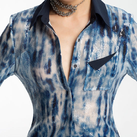 This LEDIM W blue tie die sequin long sleeve button-down slim shirt top - Abba is a timeless statement piece. Crafted with precision and refinement, it stands out with its sophisticated sequined tie dye pattern that will make any look stand out. Elevate your wardrobe with this truly exclusive piece.