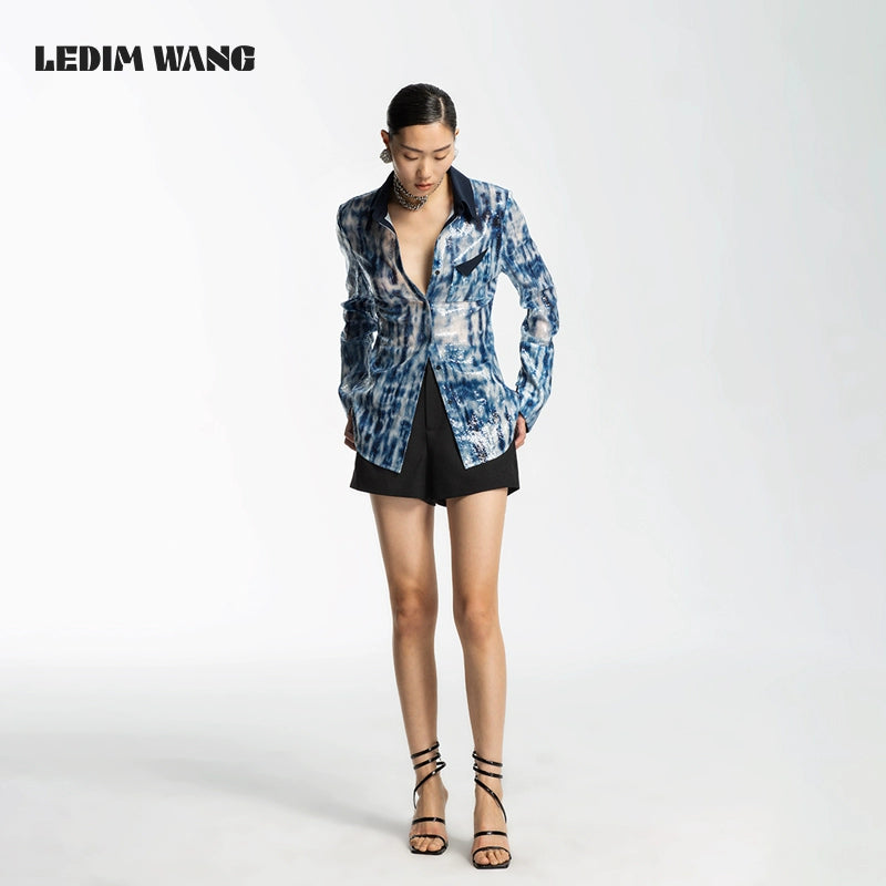 LEDIM W blue tie die sequin long sleeve botton down slim shirt top - Abba