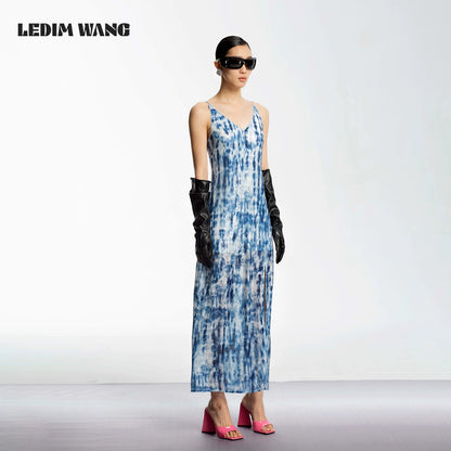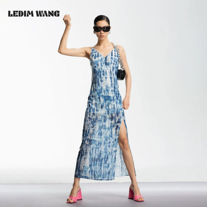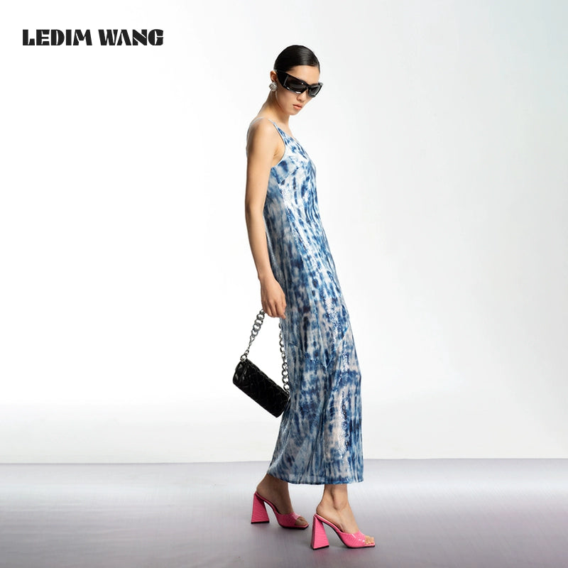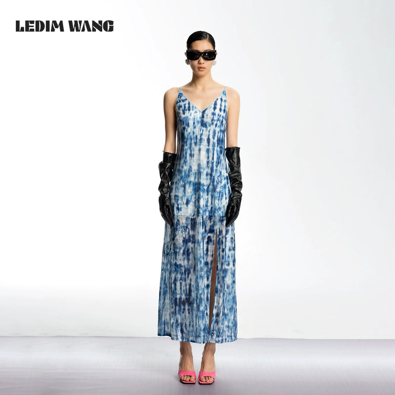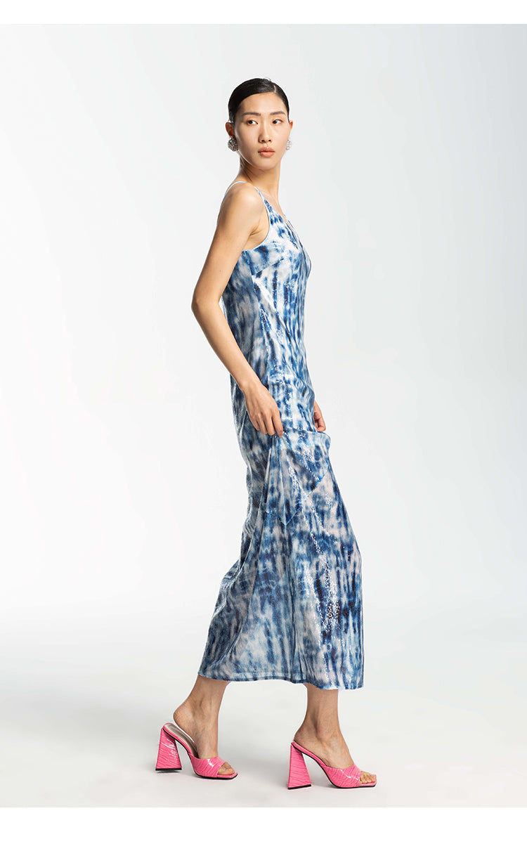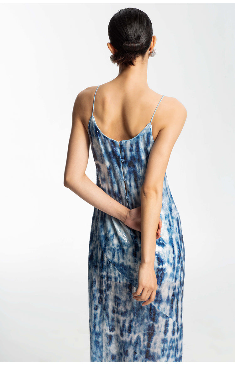 LEDIM W Blue tie dye sequined slip cocktail slit dress - Abba
