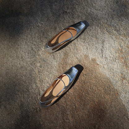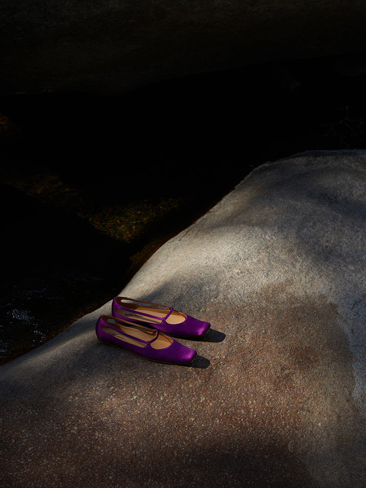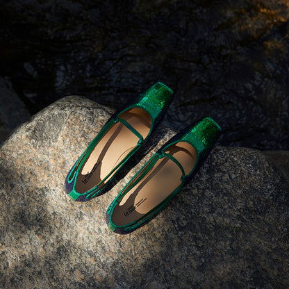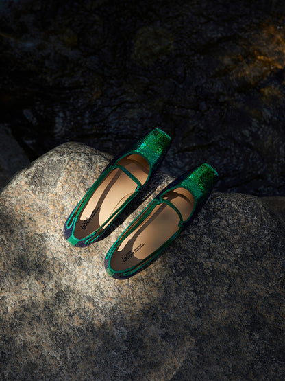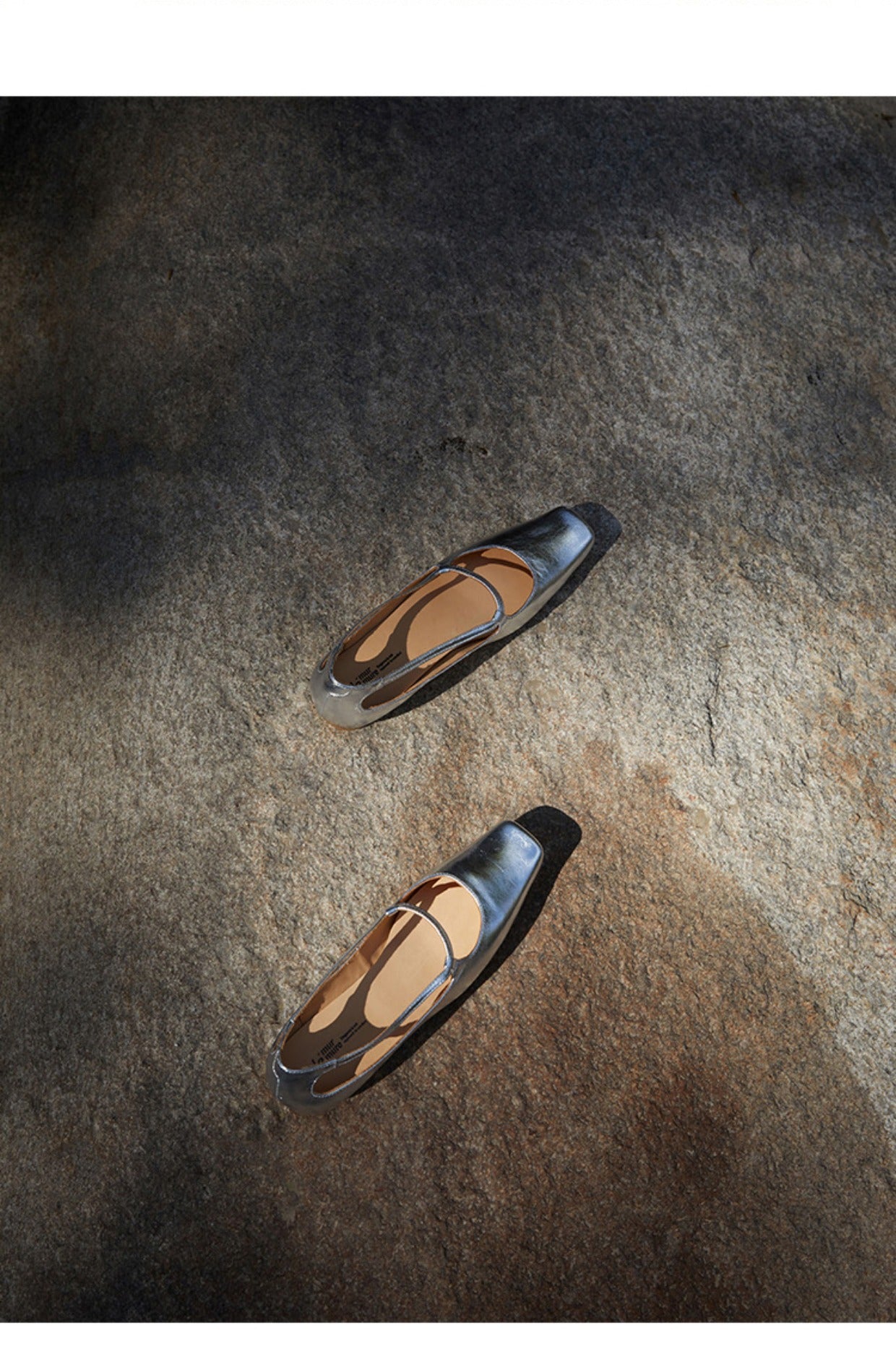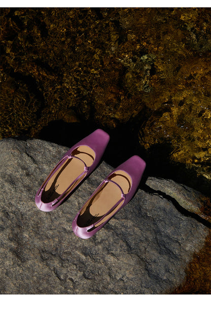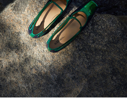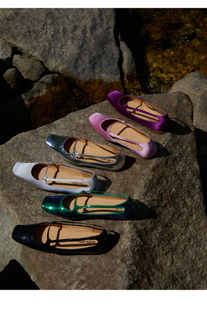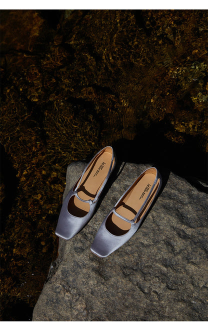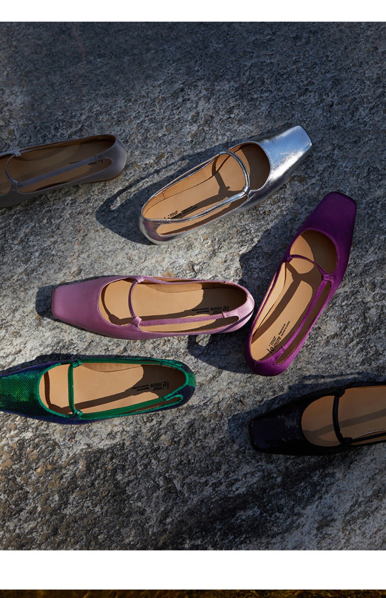 This limited edition ballet shoe features a one-pedal closing method, a plain pattern, Hepburn-style construction, hollow bright silk/sequins detailing, a flat heel (≤ 1 cm), a warped head toe, a leather sole, top layer cowhide lining, shallow opening depth, water-dyed leather, first layer cowhide insole, single shoe construction, and satin help surface material.