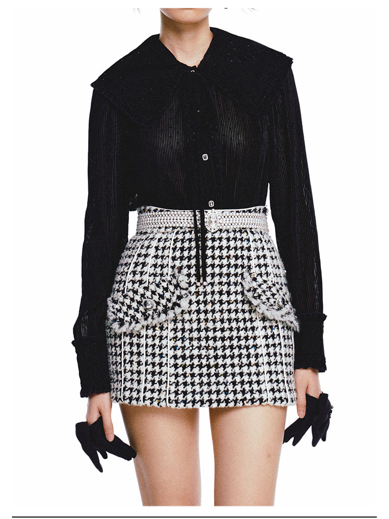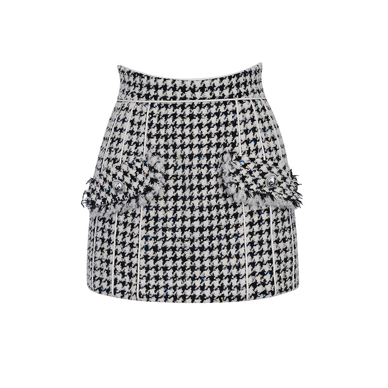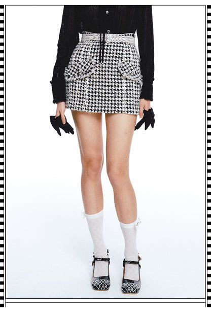 This Limited Edition Autumn Vintage Silhouette Tweed Houndstooth mini Short Skirt is tailor-made for those seeking sophistication and high-end elegance. With its classic houndstooth pattern and “old money” aesthetics, this skirt suit presents a timeless, yet sexy statement for those who demand the best. A designer, limited edition piece, perfect for a unique and stylish look.