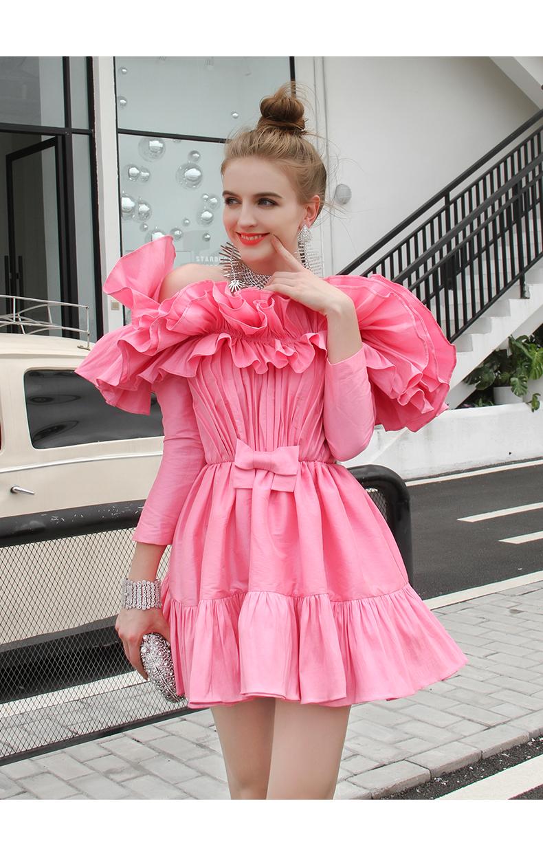 Ruffled Layered off Shoulder Princess Dress Dinner Party cocktail pink dress - Tevi