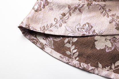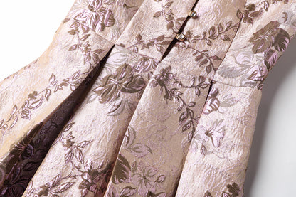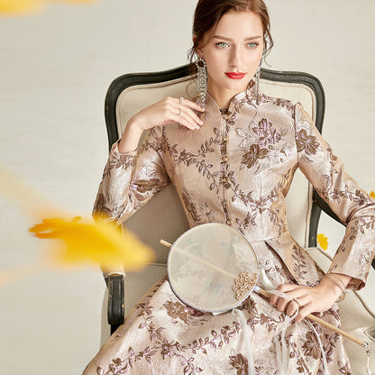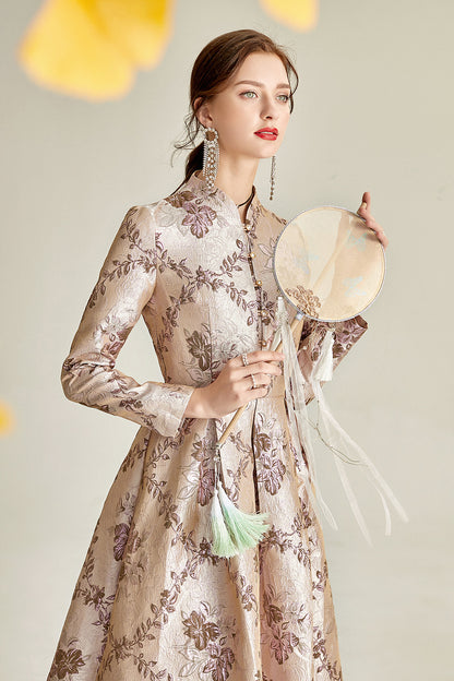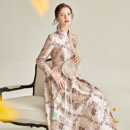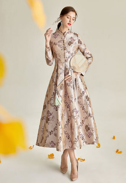 Long sleeve stand collar retro jacquard satin swing dress