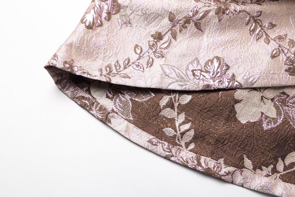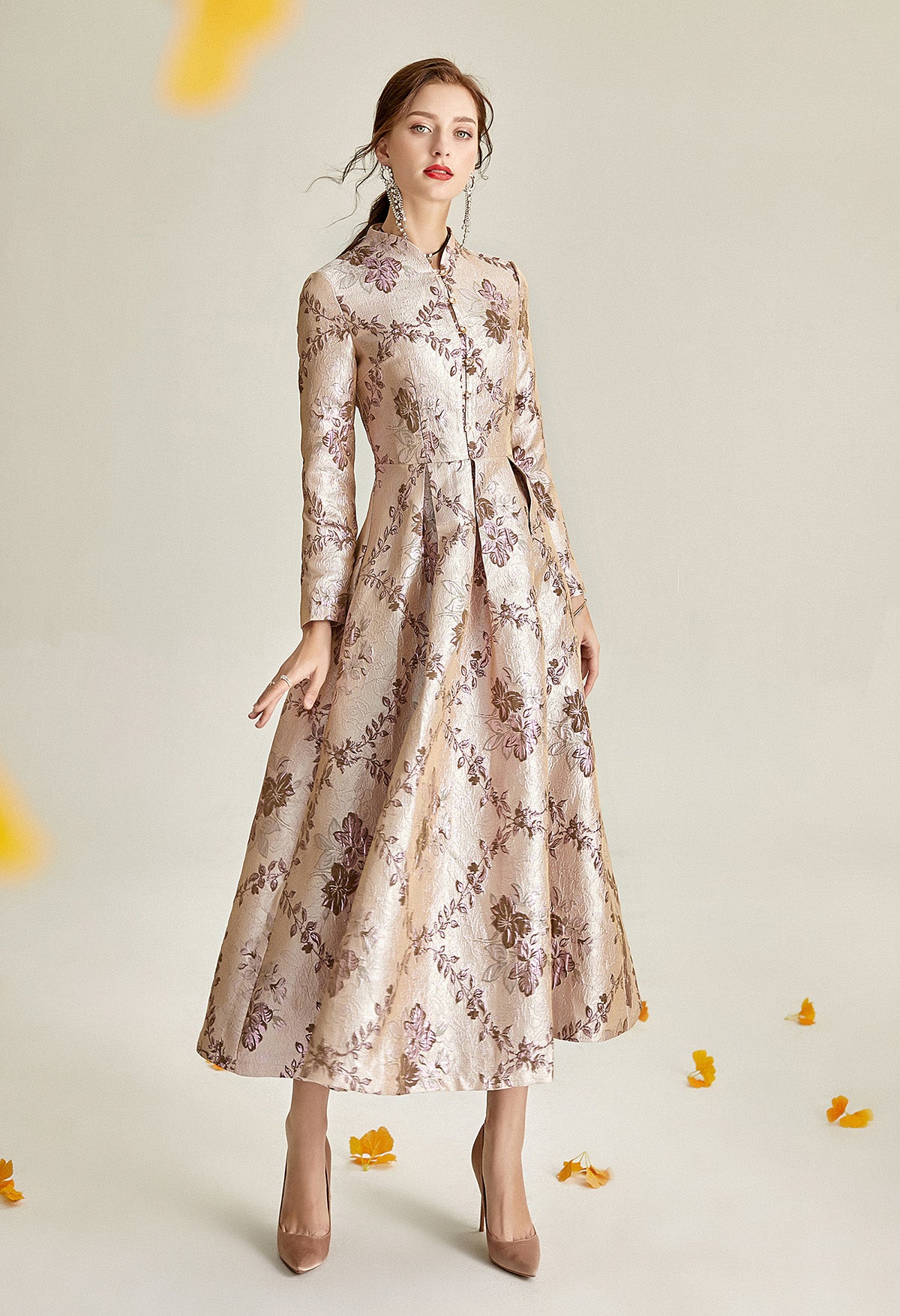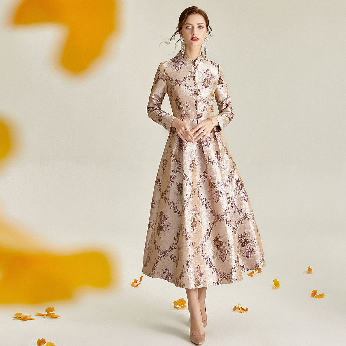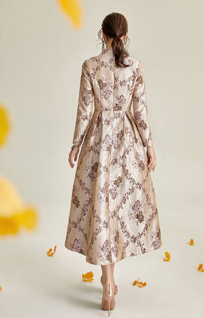 Long sleeve stand collar retro jacquard satin swing dress- Pilar