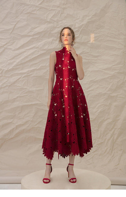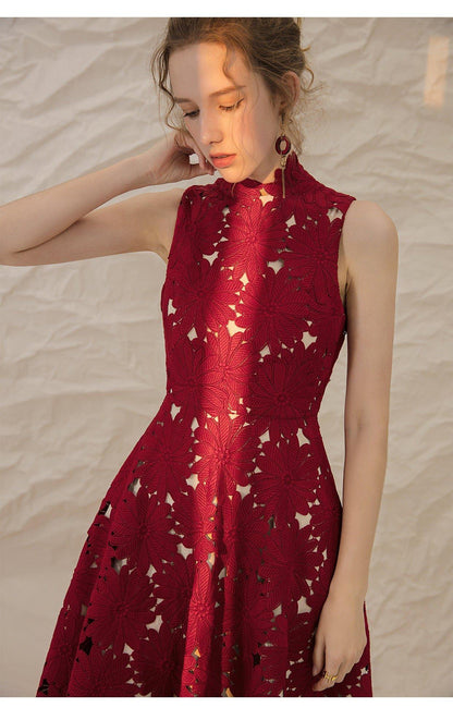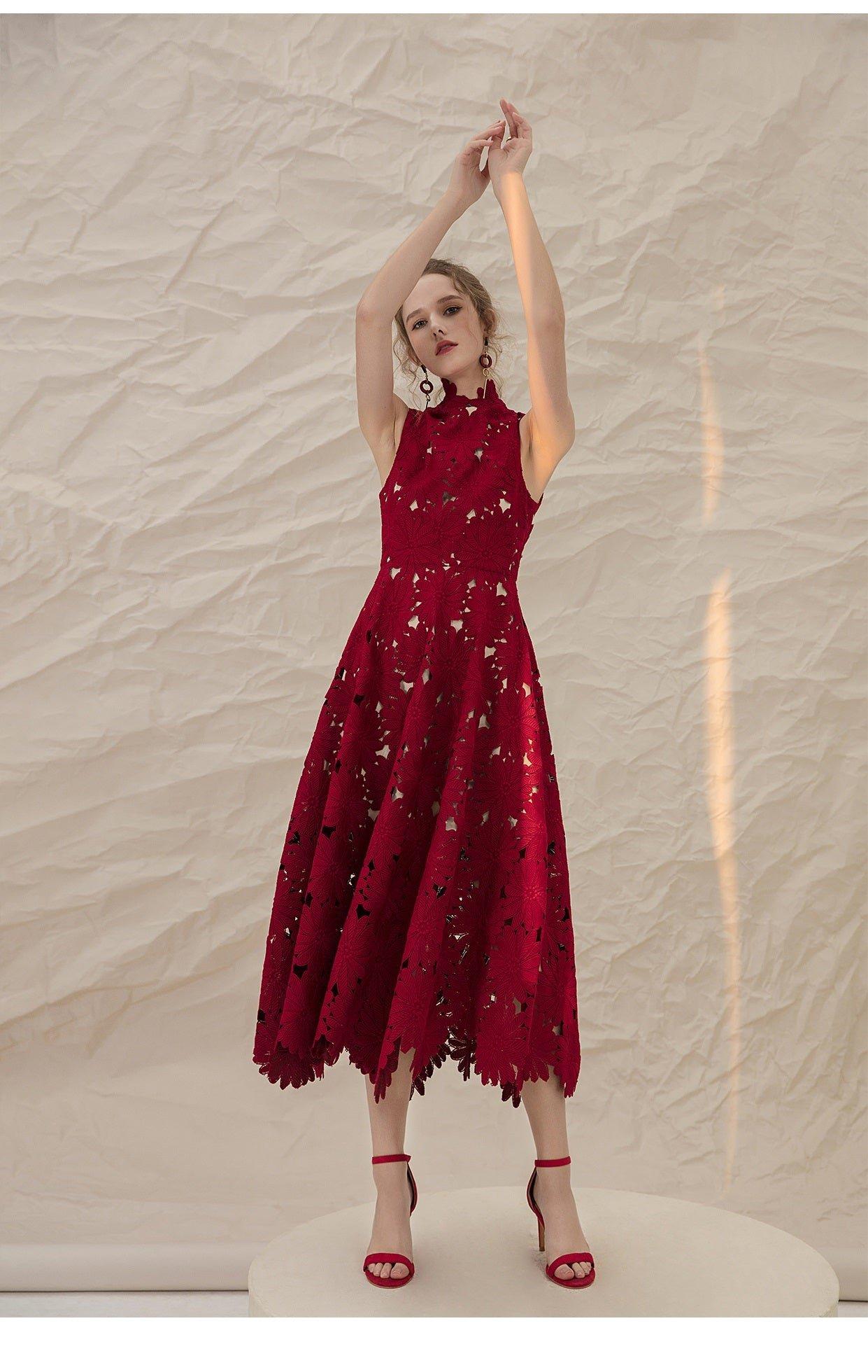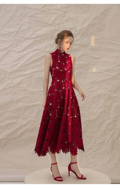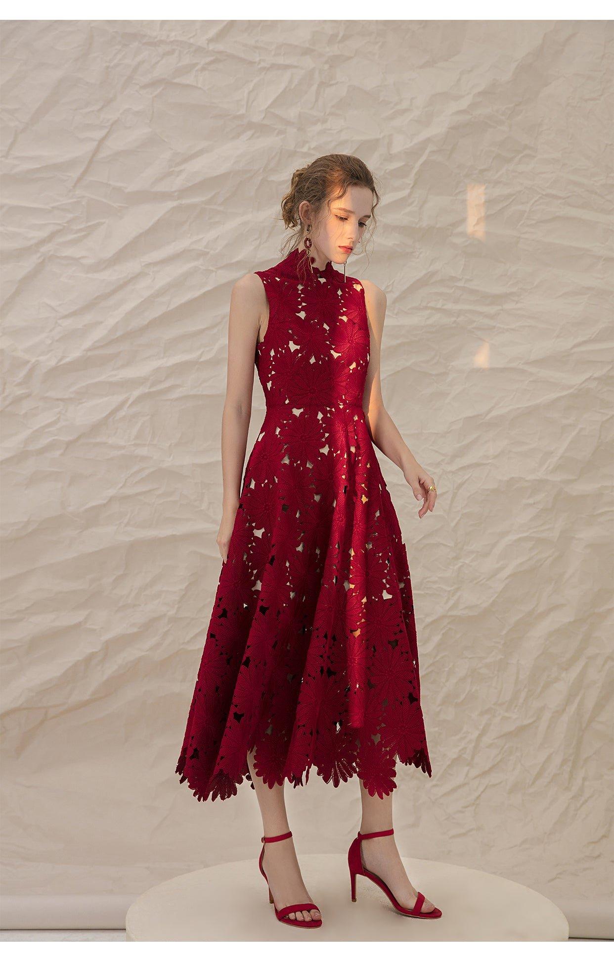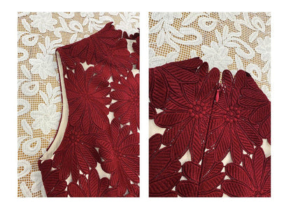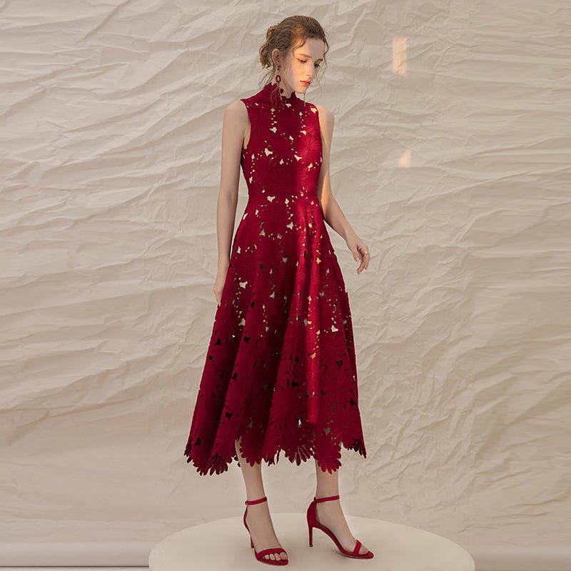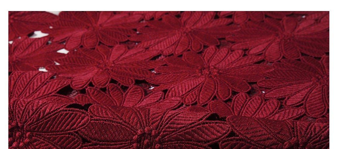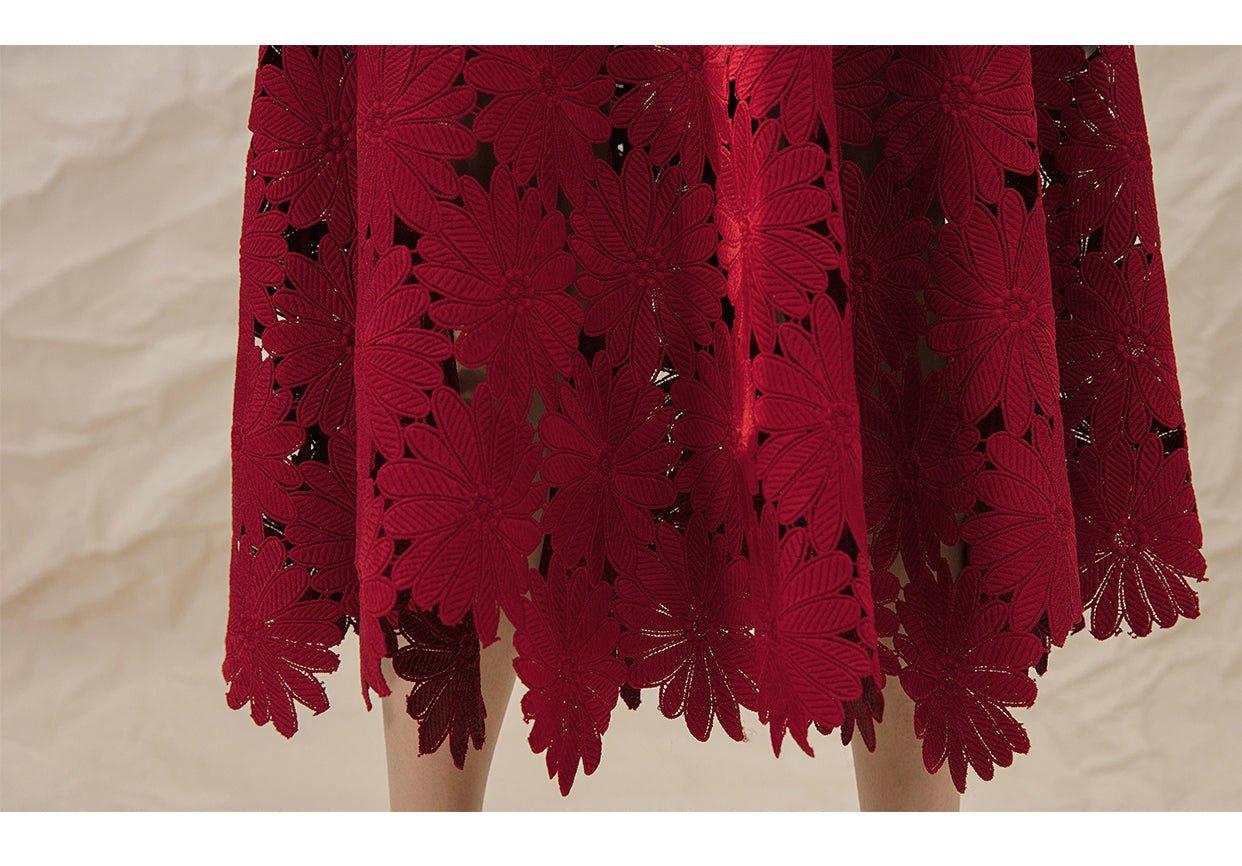 Luxury elegant retro Hollow Red Lace Jacquard Bridal cocktail wedding guest midi Dress - Paris