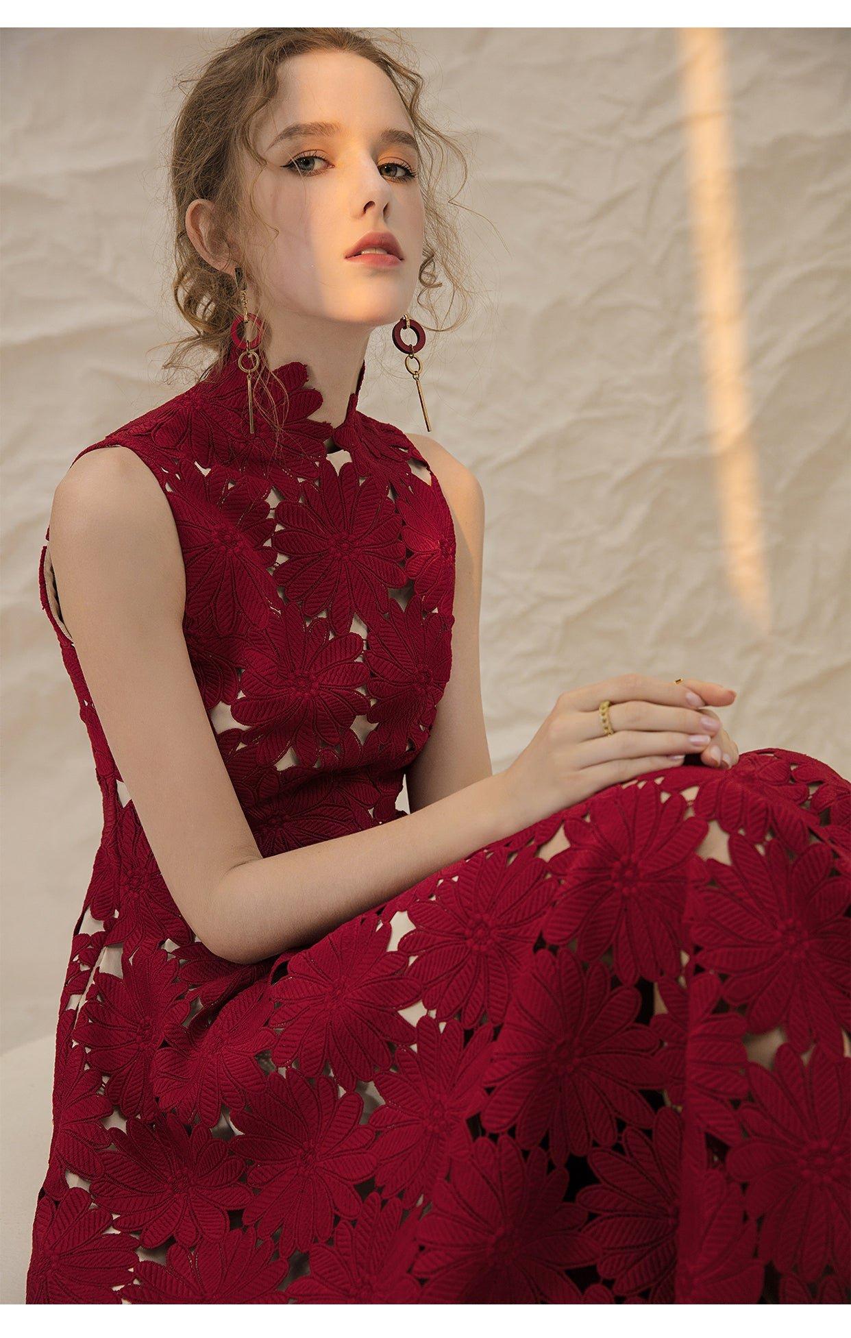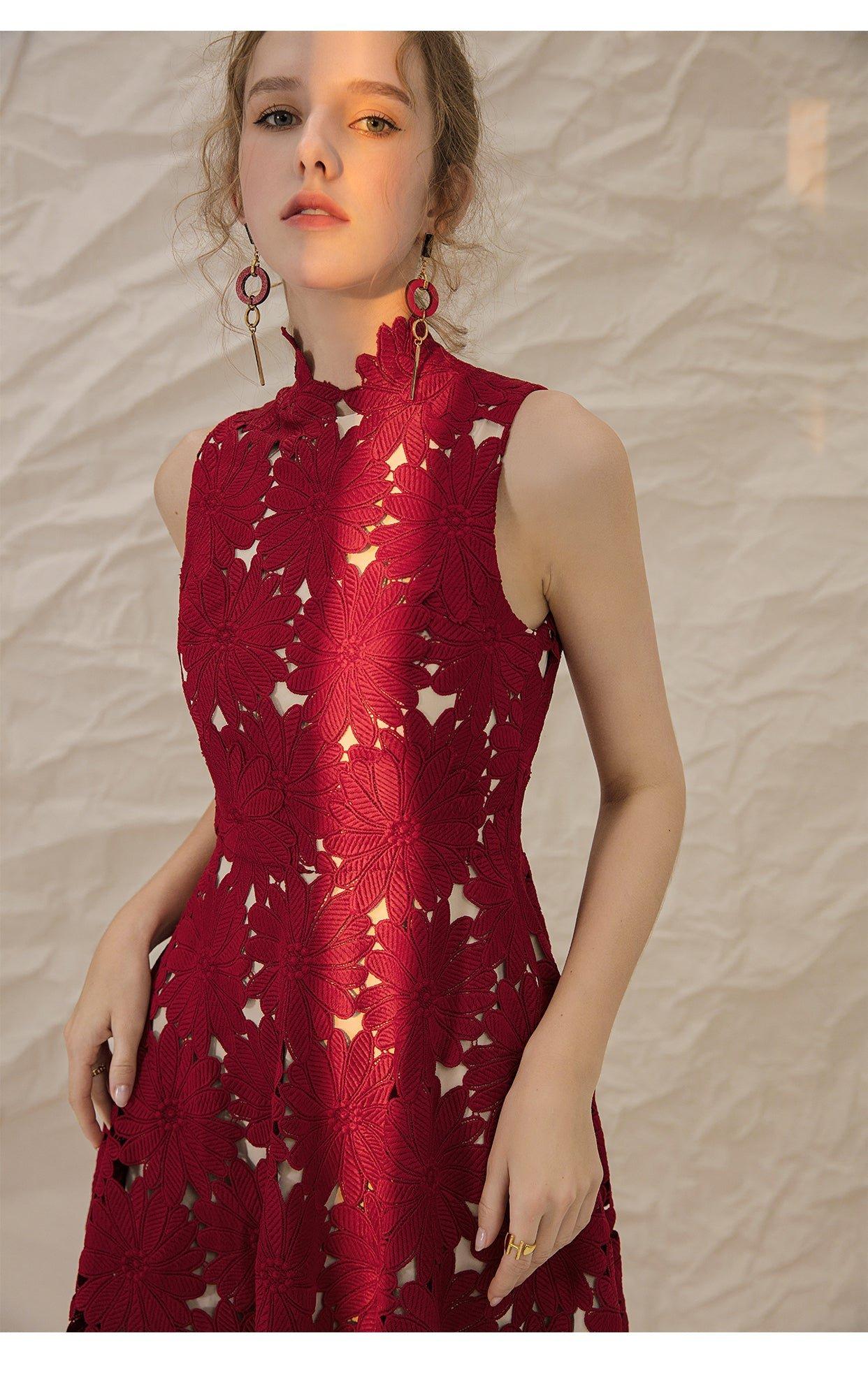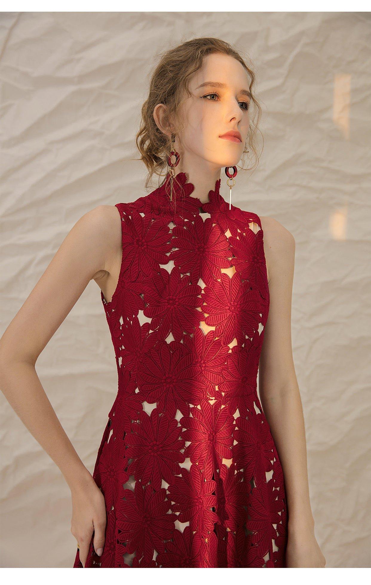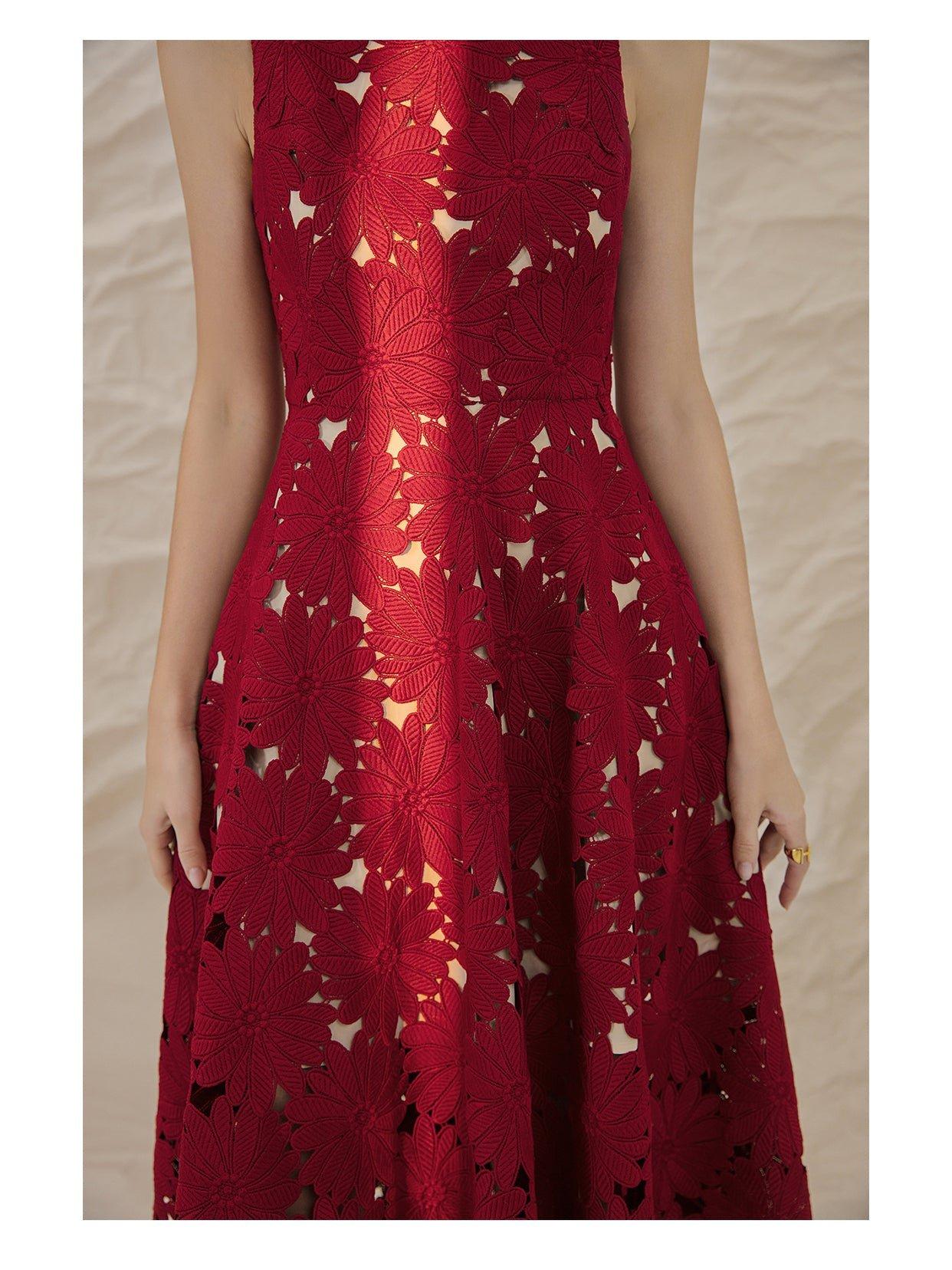 Crafted with meticulous attention to detail, this dress features a captivating hollow red lace jacquard pattern that exudes timeless charm and sophistication. The intricate lacework adds a touch of romance, making it the perfect choice for any bridal or cocktail occasion.