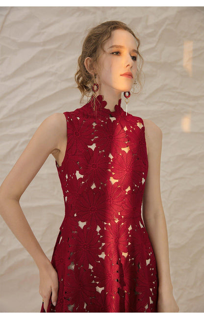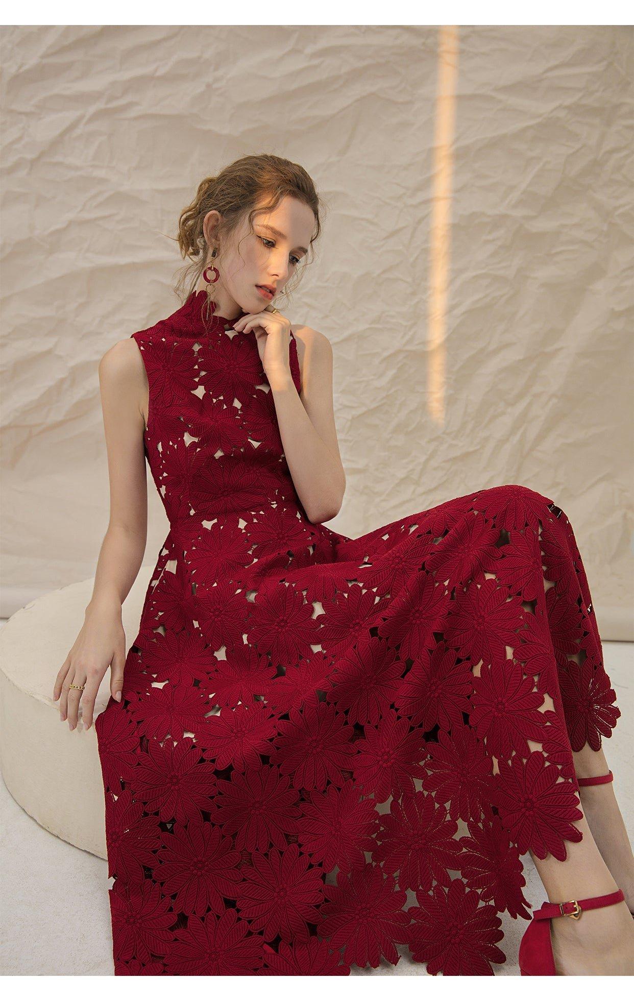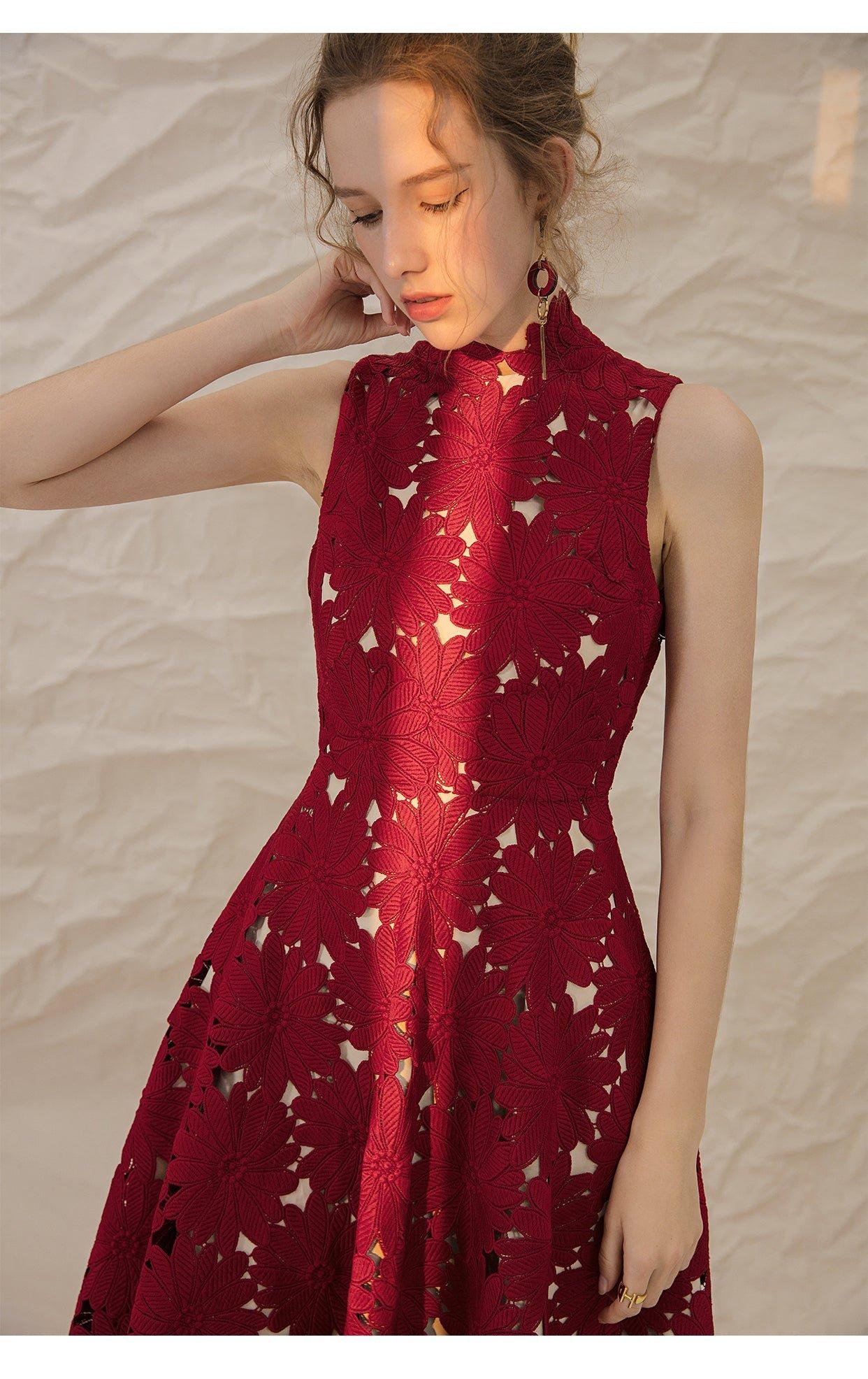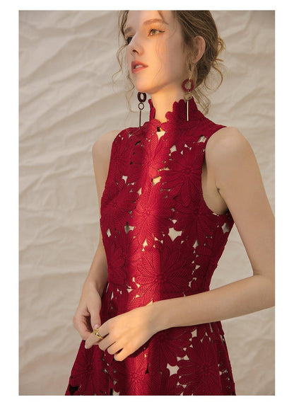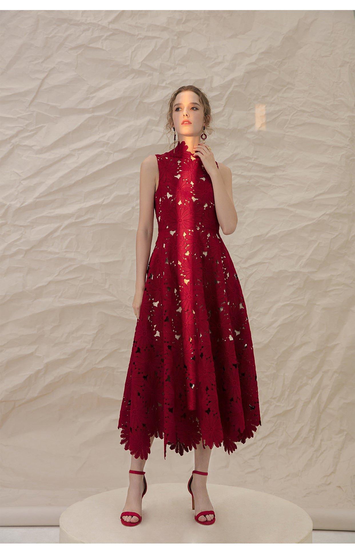 Crafted with meticulous attention to detail, this dress features a captivating hollow red lace jacquard pattern that exudes timeless charm and sophistication. The intricate lacework adds a touch of romance, making it the perfect choice for any bridal or cocktail occasion.