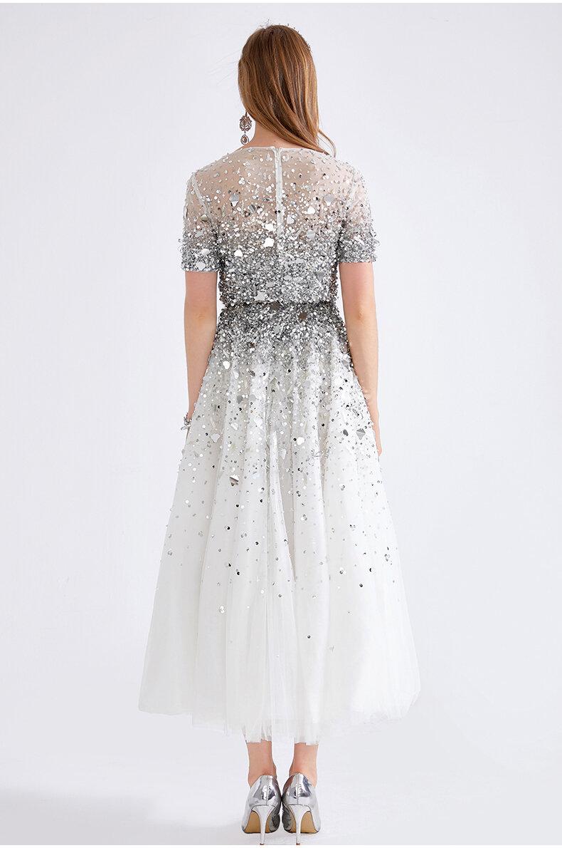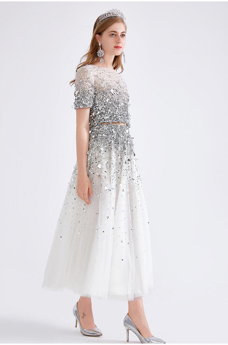 Luxury heavy sequin dress skirt heavy beaded sequin two-piece midi white wedding skirt + Sequin white wedding top- Dila