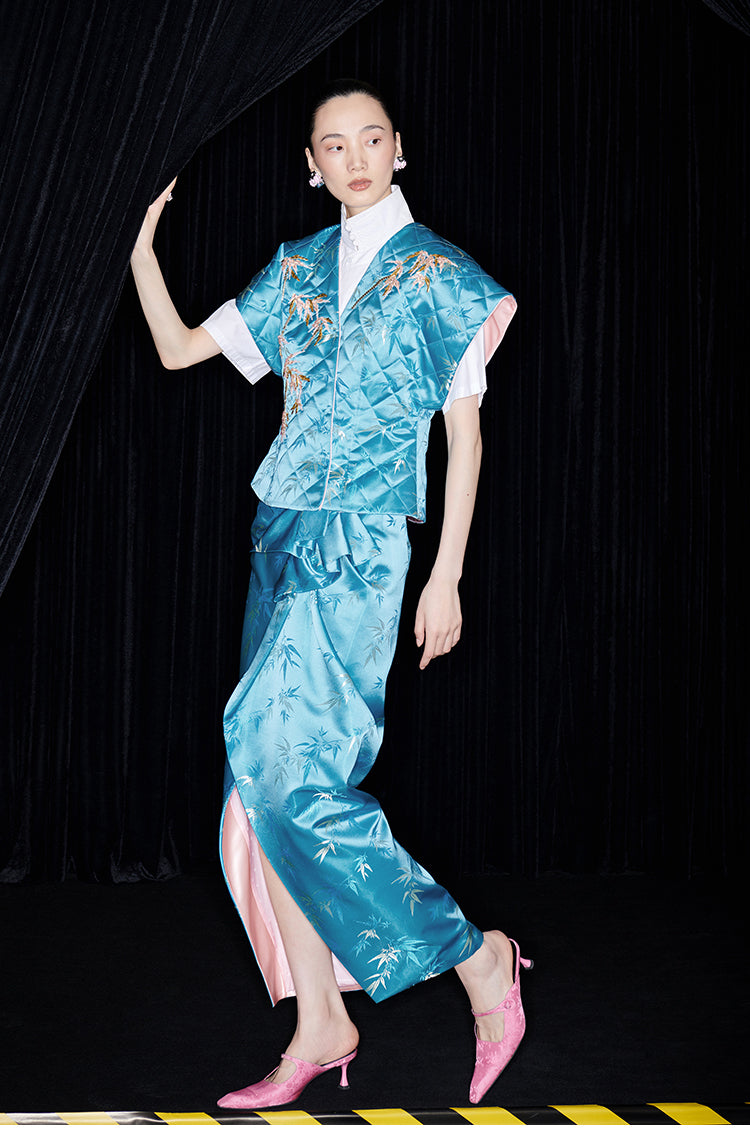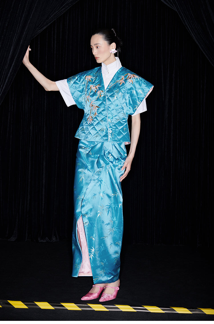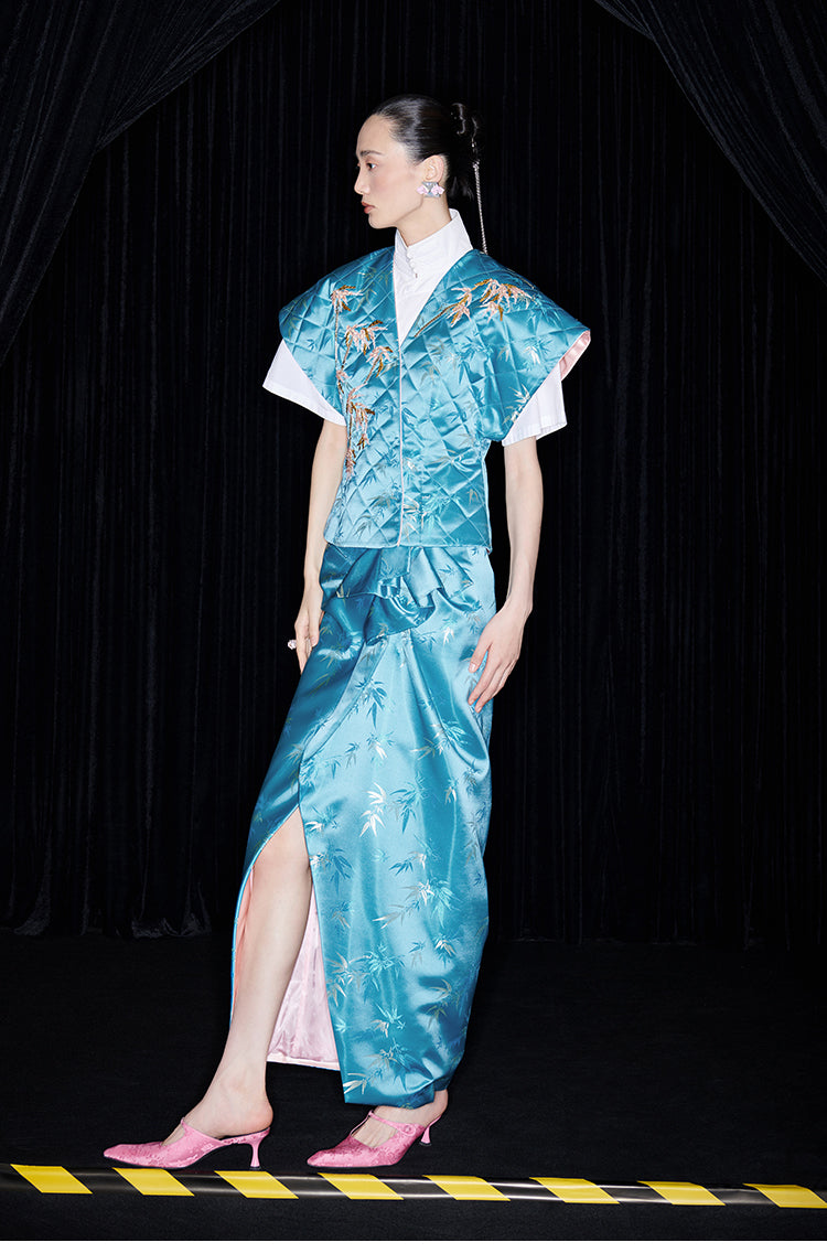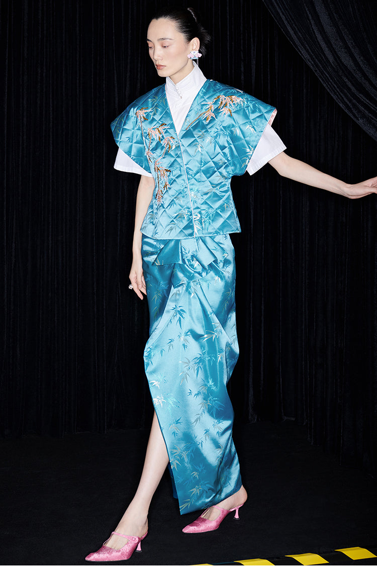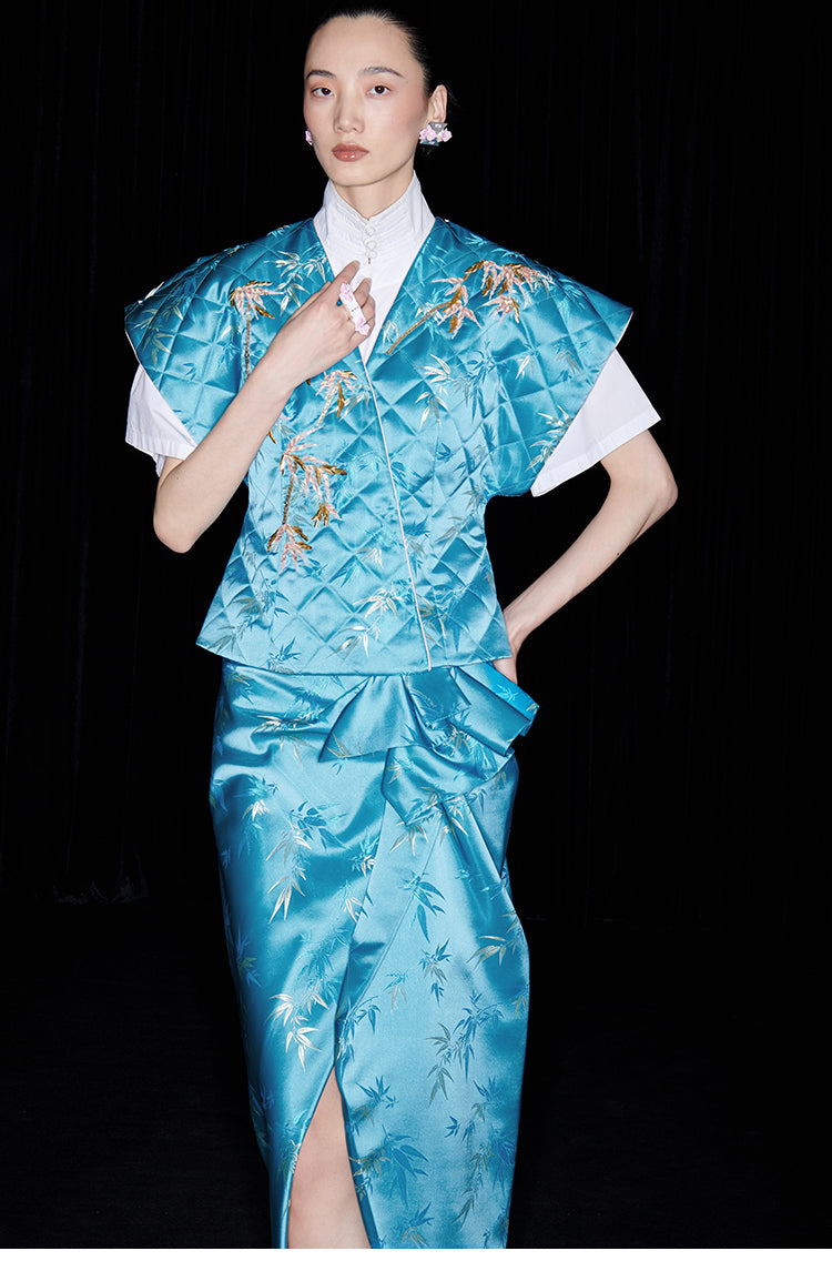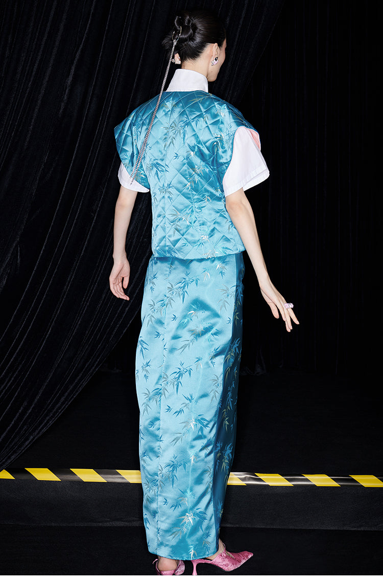 Be fashion-forward and comfortable with the M essential Ma Kai designer brand golden autumn bamboo nail beads vest. This set includes a white short-sleeved shirt with a stylish bamboo design vest and skirt. Perfect for formal events, office settings, or church, this outfit is colorful and on-trend for the autumn season.
