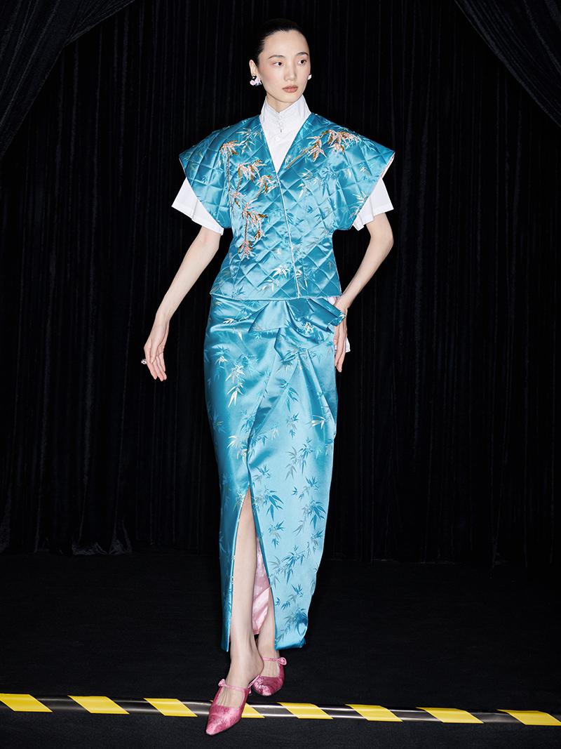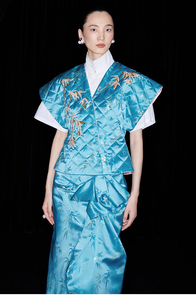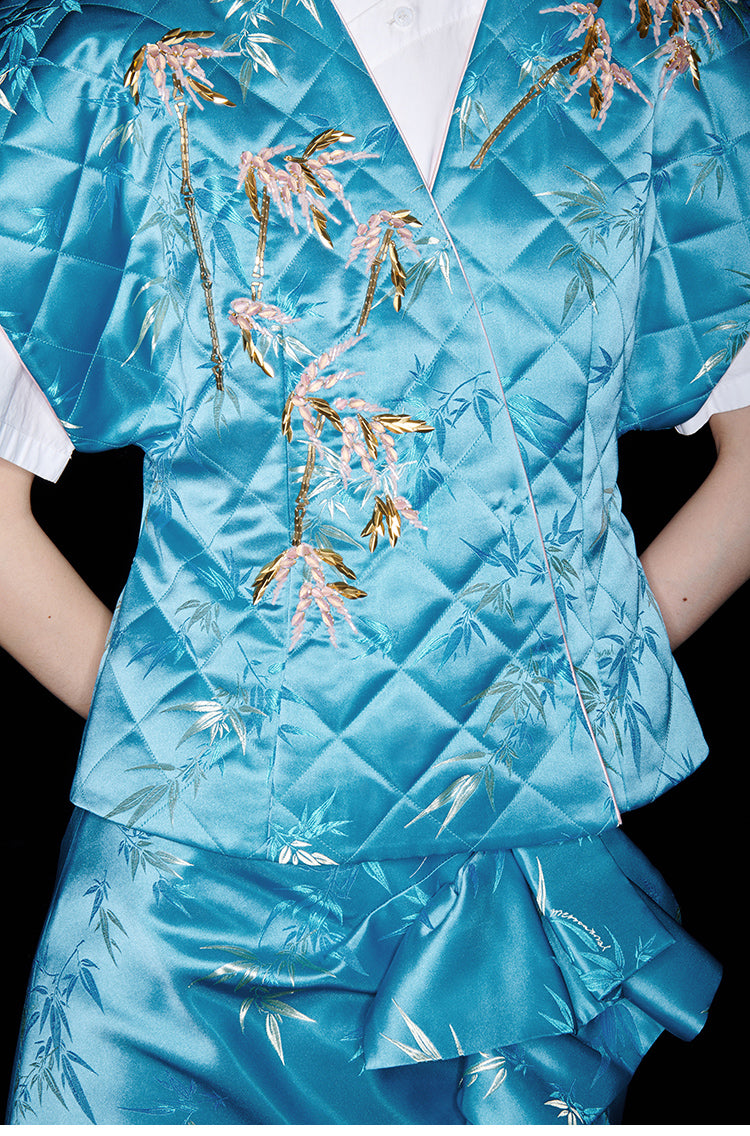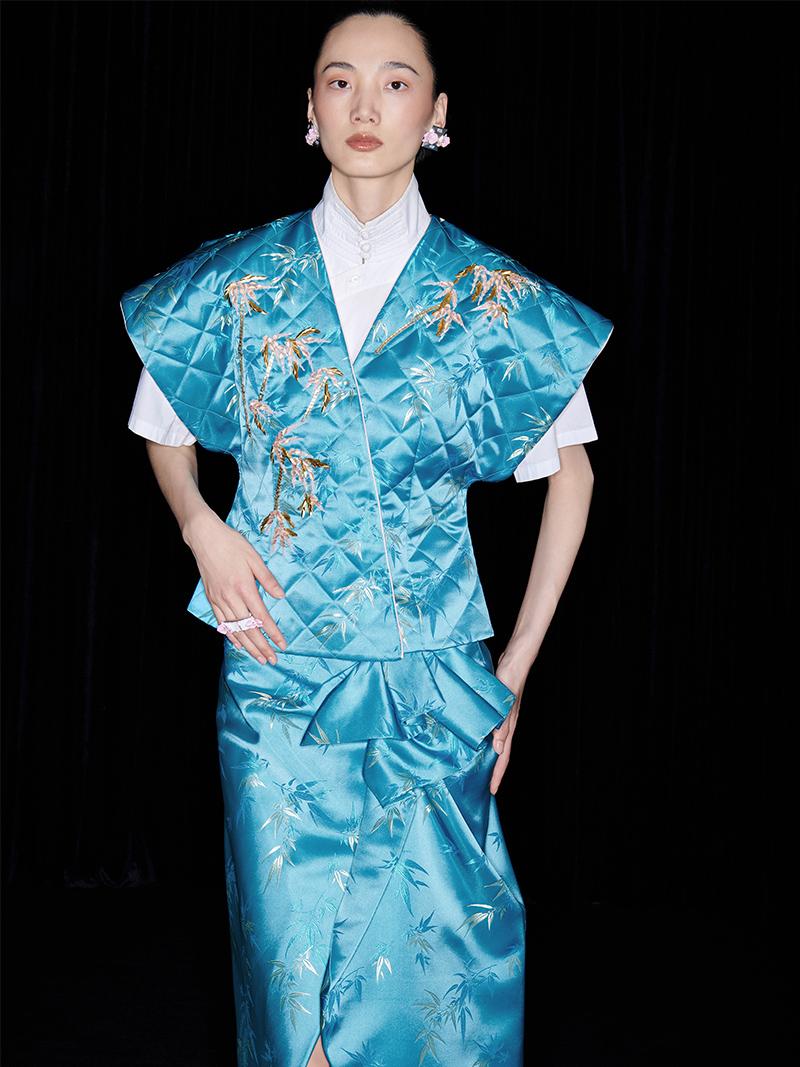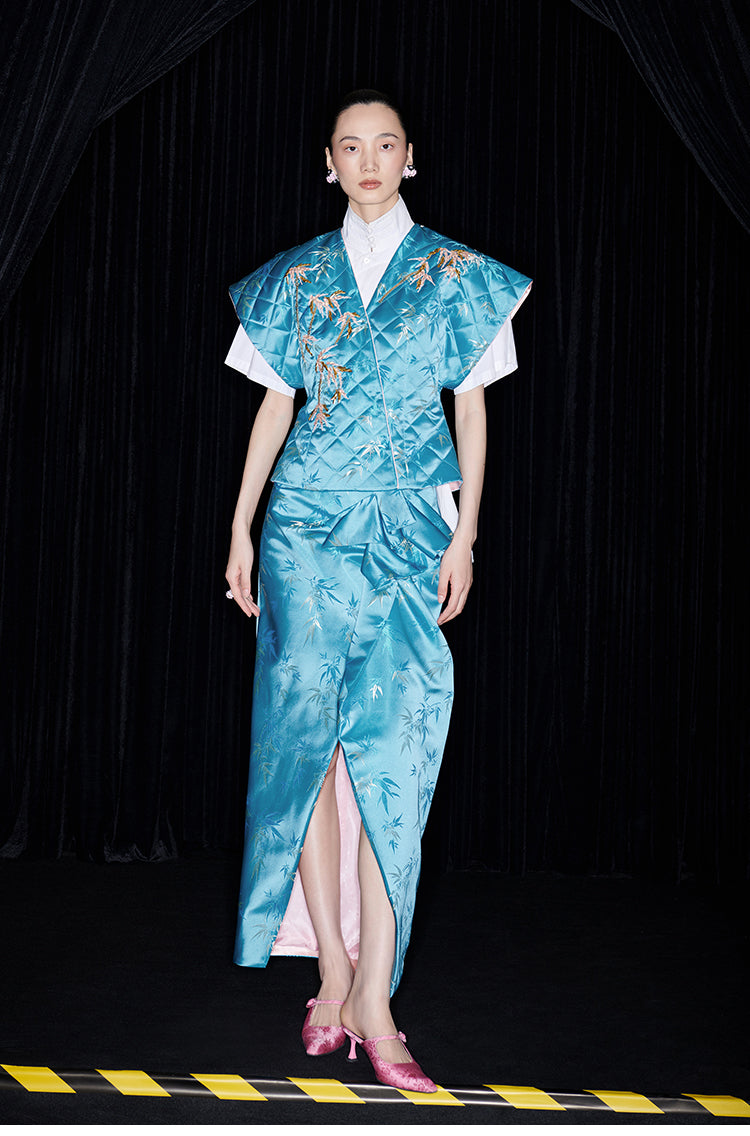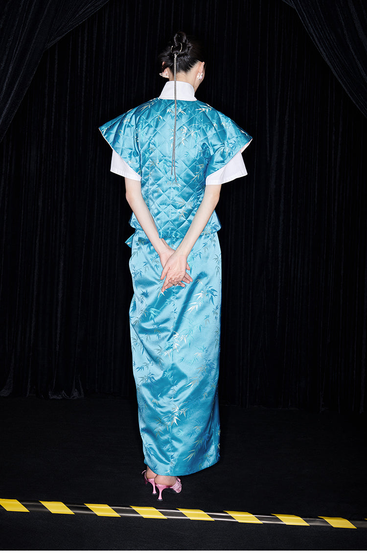 Be fashion-forward and comfortable with the M essential Ma Kai designer brand golden autumn bamboo nail beads vest. This set includes a white short-sleeved shirt with a stylish bamboo design vest and skirt. Perfect for formal events, office settings, or church, this outfit is colorful and on-trend for the autumn season.