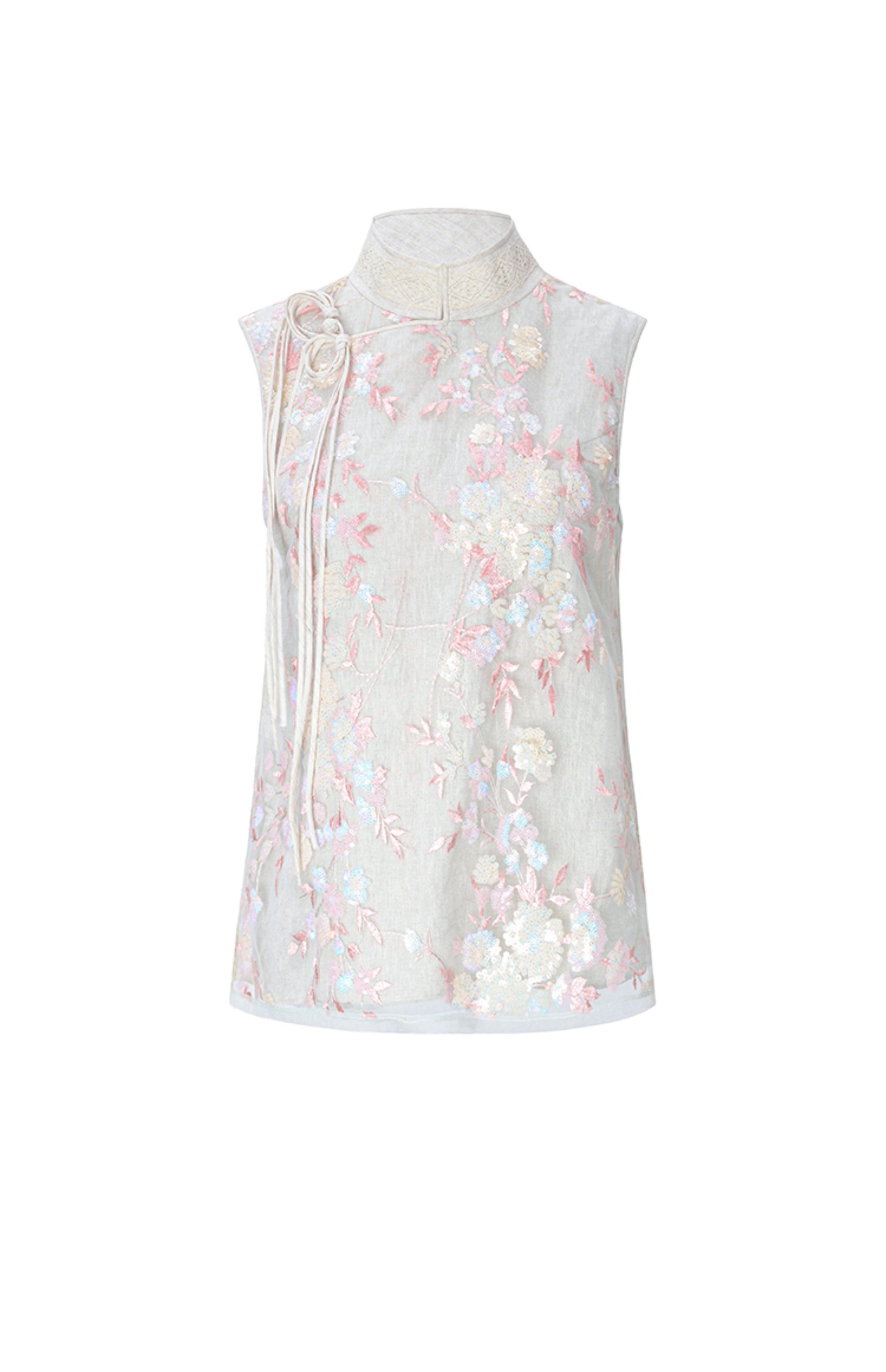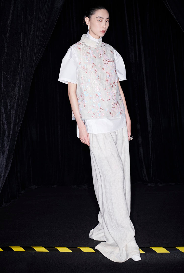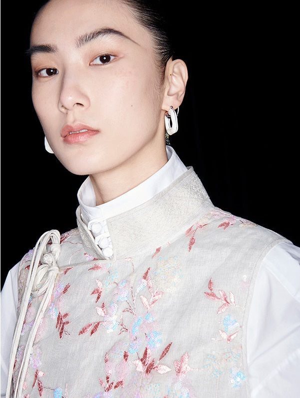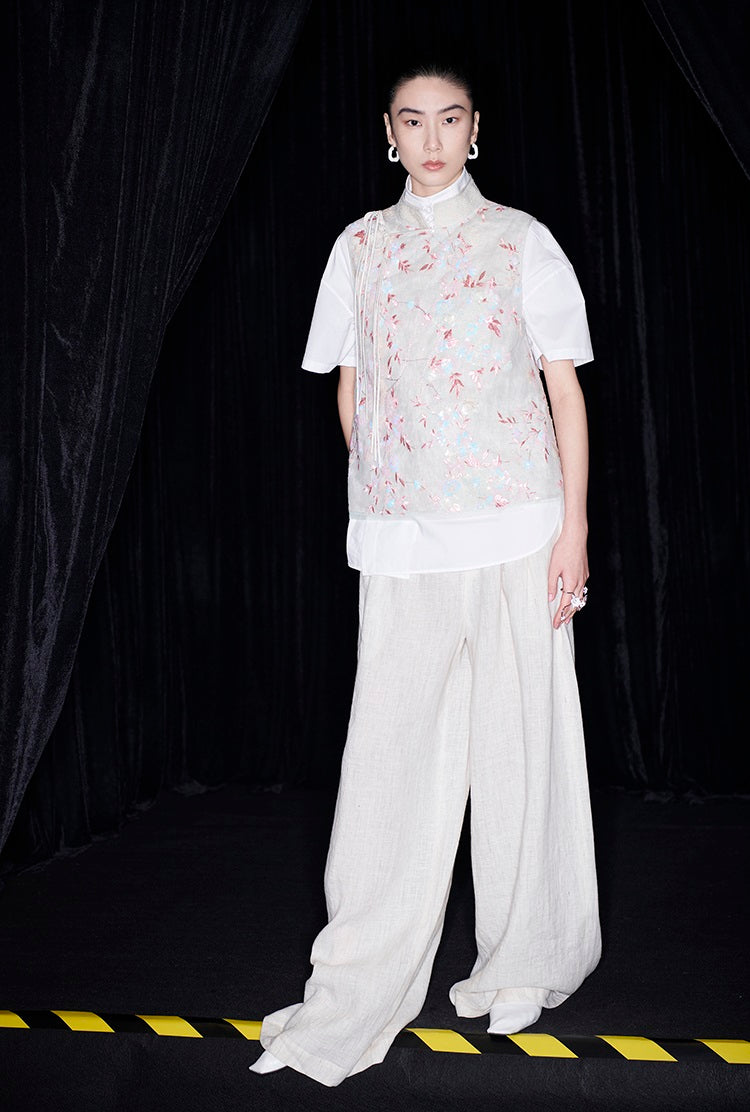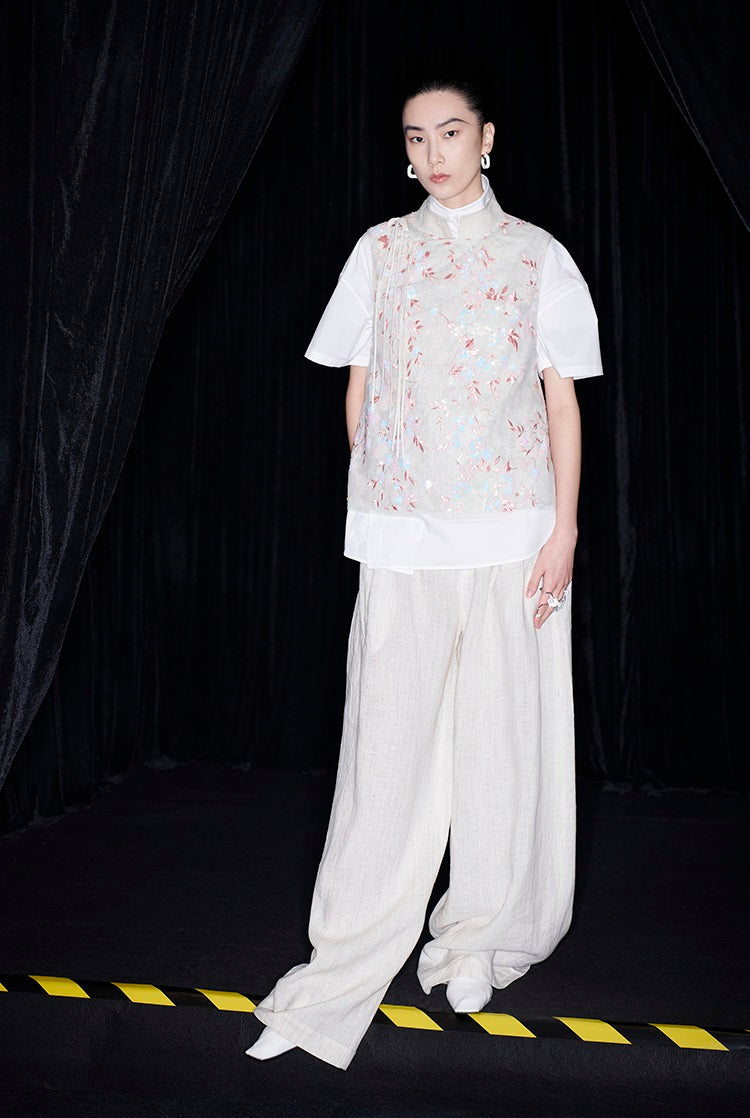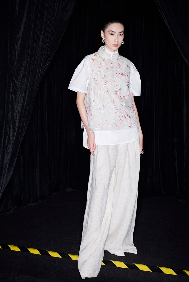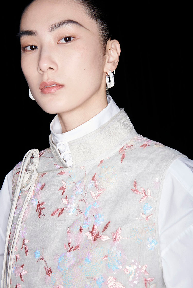 This M essential Mackay designer vest showcases intricate beaded pavé embroidery on breathable linen fabric. The sleeveless design highlights a delicate floral pattern, combining artisanal craftsmanship with lightweight comfort. Ideal for layering, this vest adds a refined, textured element to sophisticated ensembles.