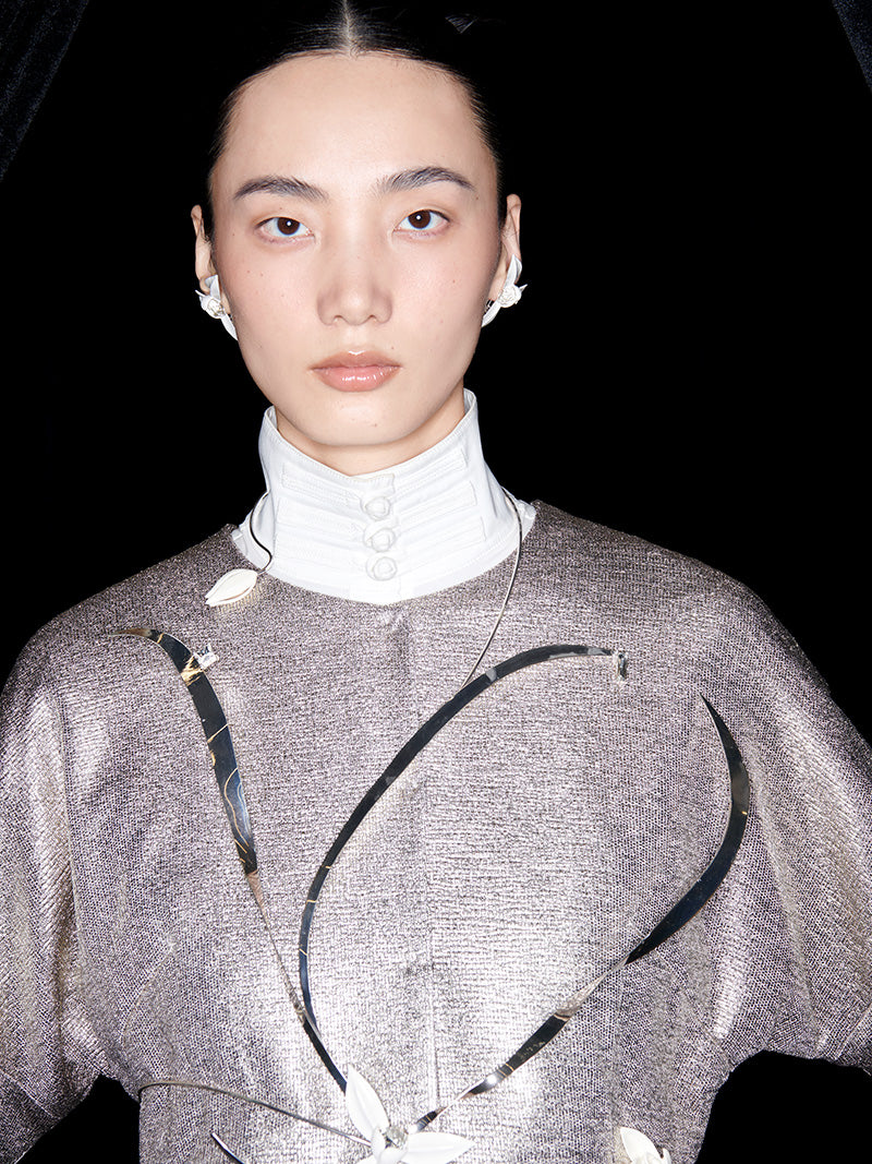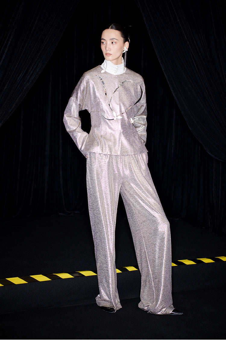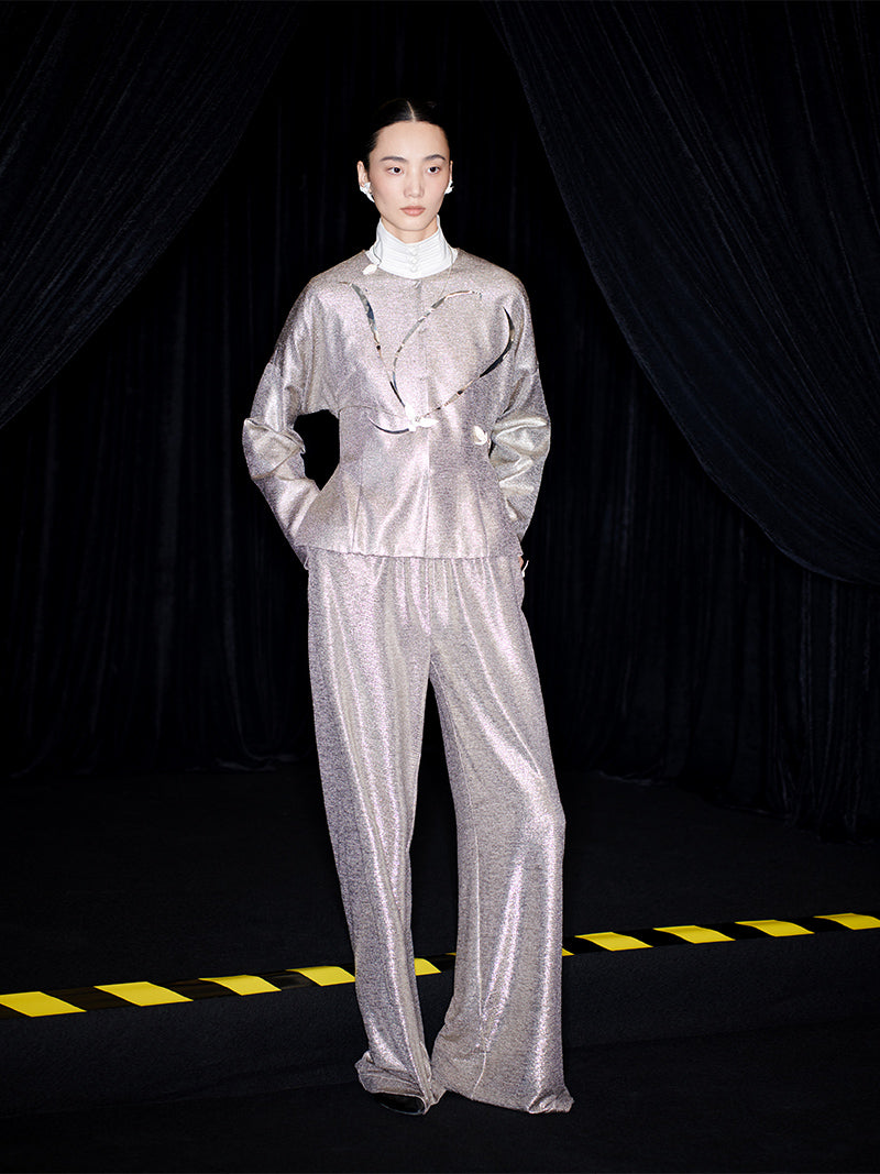 Elevate your corporate event attire with the M essential Mackay designer brand's Angan knit round neck waist cinched new Chinese top and matching coat and pant. This stylish and chic ensemble features a long sleeve white design and is perfect for a classy and sophisticated fall look.