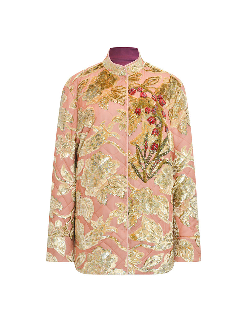 Make a statement this autumn with the M essential Mackay quilted coat adorned with beautiful, embroidered lilies of the valley. This bright and colorful pink floral coat is a must-have for any trendsetter, paired perfectly with a crisp white shirt and skirt for a stylish and fashionable event.