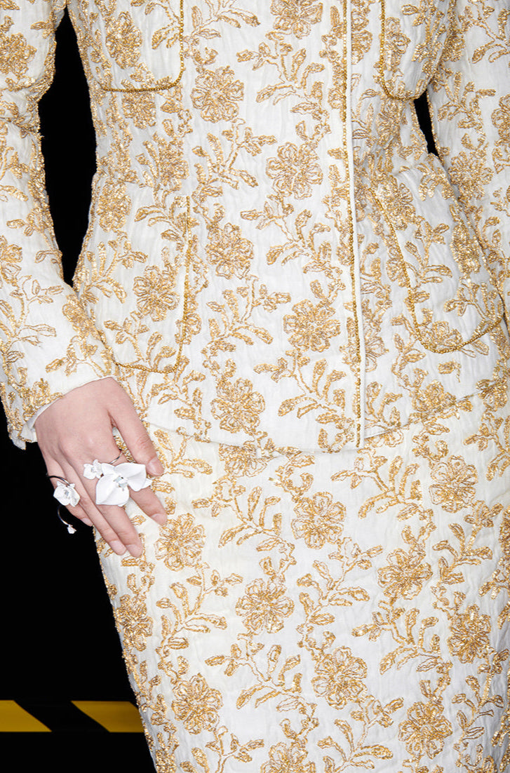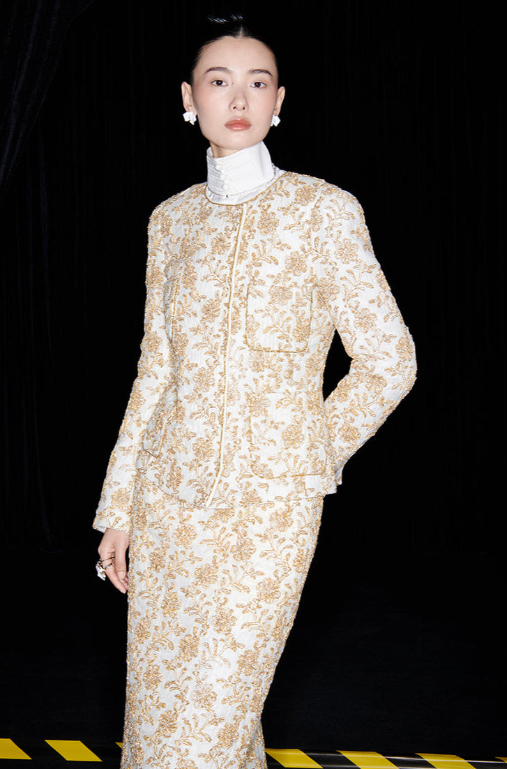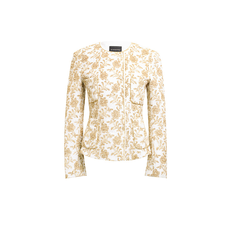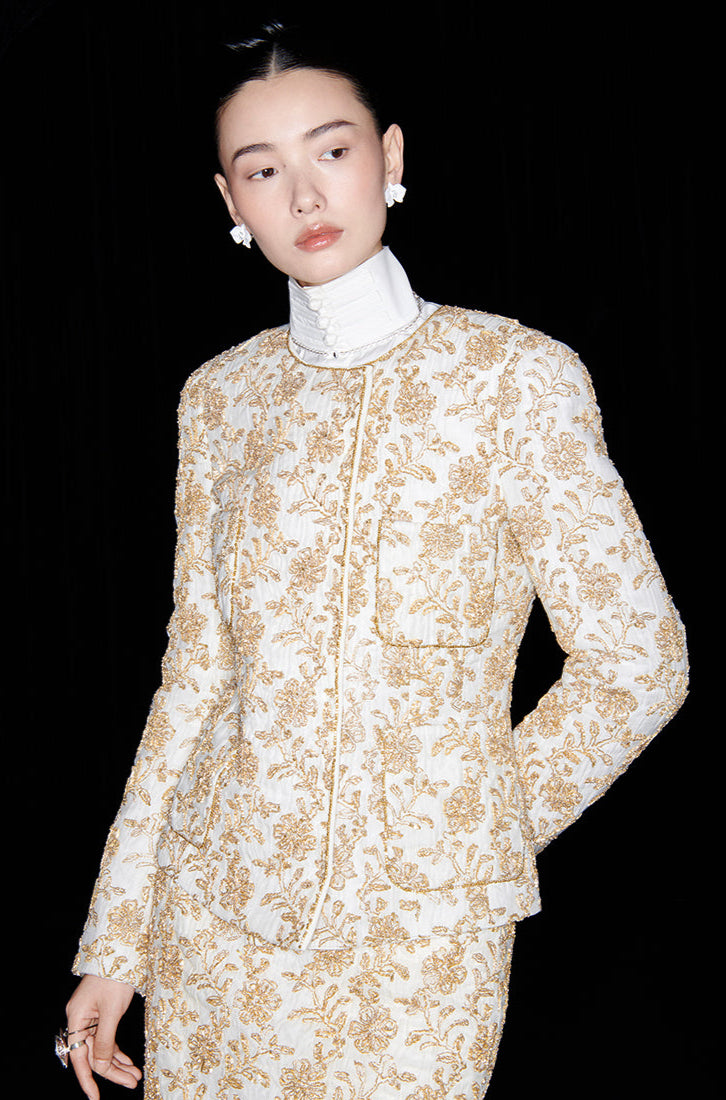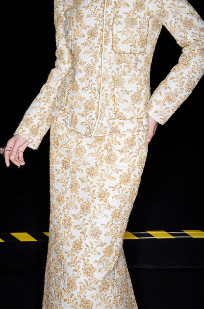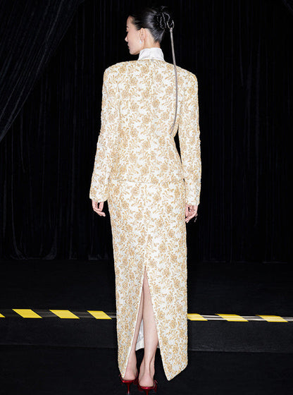 Elevate your style with our M Essential Mackay designer Indian dot brass beaded short coat. Perfect for autumn and winter, this long skirt coat pairs beautifully with a white shirt for a luxurious and elegant look. Its soft color and sophisticated design make it a must-have for any event or official occasion.