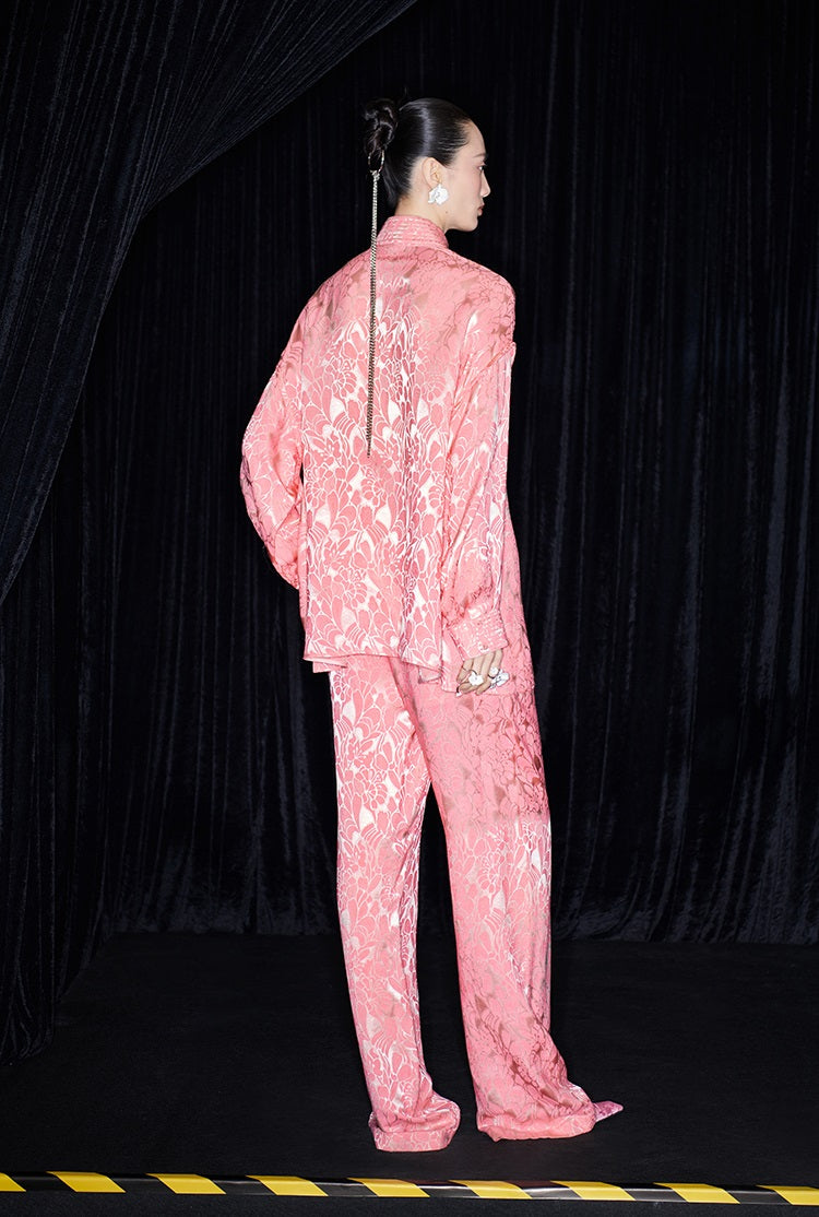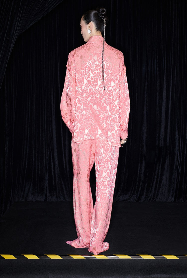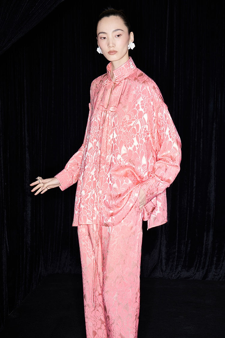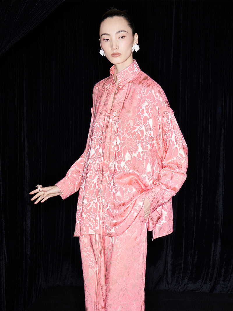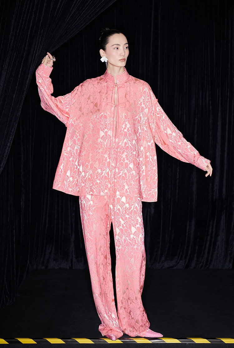 This sophisticated set features a jacquard fabric with a stand-up collar and a loose-fitting silhouette for comfortable elegance. The long-sleeve top includes a stylish cut-out detail on the bust, adding a modern edge to the design. Paired with matching loose long pants in a soft pink hue, this ensemble offers a refined yet relaxed look perfect for contemporary fashion enthusiasts.