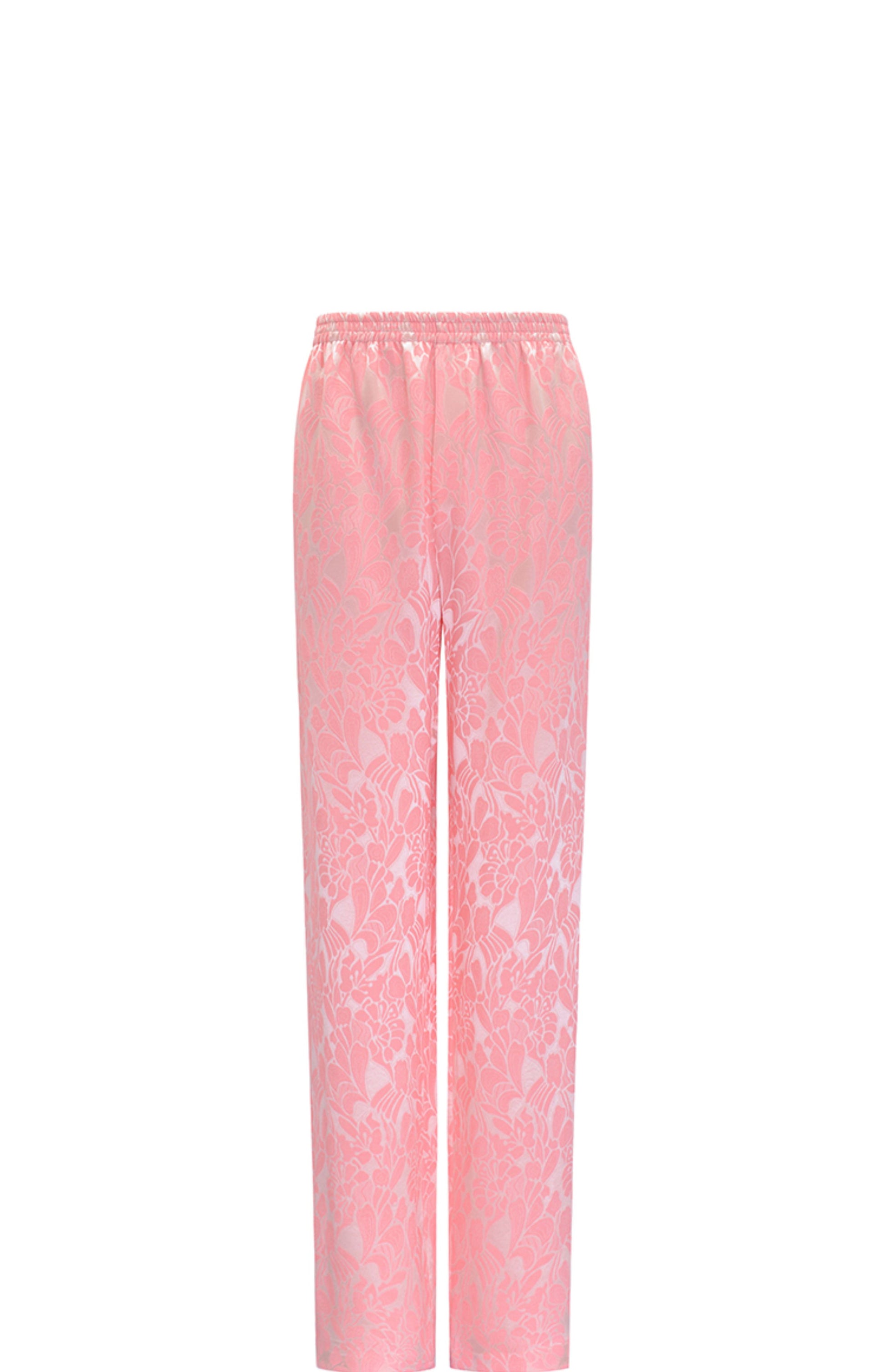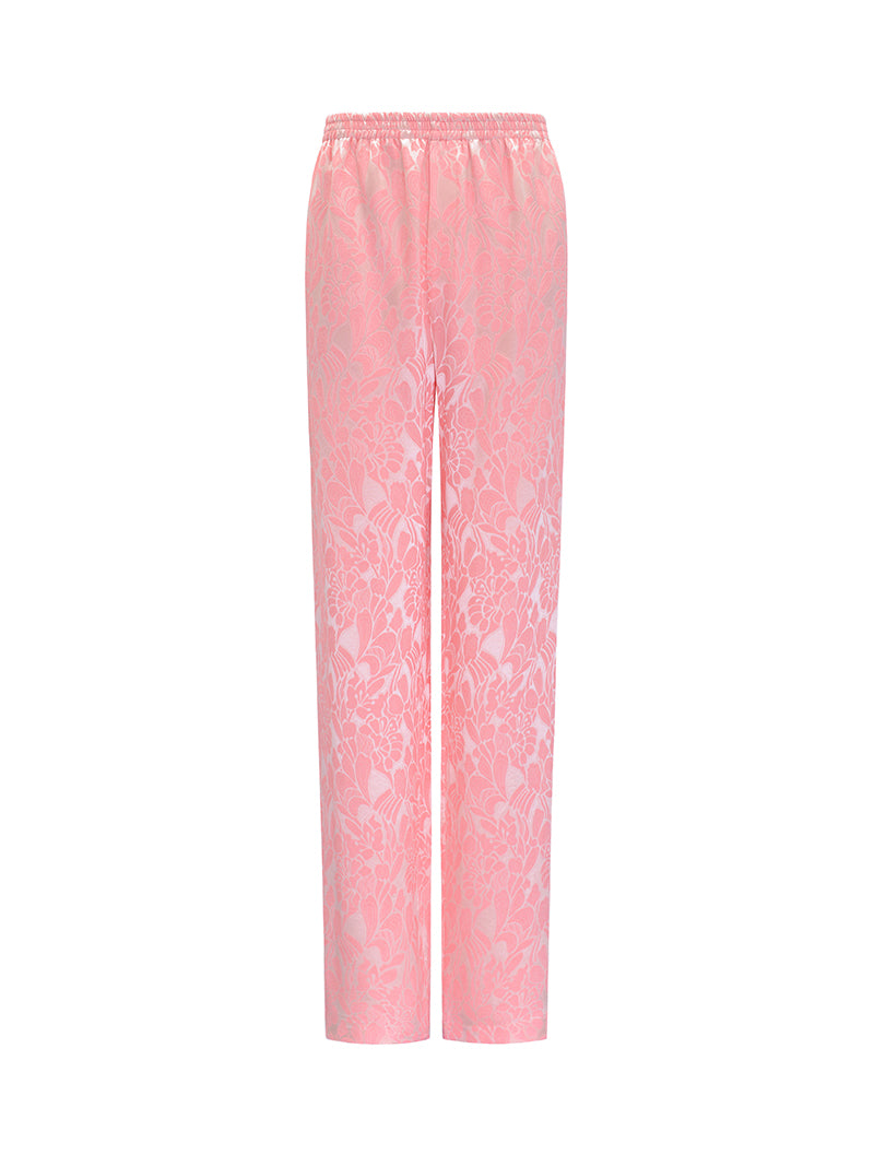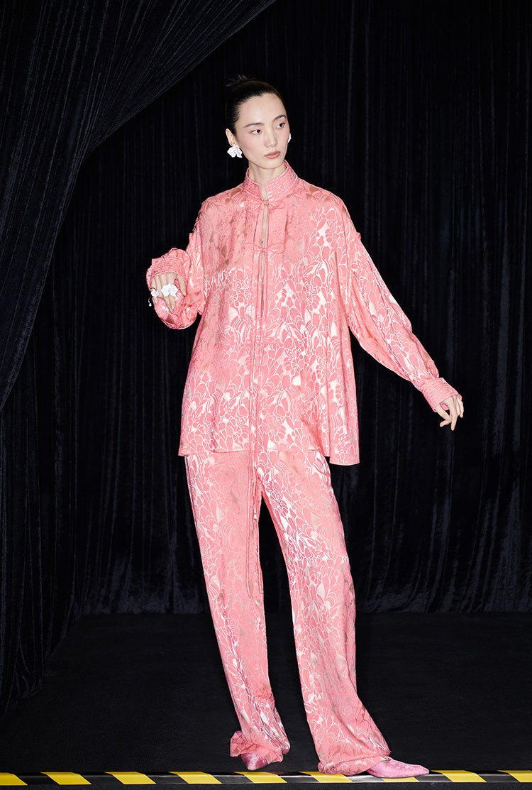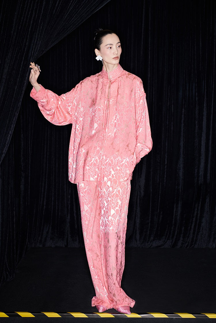 This sophisticated set features a jacquard fabric with a stand-up collar and a loose-fitting silhouette for comfortable elegance. The long-sleeve top includes a stylish cut-out detail on the bust, adding a modern edge to the design. Paired with matching loose long pants in a soft pink hue, this ensemble offers a refined yet relaxed look perfect for contemporary fashion enthusiasts.