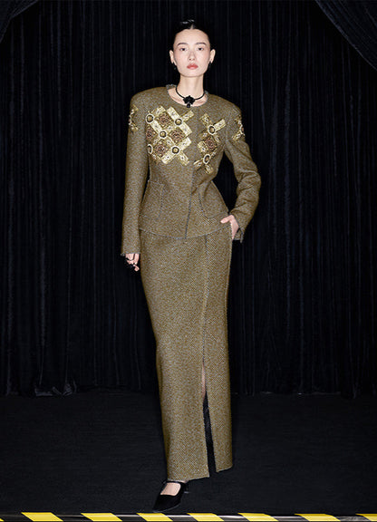 This M essential Mackay designer coat and matching long skirt is perfect for autumn and winter events. The stylish mosaic tile beaded design adds a touch of elegance while keeping you warm. Don't sacrifice style for warmth this season.