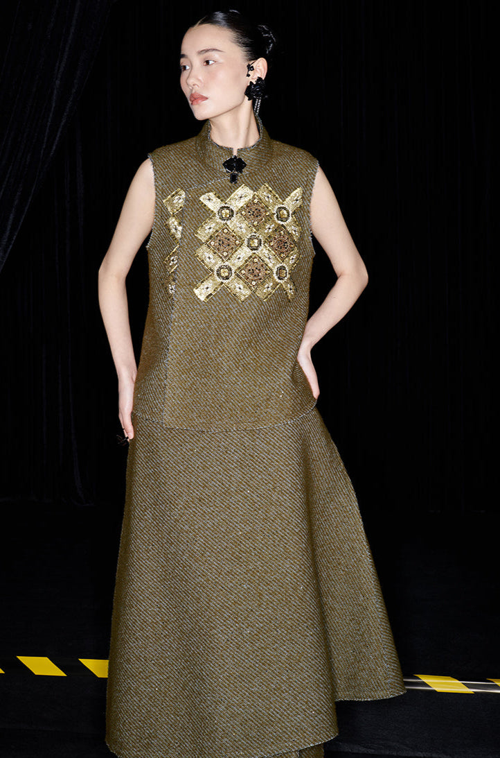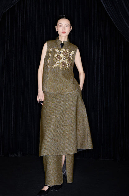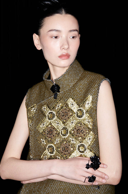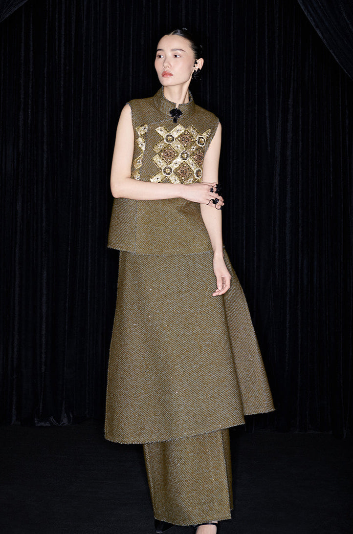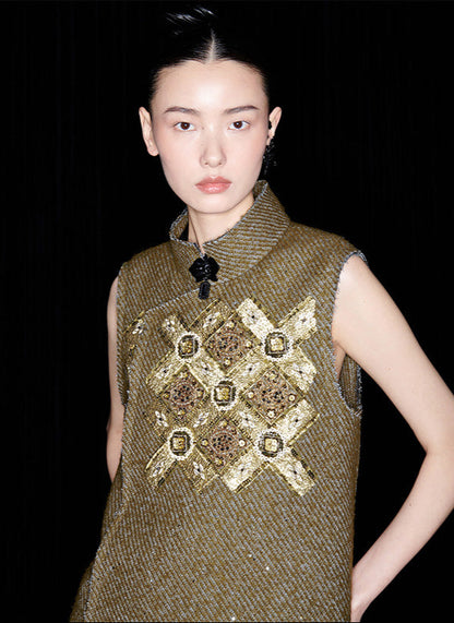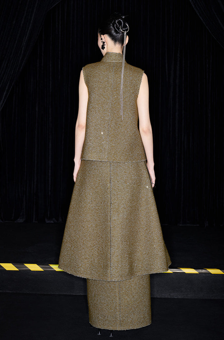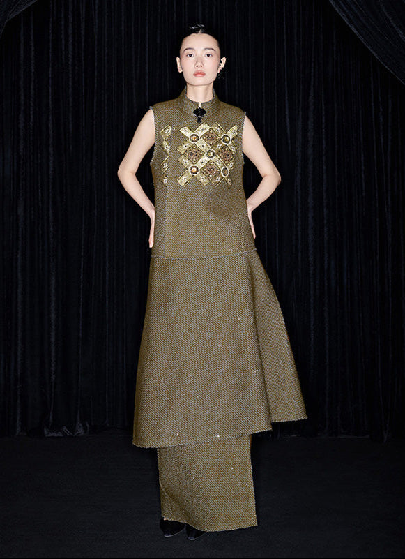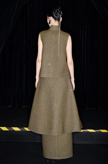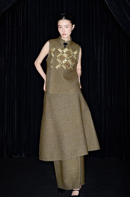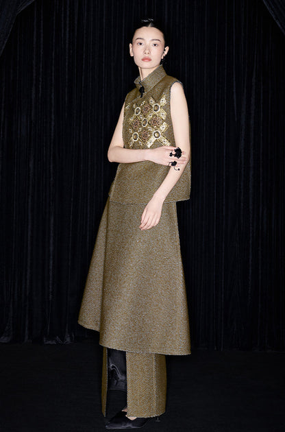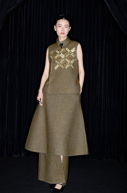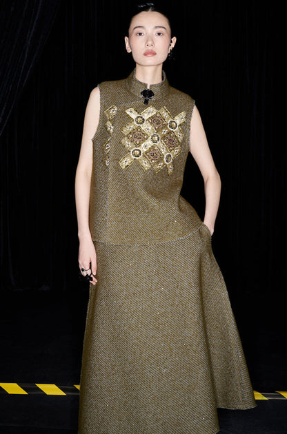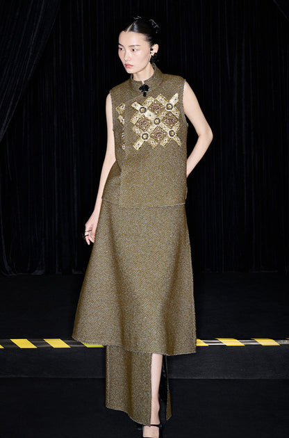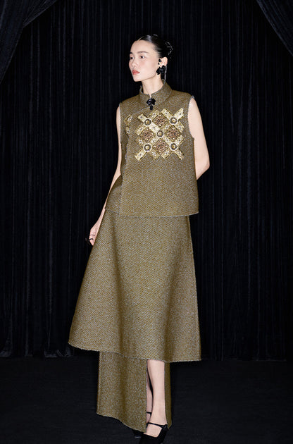 This essential Mosaic Tile Beaded Gilet by Mackay is perfect for autumn and winter events. Its versatile design includes a matching A-line skirt and long skirt, giving you multiple options for any occasion. The stylish, classy, and chic brown vest will make you stand out at any event.