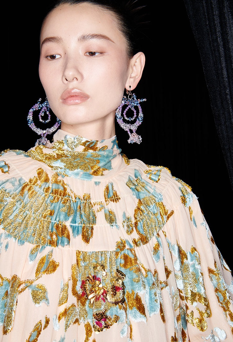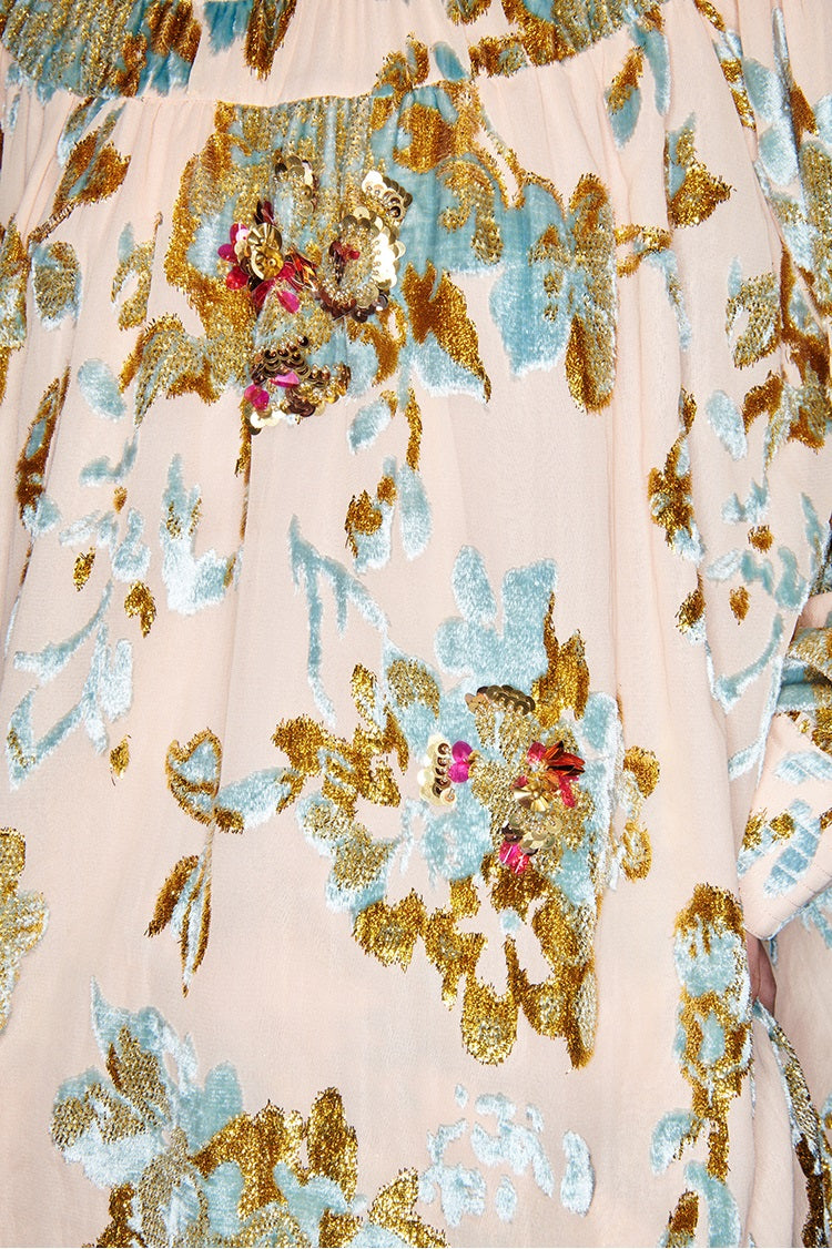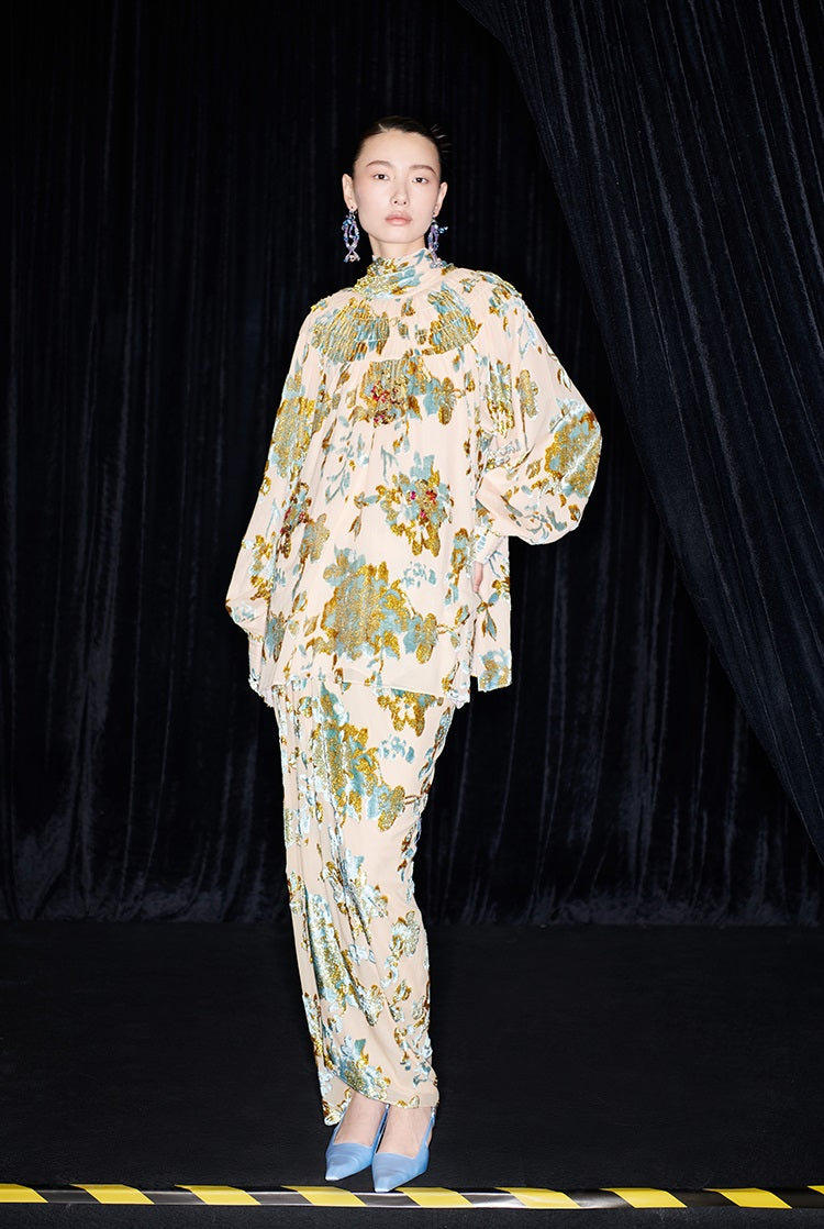 M essential Mackay designer Qili burnt floral velvet dense pleated lace-up loose top - PETER.