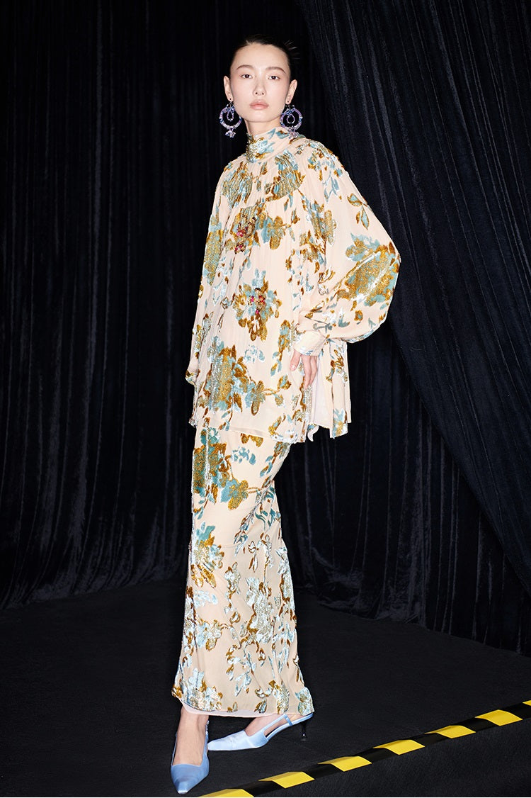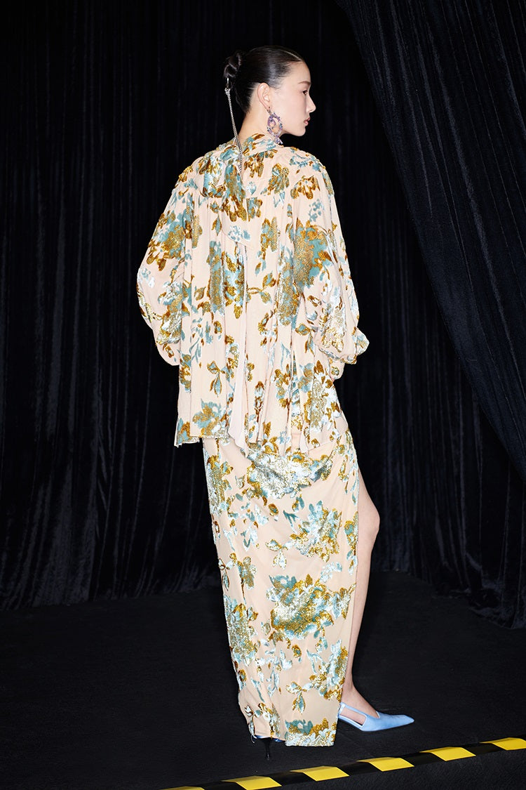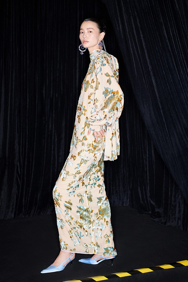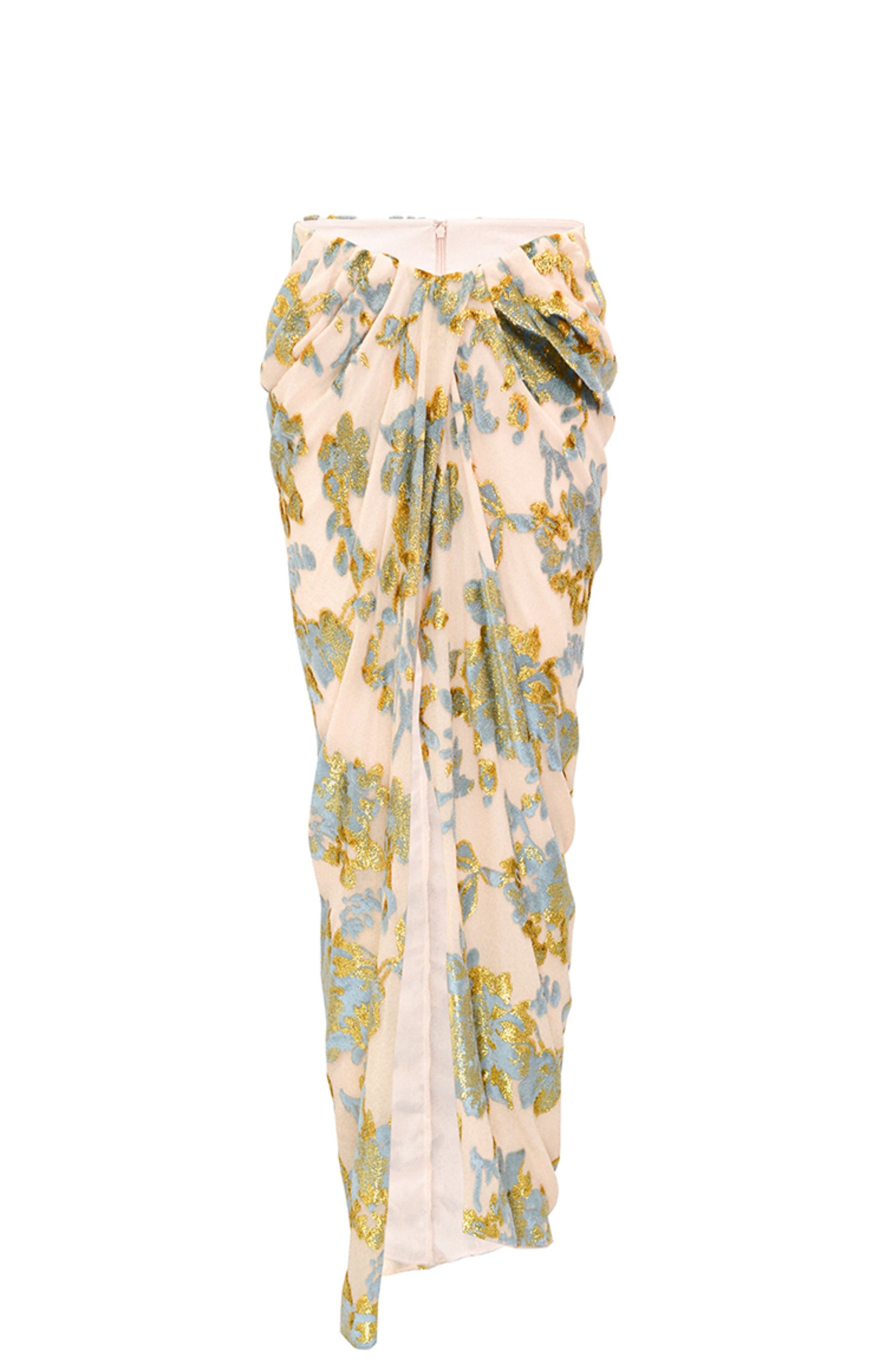 This M essential Mackay designer ensemble features a burnt floral velvet top with dense pleating and a lace-up detail, offering a loose, comfortable fit with long sleeves. Paired with a long skirt that includes a dramatic side slit, this set combines textured elegance and fluid movement for a sophisticated, contemporary look.