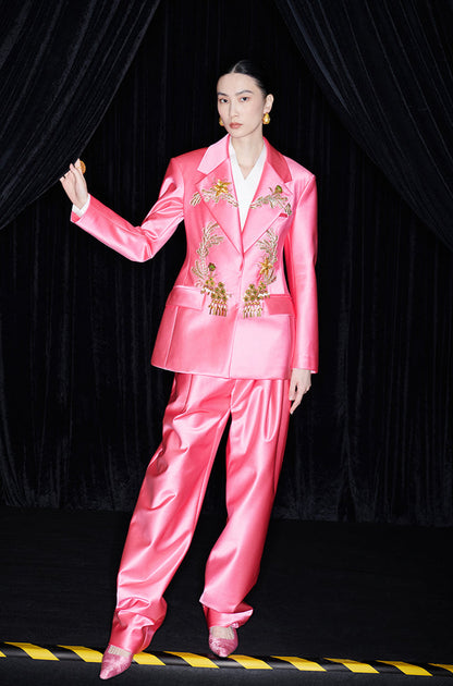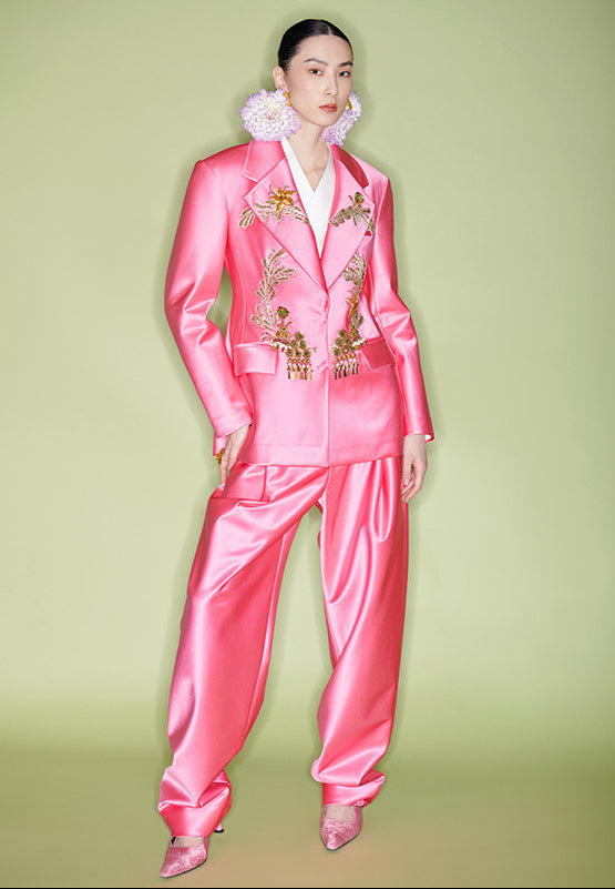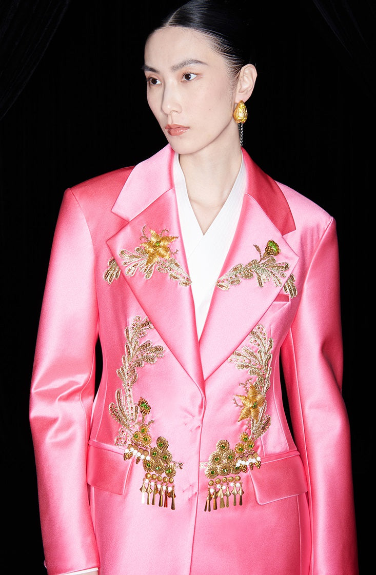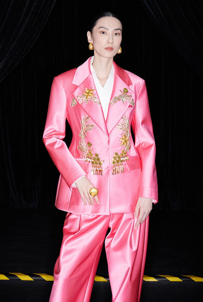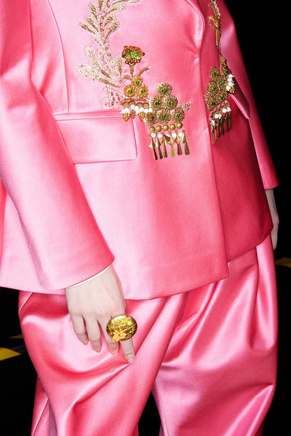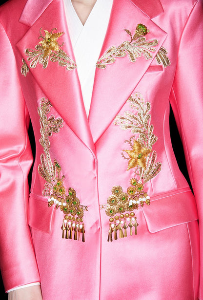 Elevate your style with M essential Mackay's designer Rose Jersey workshop Spanish metallic embroidery suit. Made with classy features, this suit adds sophistication to any occasion. Perfect for formal events or professional settings, this suit will surely make a statement. Upgrade your wardrobe with this elegant piece.