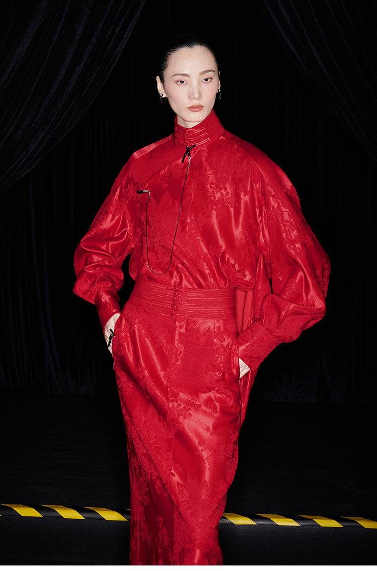 M essential Mackay designer Sand Red Jacquard silhouette shirt skirt suit set- Minoe.