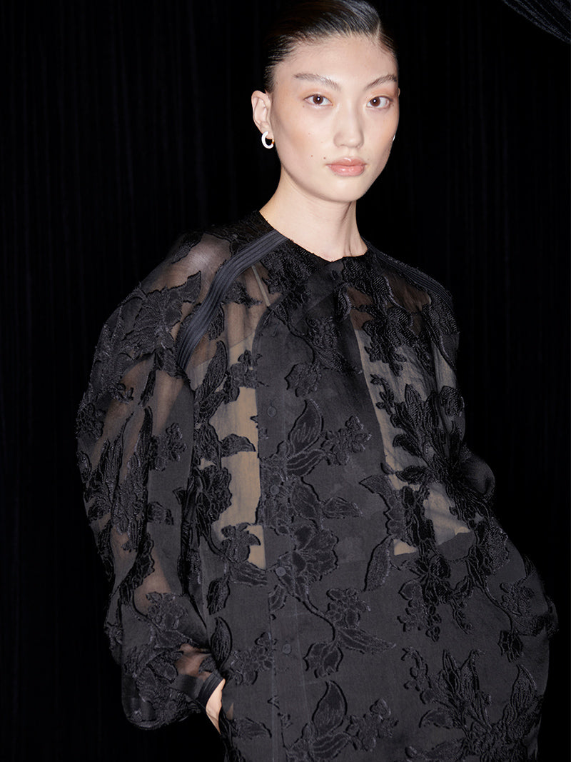 M essential Mackay designer slashed silk-cut semi-sheer lace pant top - indigo.