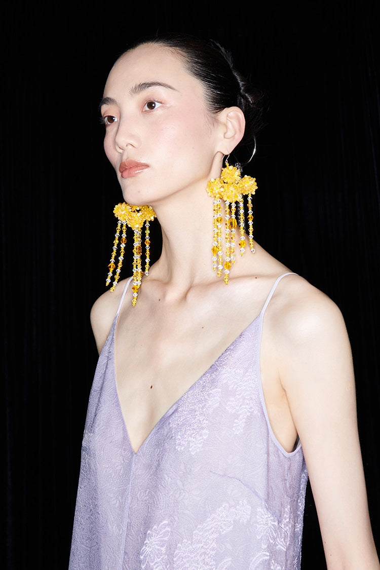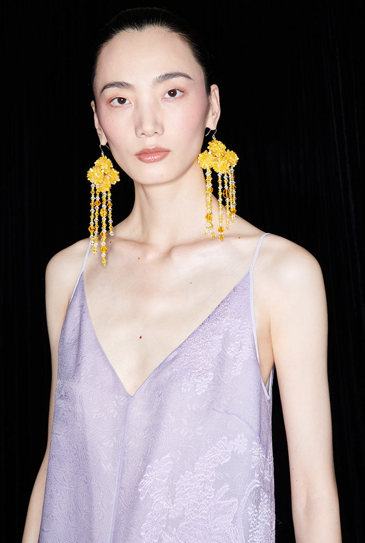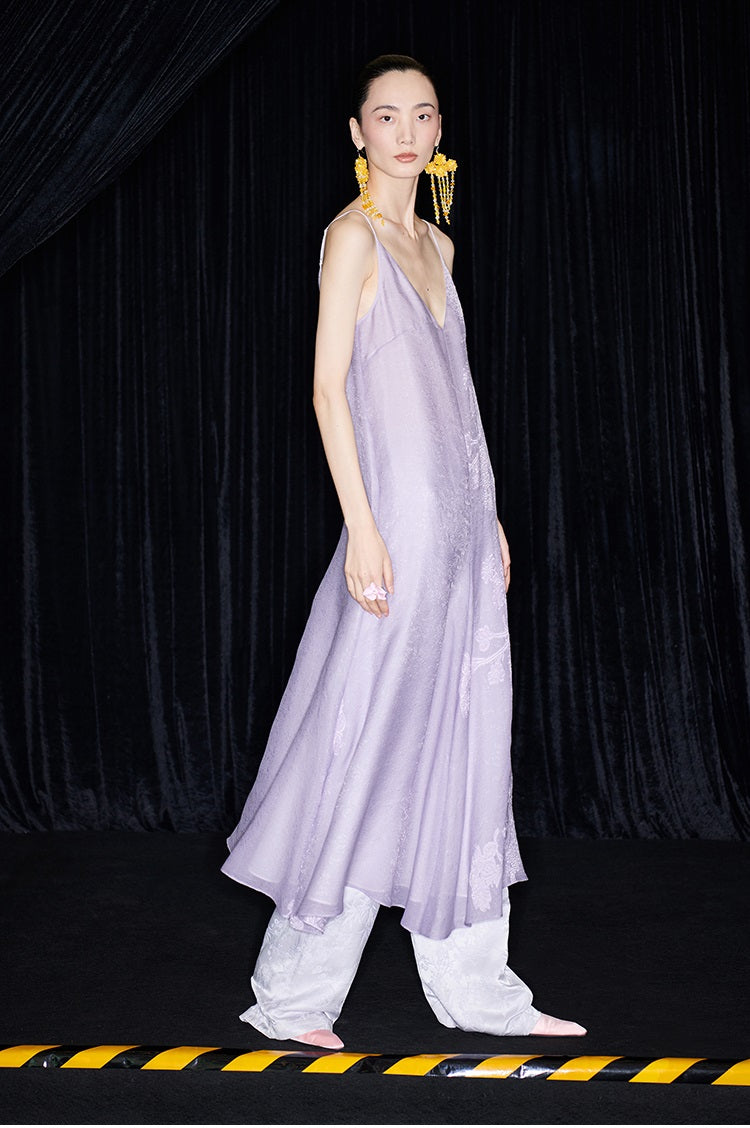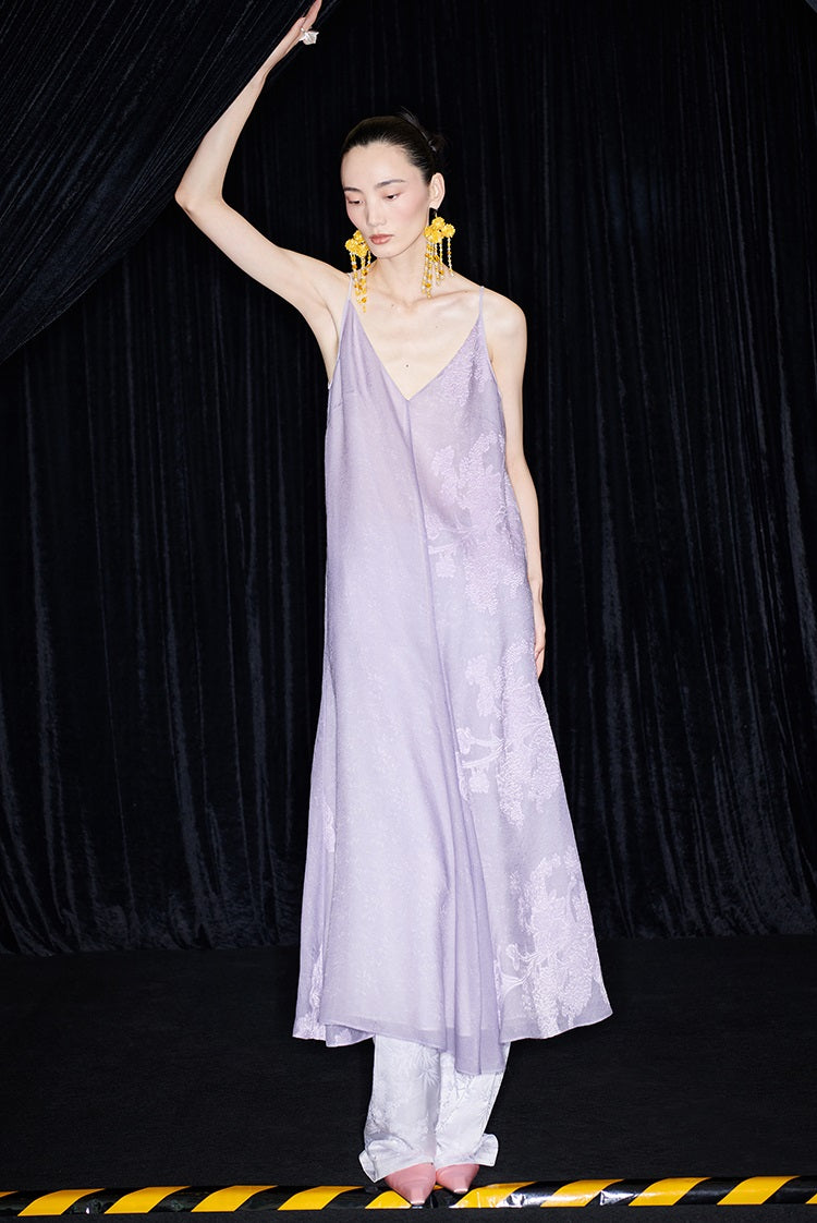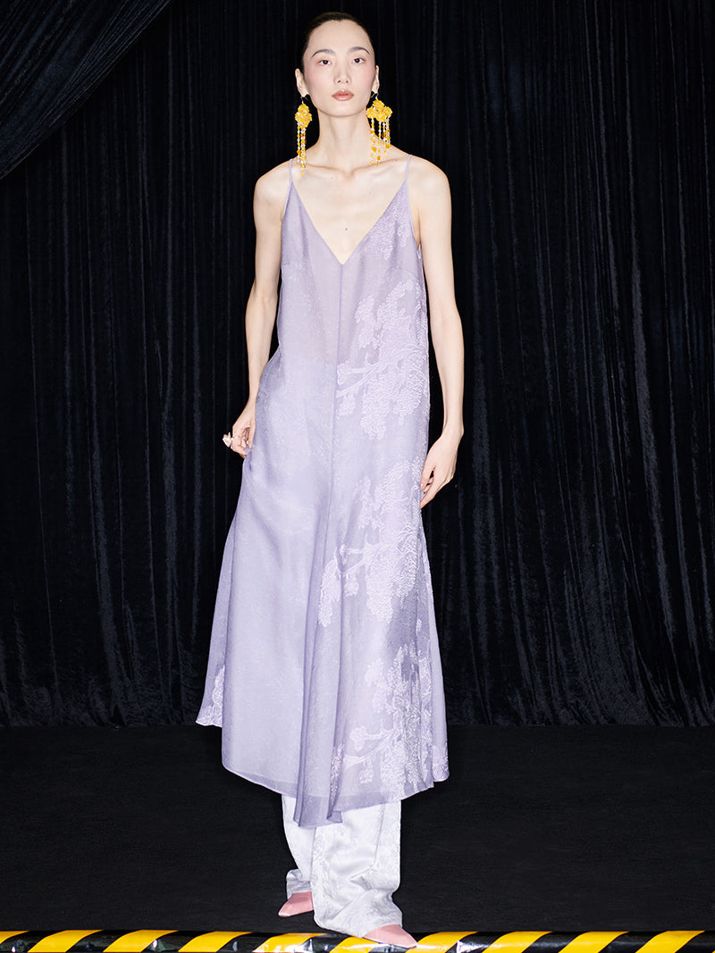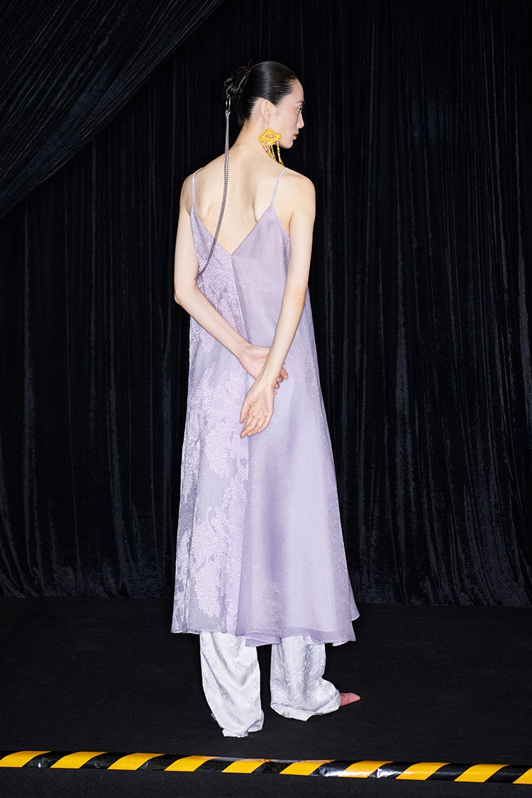 The M Essential Mackay Designer Taro Jacquard Silhouette Placket Shirt - JESSY expertly layers a long sleeve purple shirt with a round neck over a delicate spaghetti strap dress featuring a v-neckline. This combination creates a refined, textured look with the jacquard fabric enhancing visual depth. The long dress length adds elegance, making it an ideal choice for sophisticated styling that balances structured tailoring with soft, feminine details.