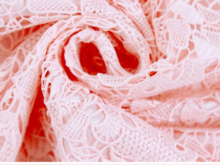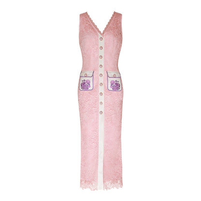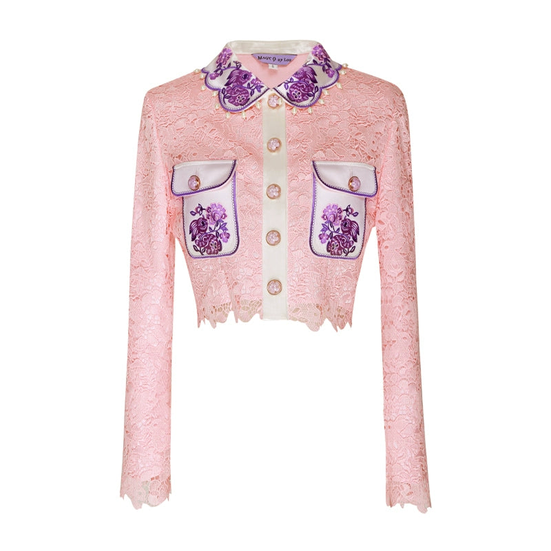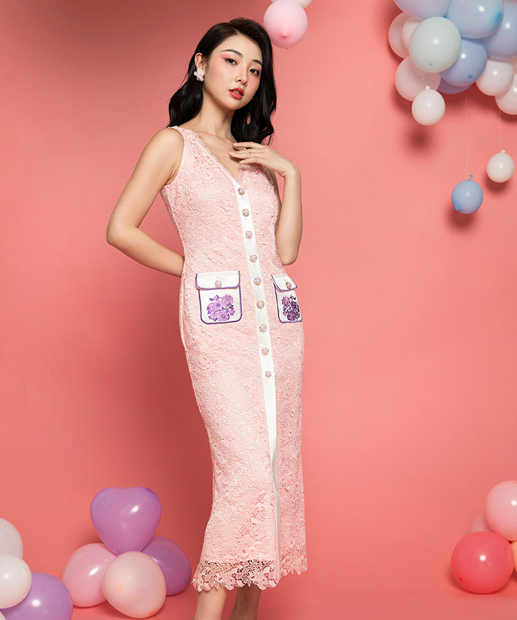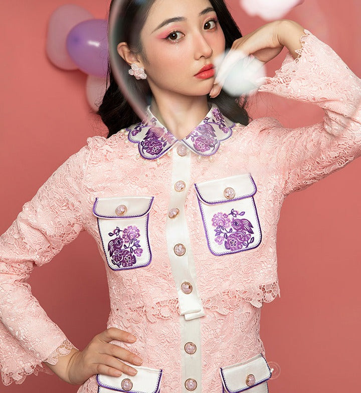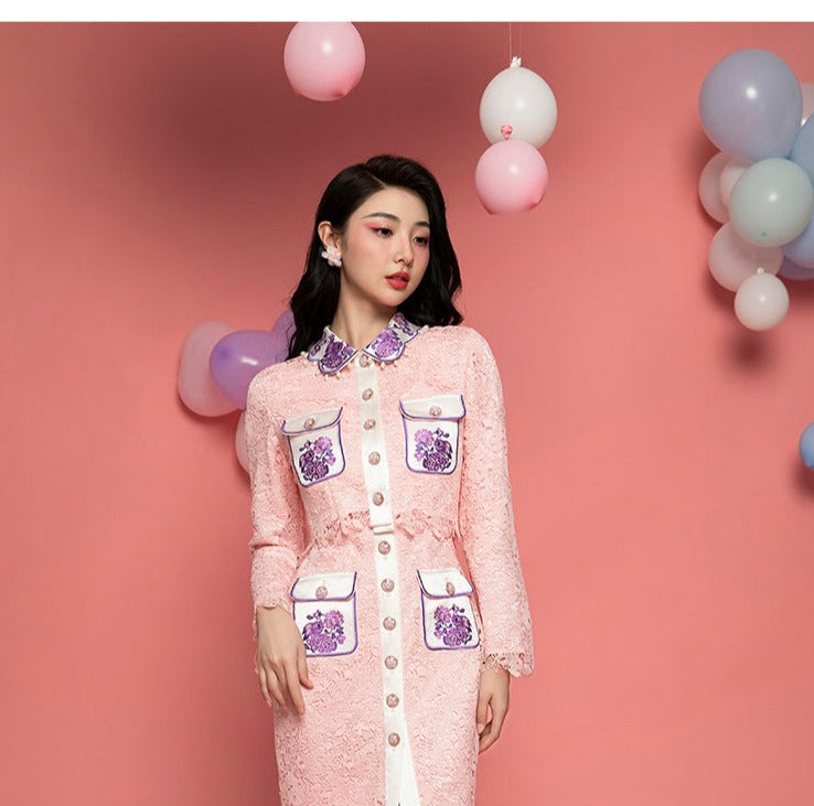 Magic Q pink rose embroidered pocket embellished lapel sleeveless lace dress jacket