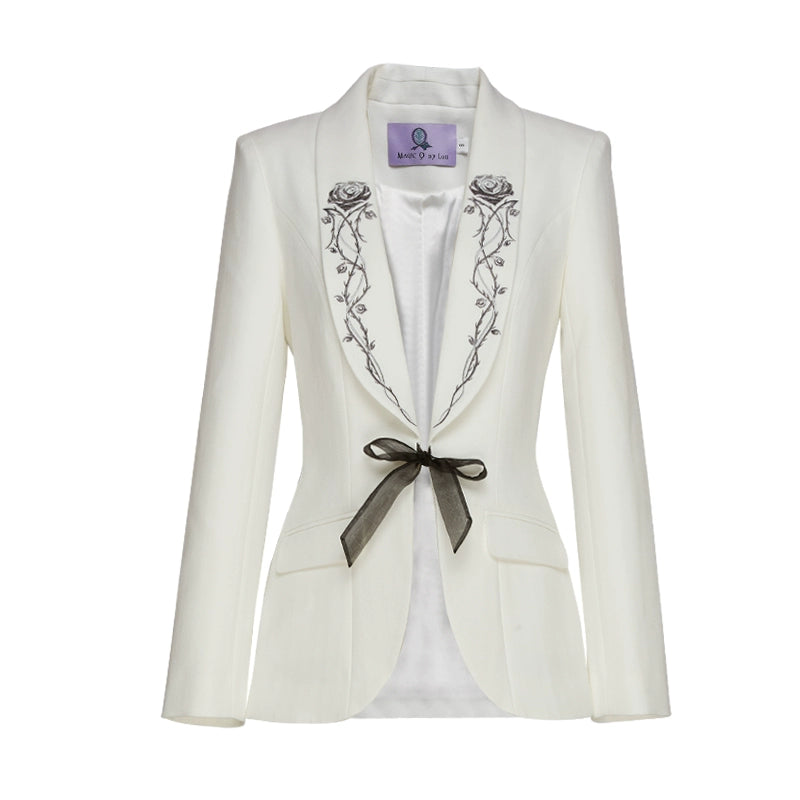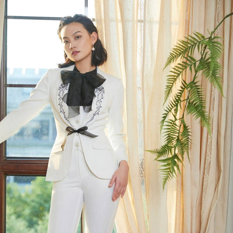Adorn yourself in the exquisite MagicQ white color-block rose embroidered collar, bow tie, suit, horse clip, and wide-leg pants for a dashing, gorgeous, and chic look this fall. Uniquely stylish and fashionable, this versatile fashion suit will add an exquisite touch to your autumn wardrobe.