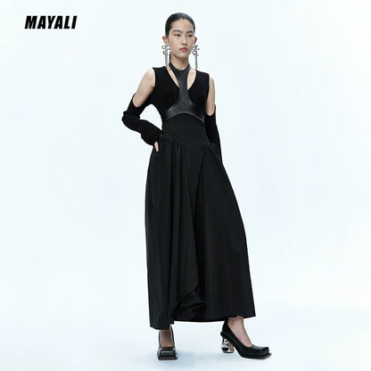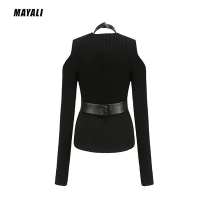 MAYALI 22AW Fall/Winter V-neck, off-the-shoulder halterneck knit top, slim long-sleeved original personality niche