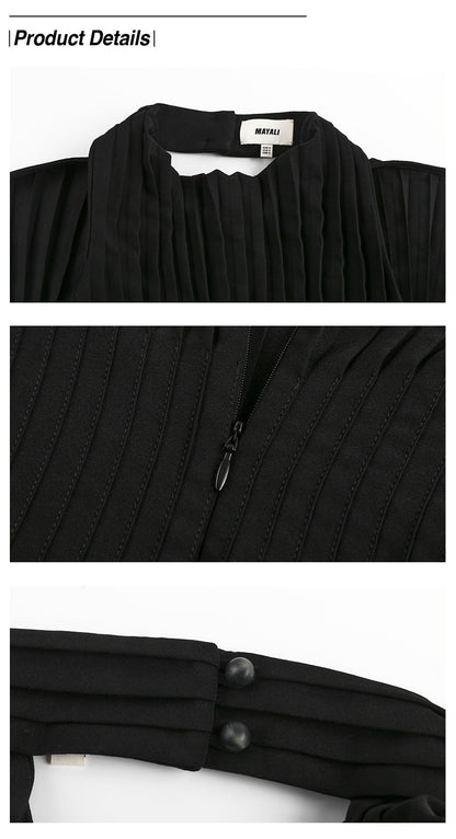 Introducing the MAYALI FALL/WINTER DRESS: a chic three-dimensional off-the-shoulder statement piece designed to capture the essence of luxurious seasonal elegance. With its fashionable waist-pressed pleats and glamorous mid-length open-back design, this light luxury niche piece will elevate your look with effortless sophistication.