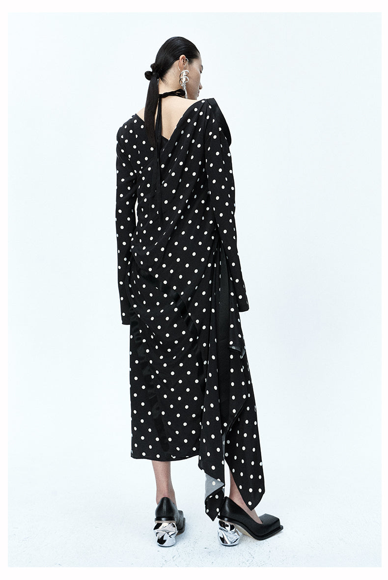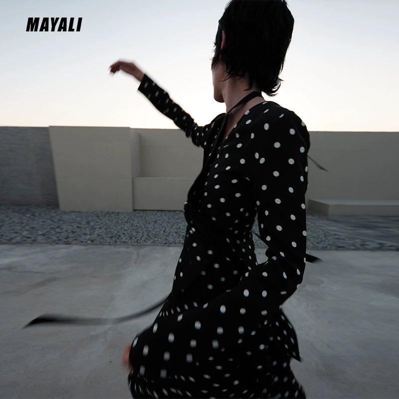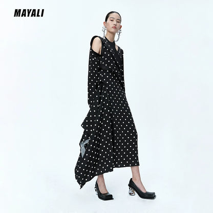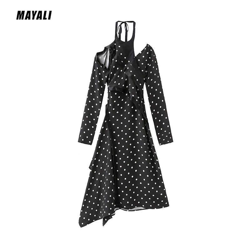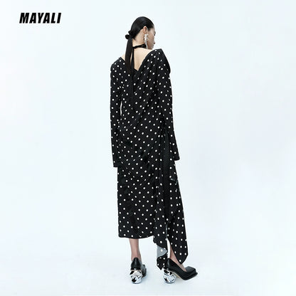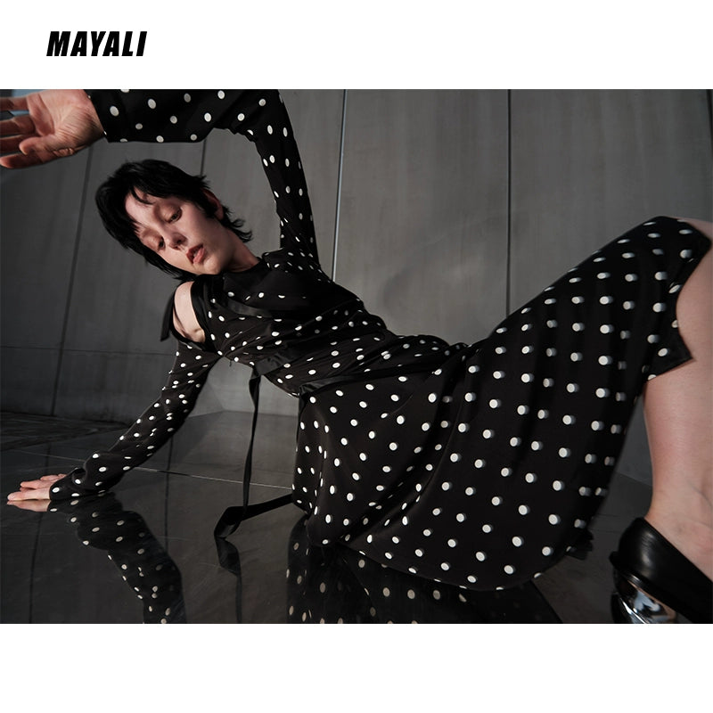 MAYALI Fall/Winter ribbon Asymmetric Off-the-Shoulder Long-sleeved Midi Polka-dot Dress - Daailo
