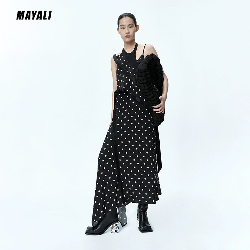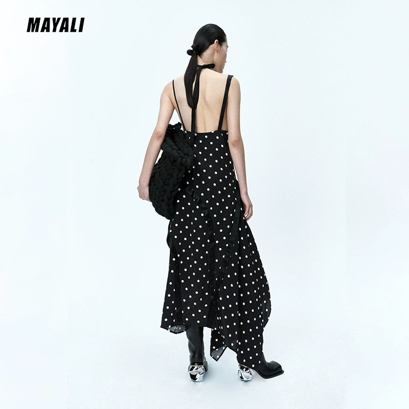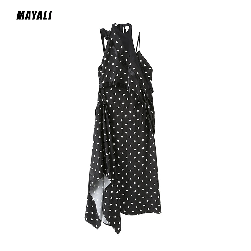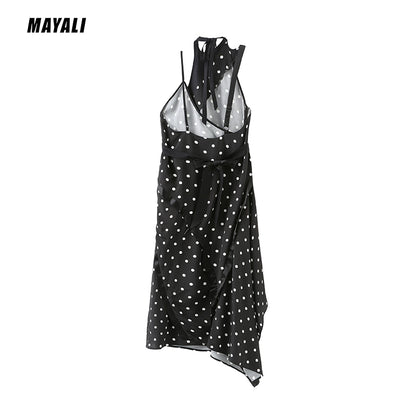 MAYALI Fall/Winter Ribbon Wraps Asymmetric Black Polka Dot Sleeveless Slip Dress - Miillie