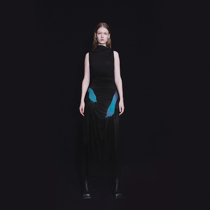 Created with a luxurious blend of blue and black tones, MAYALI's latent print designer midi dress is cut to a sleeveless silhouette with an alluring backless finish. Subtly rumpled to give a relaxed look, this elegant and feminine piece is finished with glamourous, dashing, and stunning details that will make a chic and sophisticated statement in any fall/autumn wardrobe.