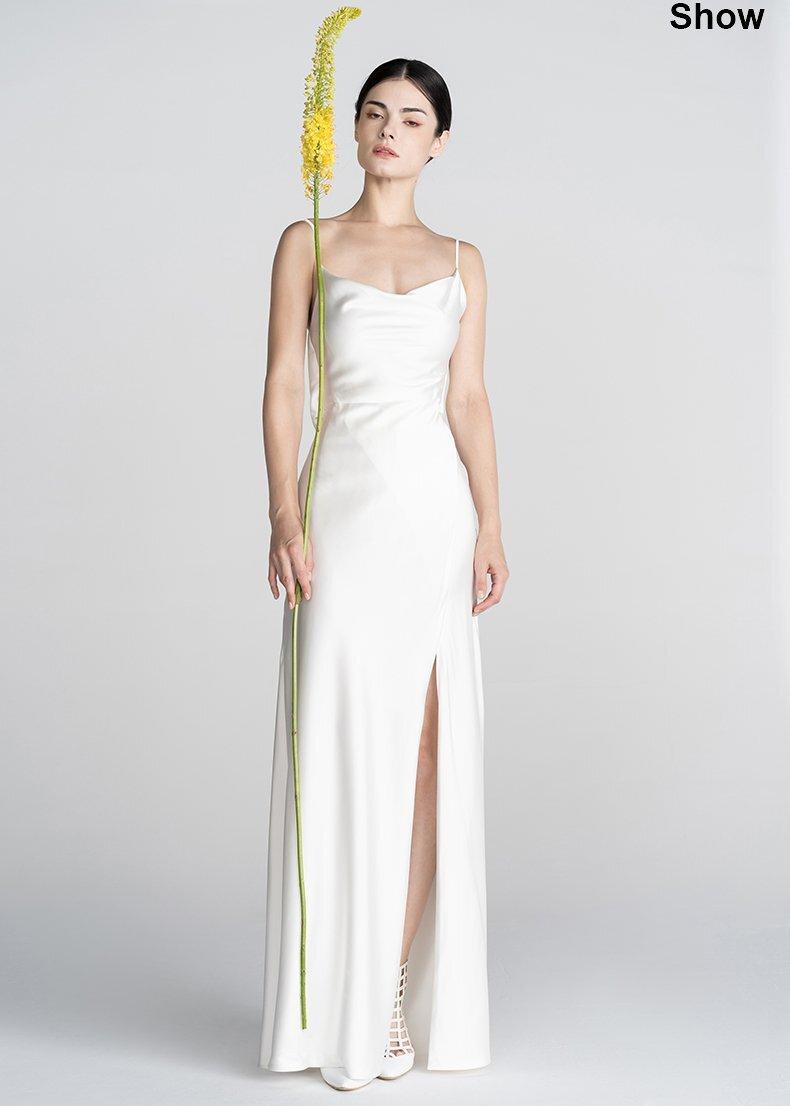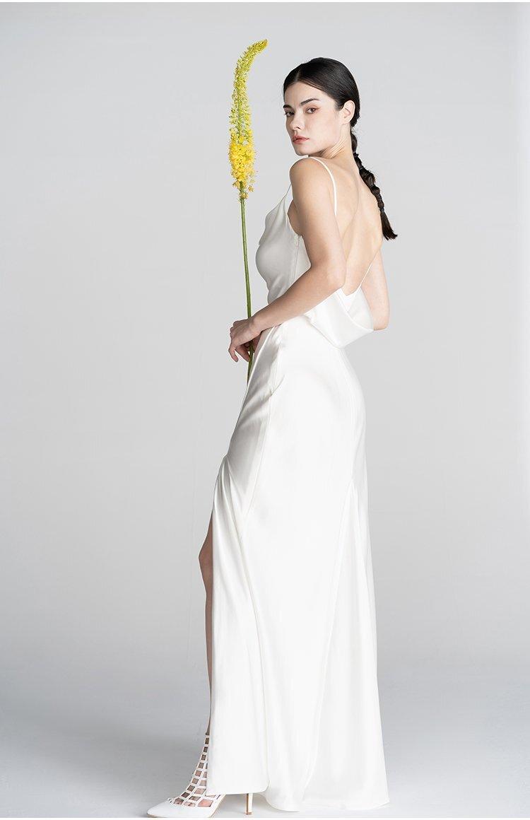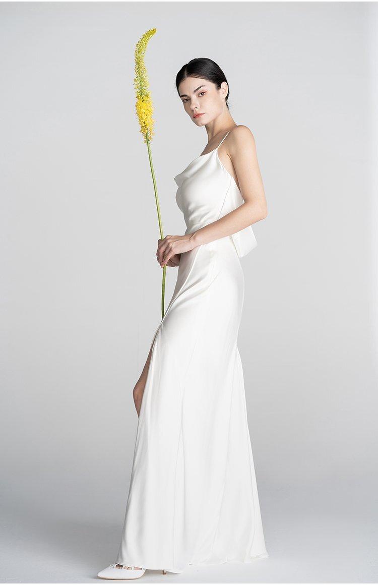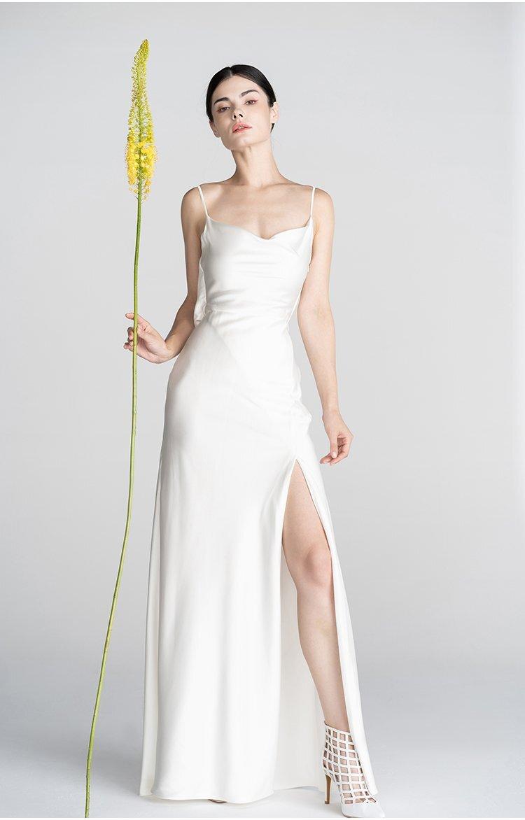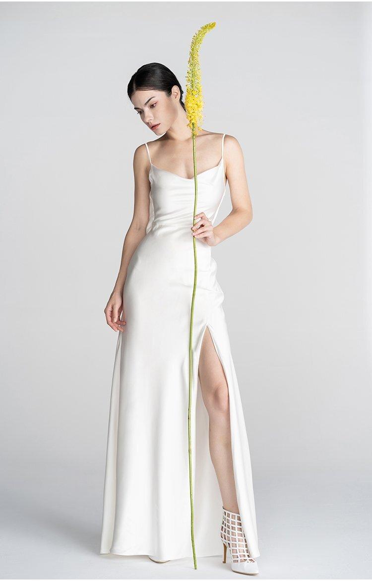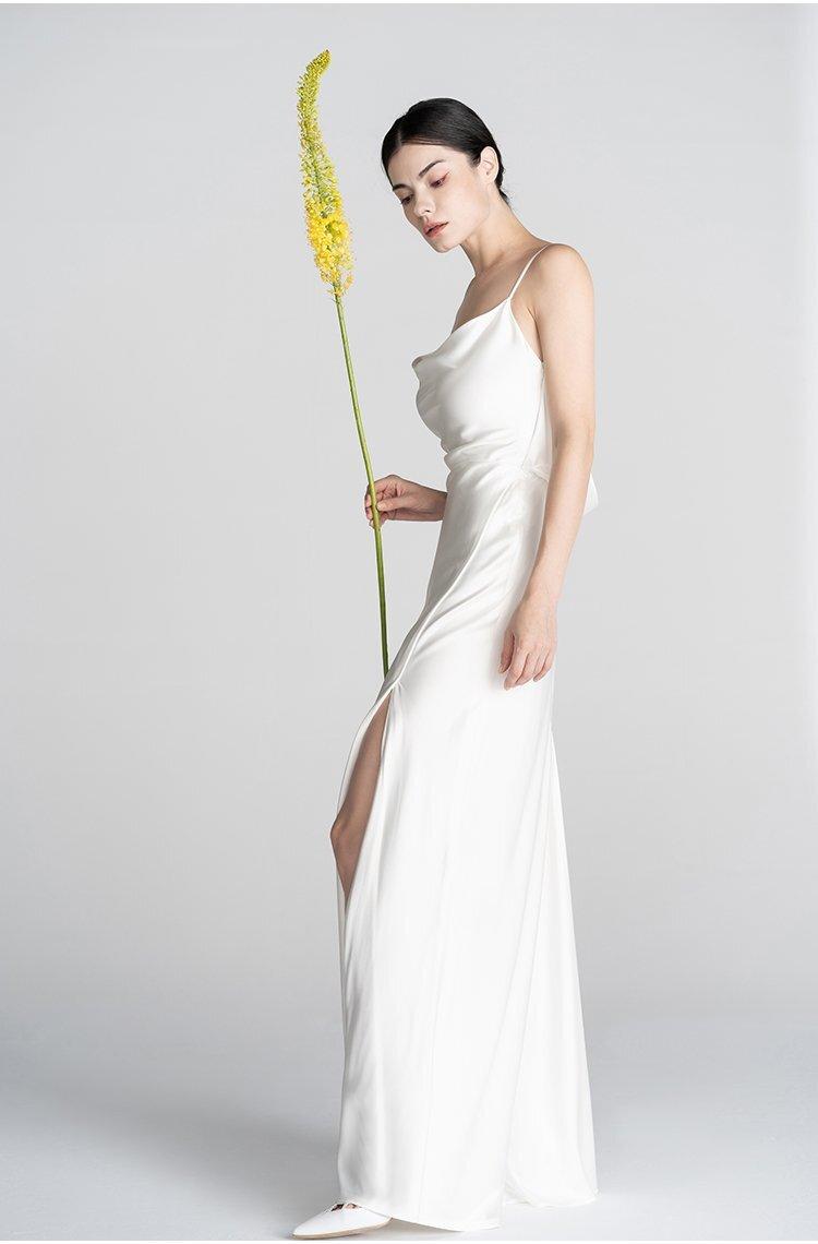 Minimalist classical French Elegant simple slip slit long wedding Bridal Dress - Bomi