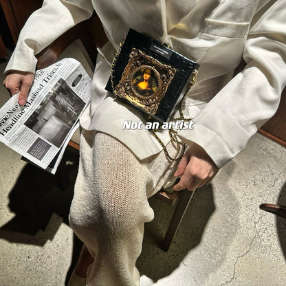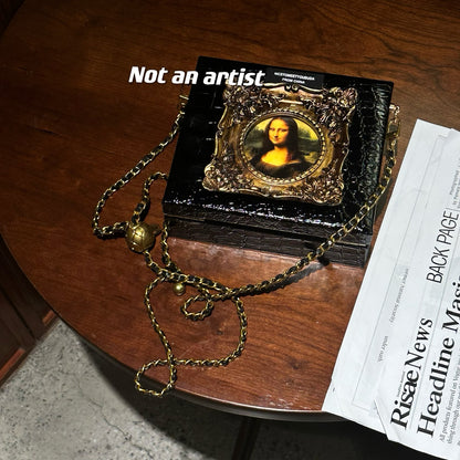 Expertly crafted with an elegant baroque embossed design, the NOT AN ARTIST frame bag is a must-have for sophisticated fashion lovers. Featuring a stunning Mona Lisa print, this bag is both stylish and functional, perfect for any occasion. Add a touch of art to your wardrobe with this exquisite bag.
