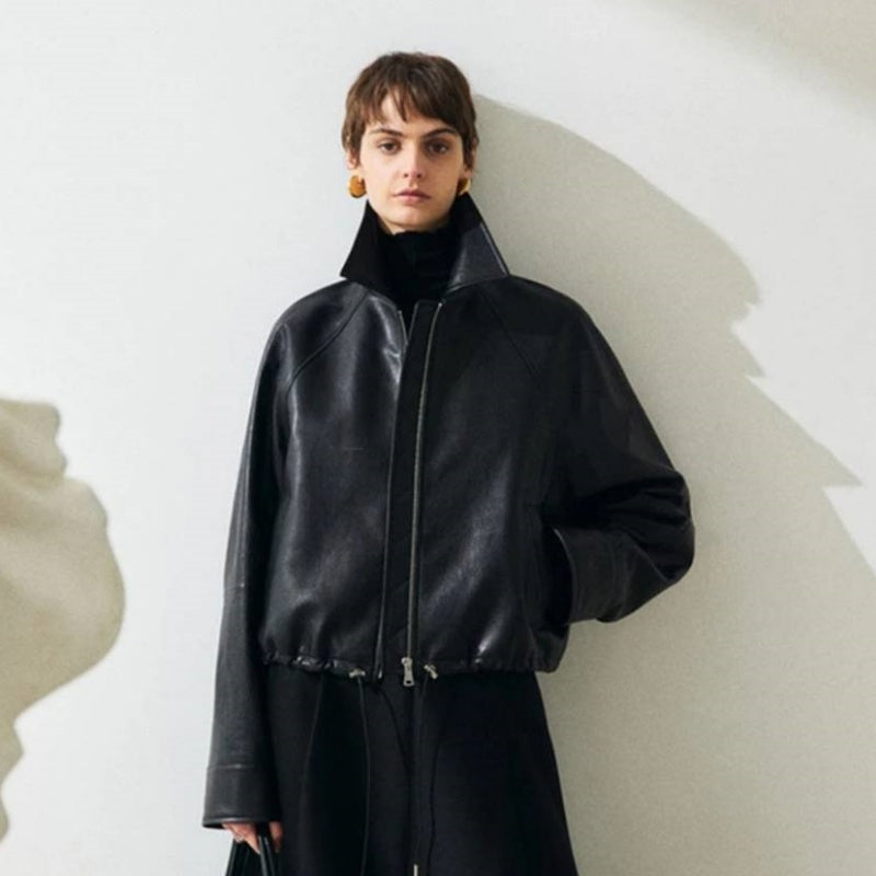 PIAOIN Small lapels short motorcycle leather jacket hem trimmed spring-DAX.