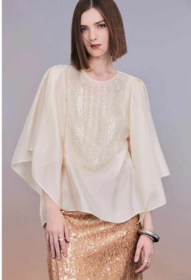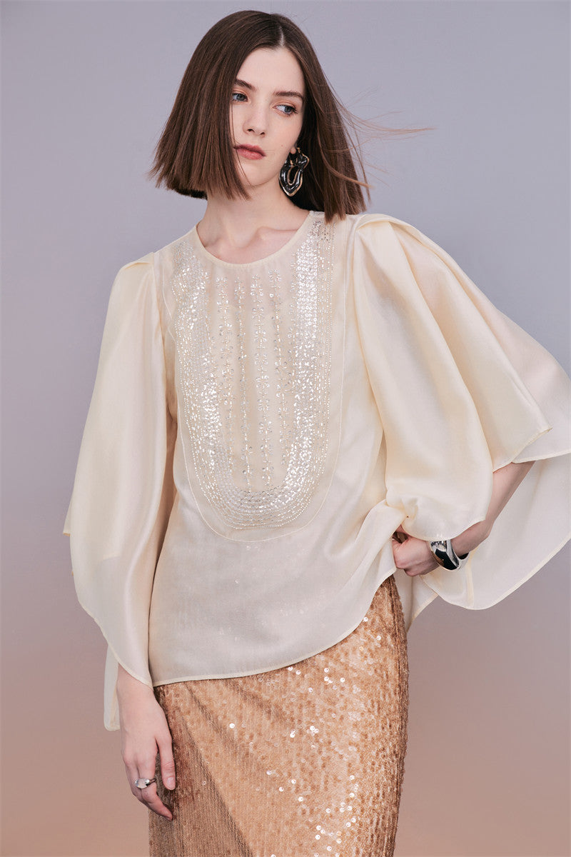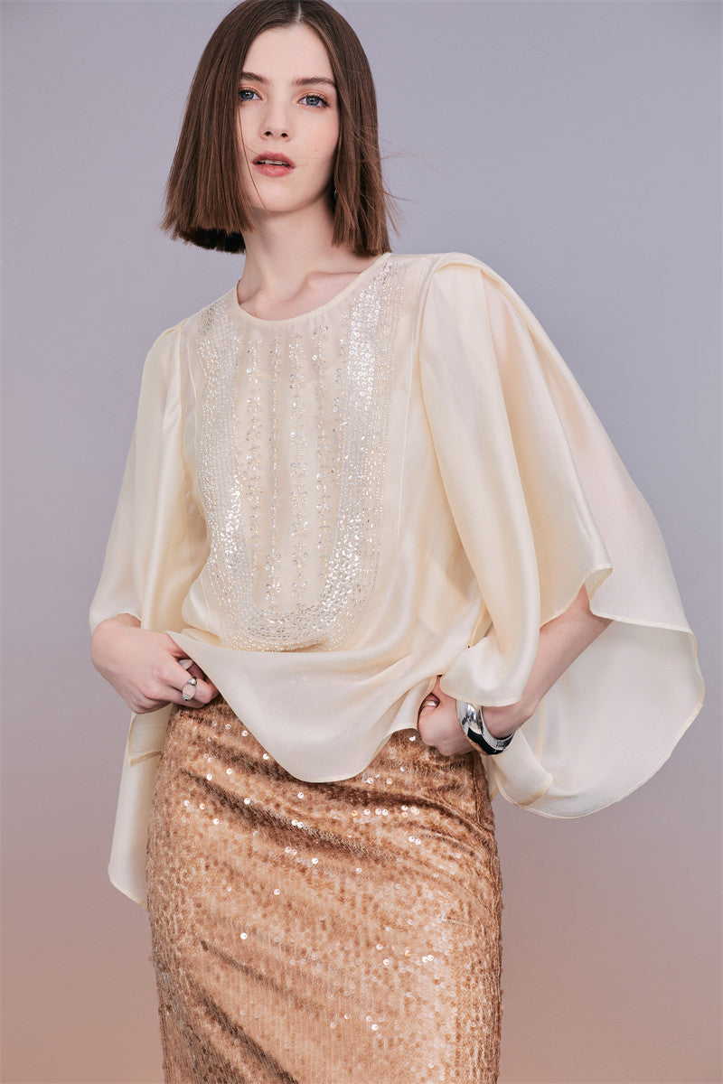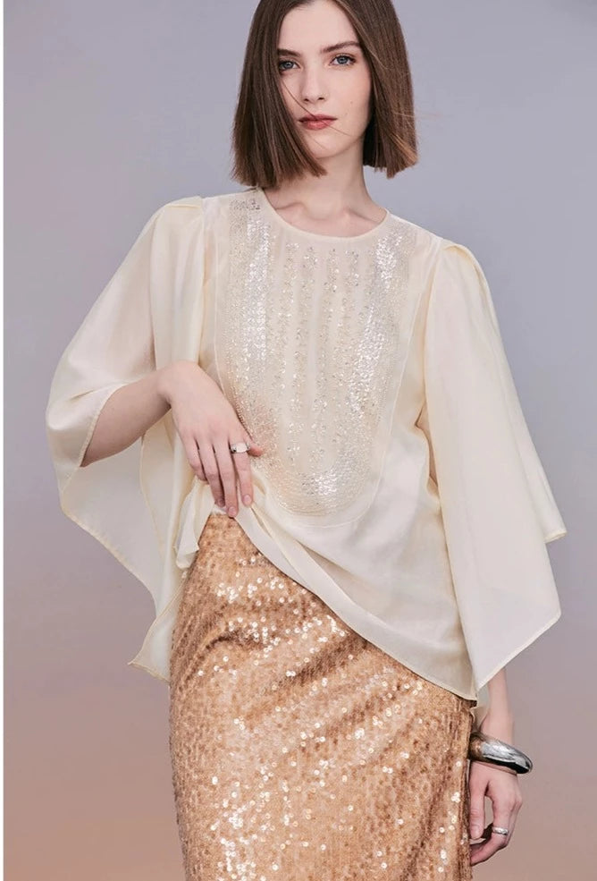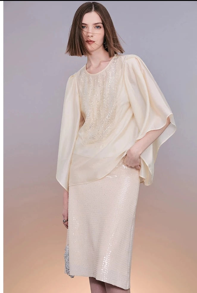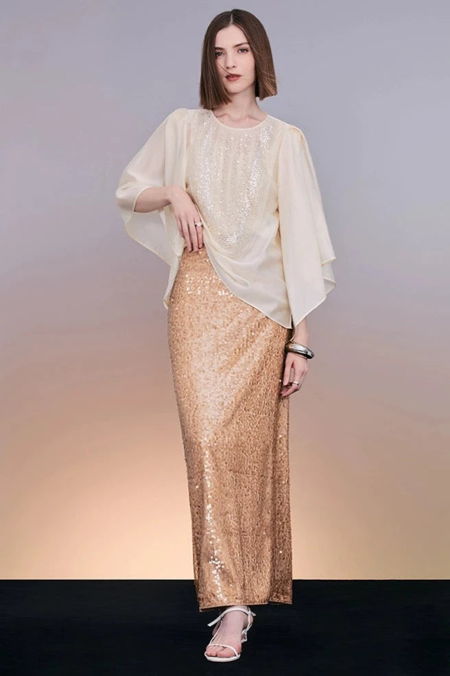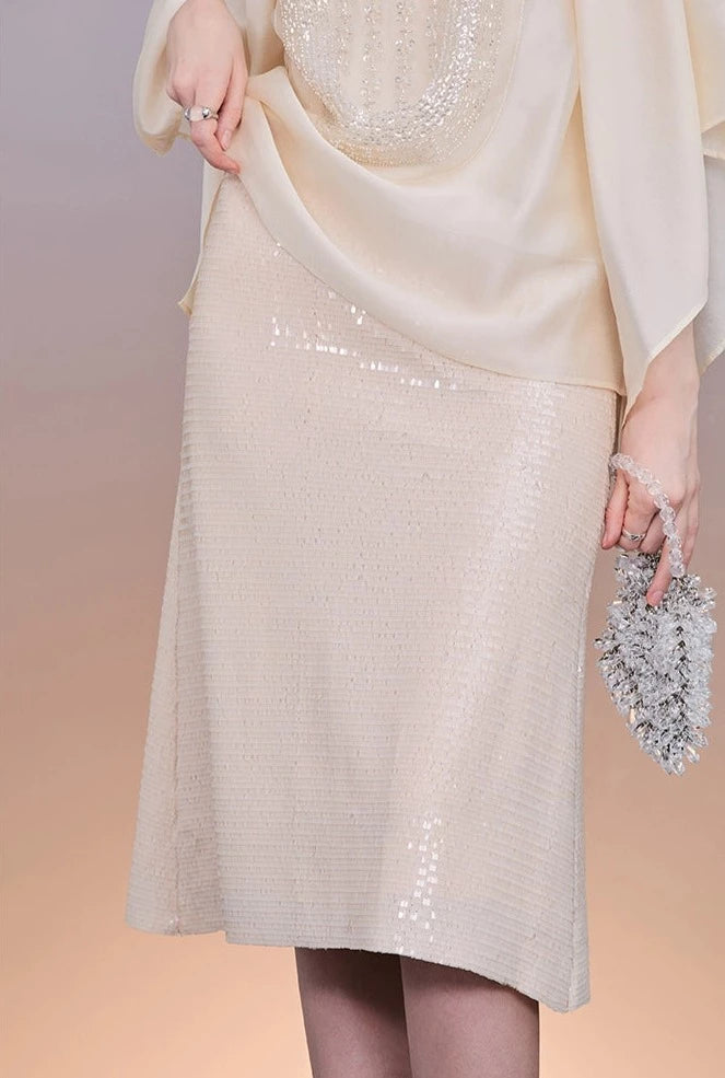 PURITY Elegant beaded top sleek sequin straight skirt- Sisal