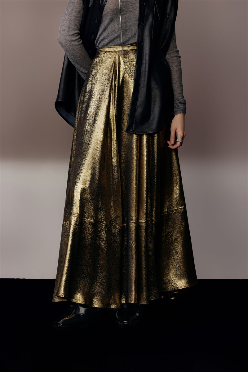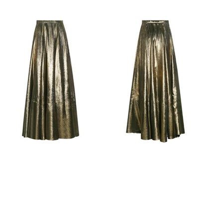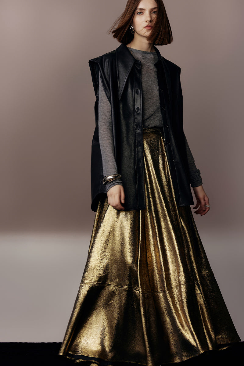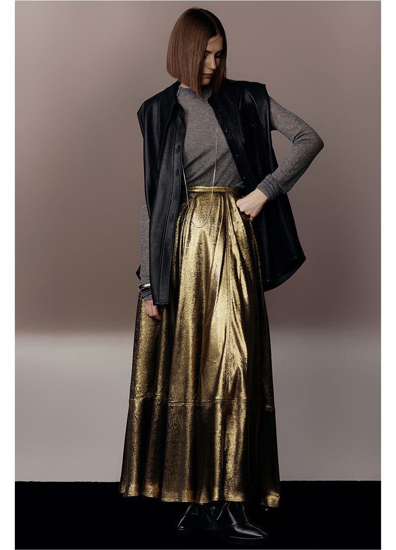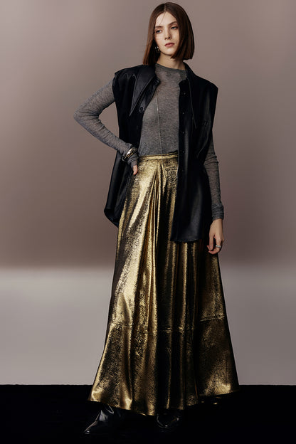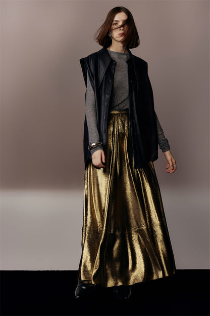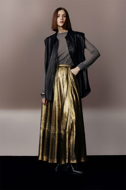 PURITY lacquered metallic gold A-line skirt silhouette leather vest- Celeste
