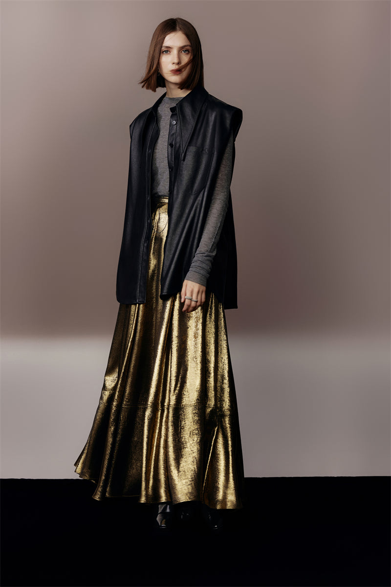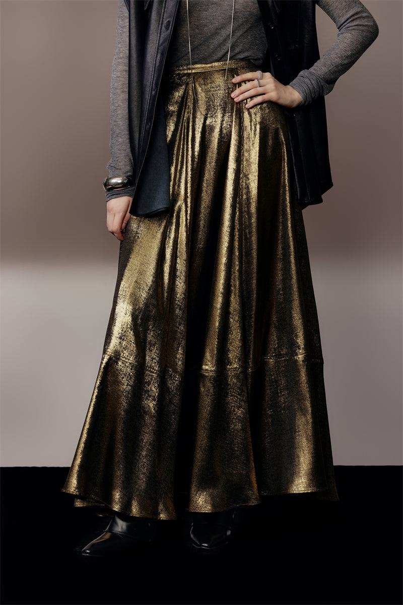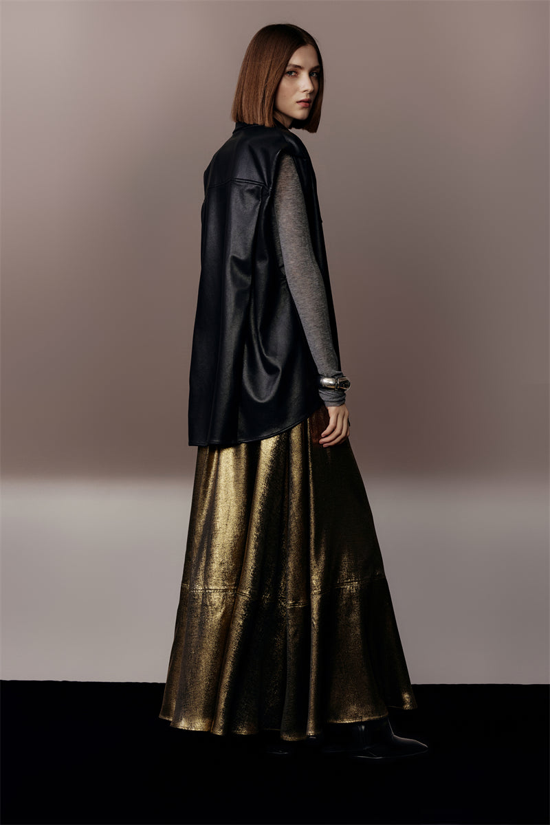 PURITY lacquered metallic gold A-line skirt silhouette leather vest- Celeste